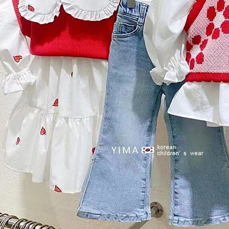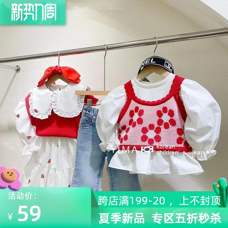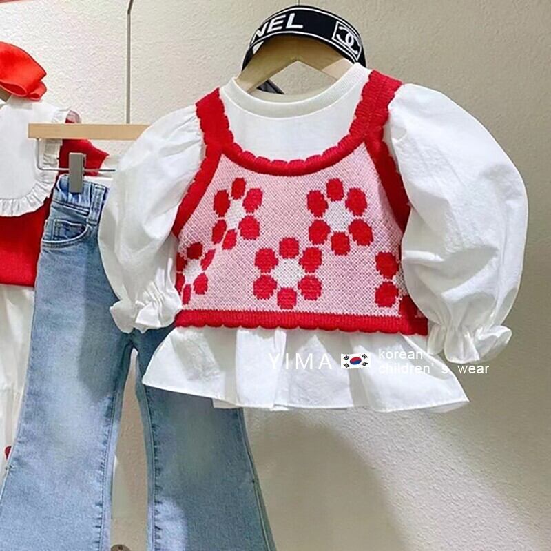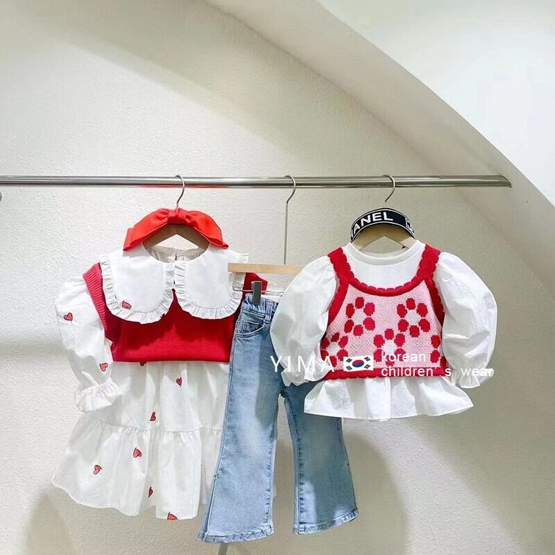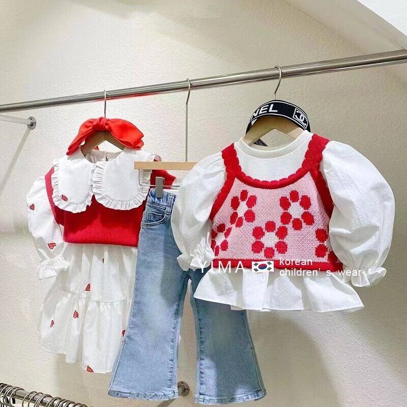 色:白のシャツ,ブルージーンズ,ピンクの花のキャミソール,赤いノースリーブニットタンクトップ