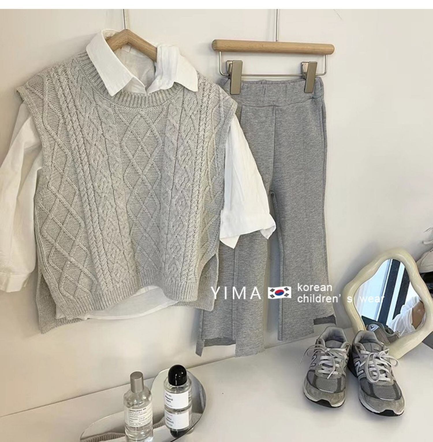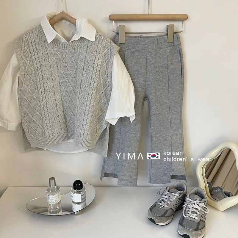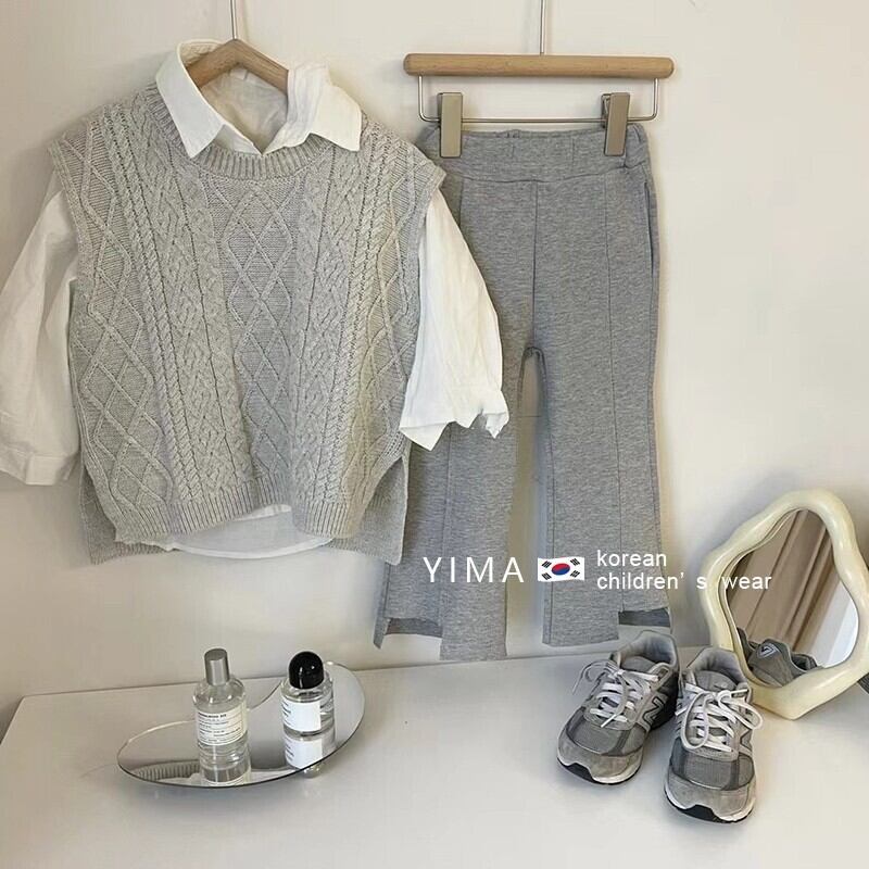色:グレーニットベスト,白のシャツ,グレーパンツ