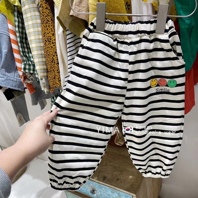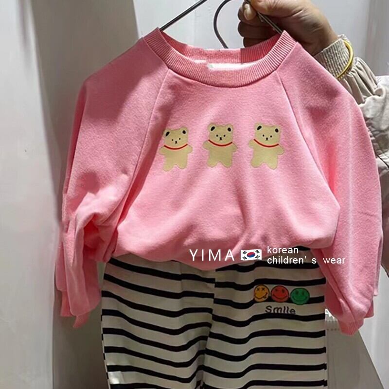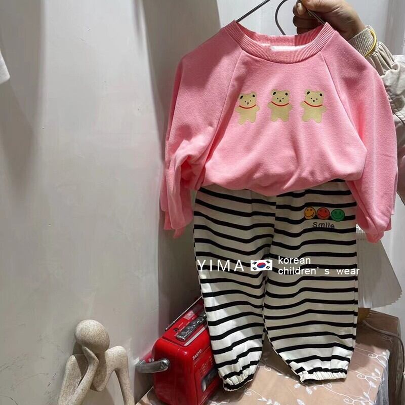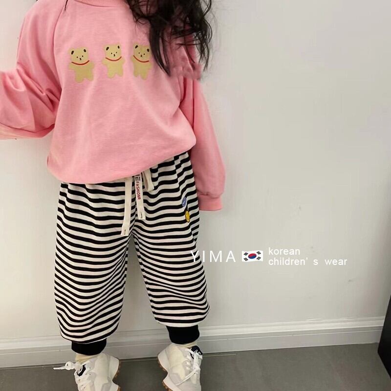 色:ストライプカジュアルパンツ,ピンクのセーター
