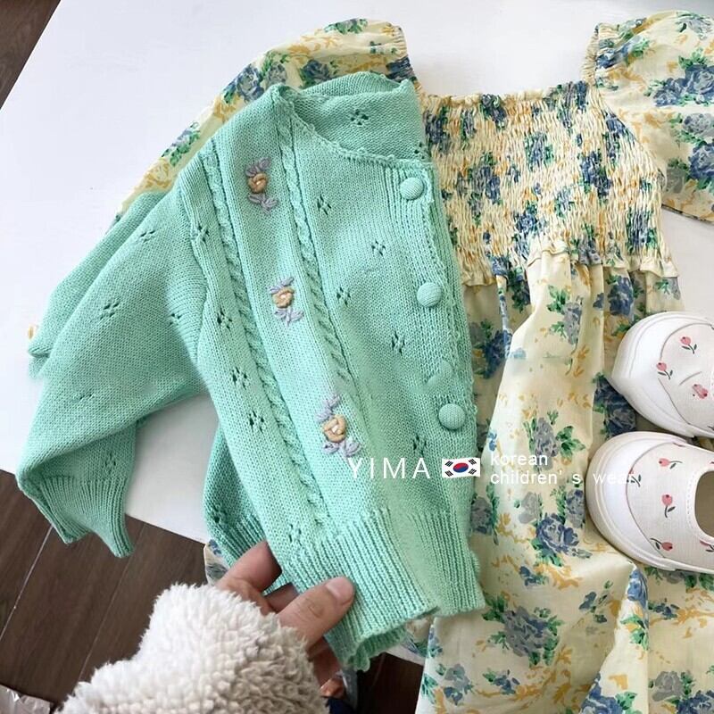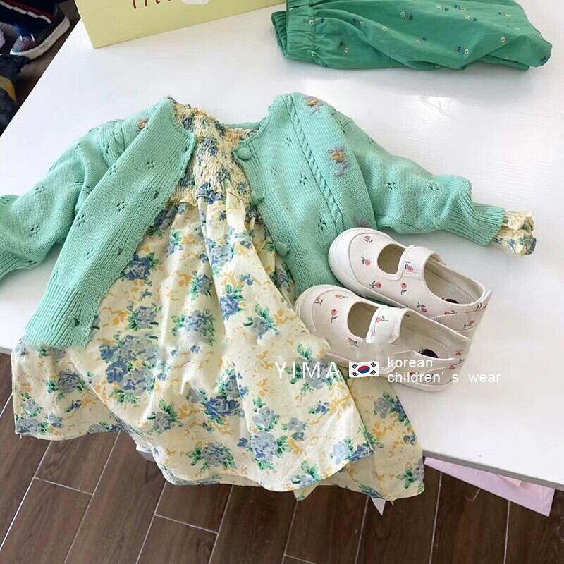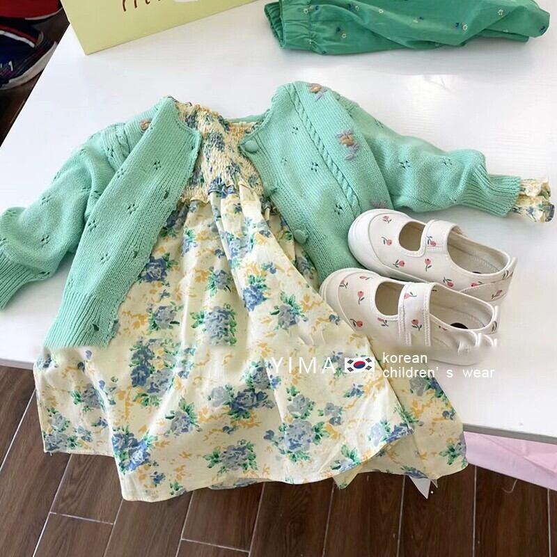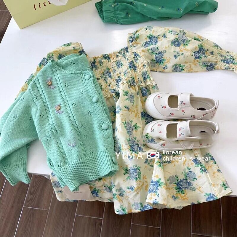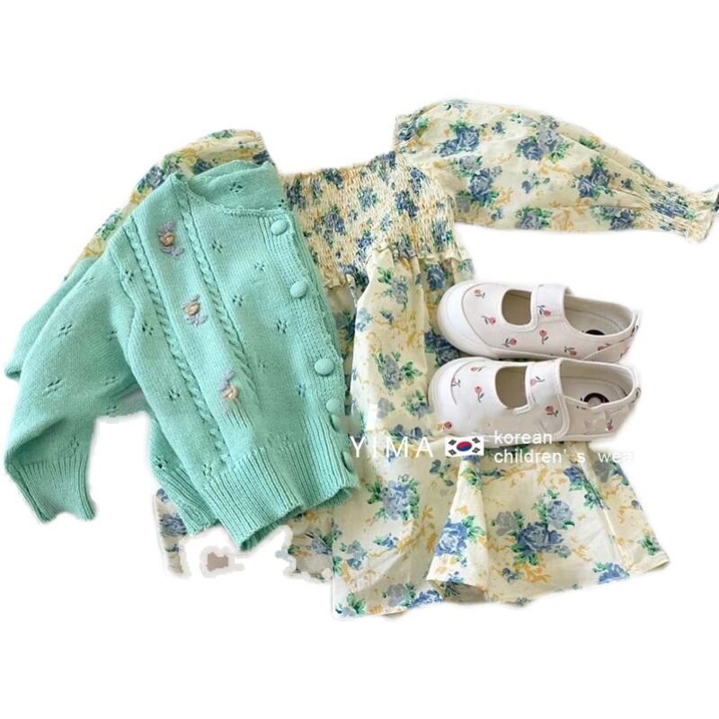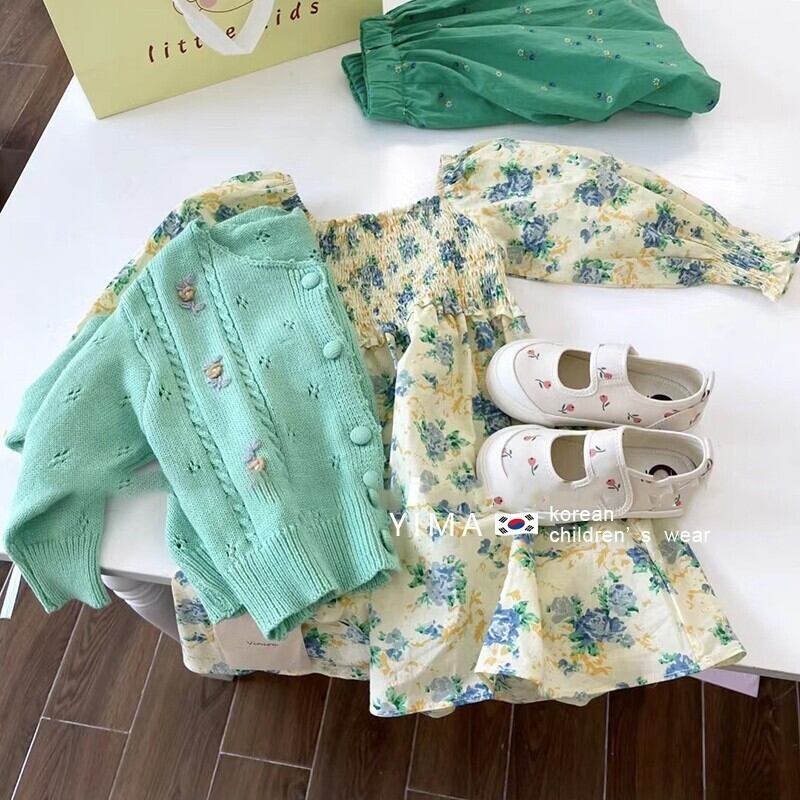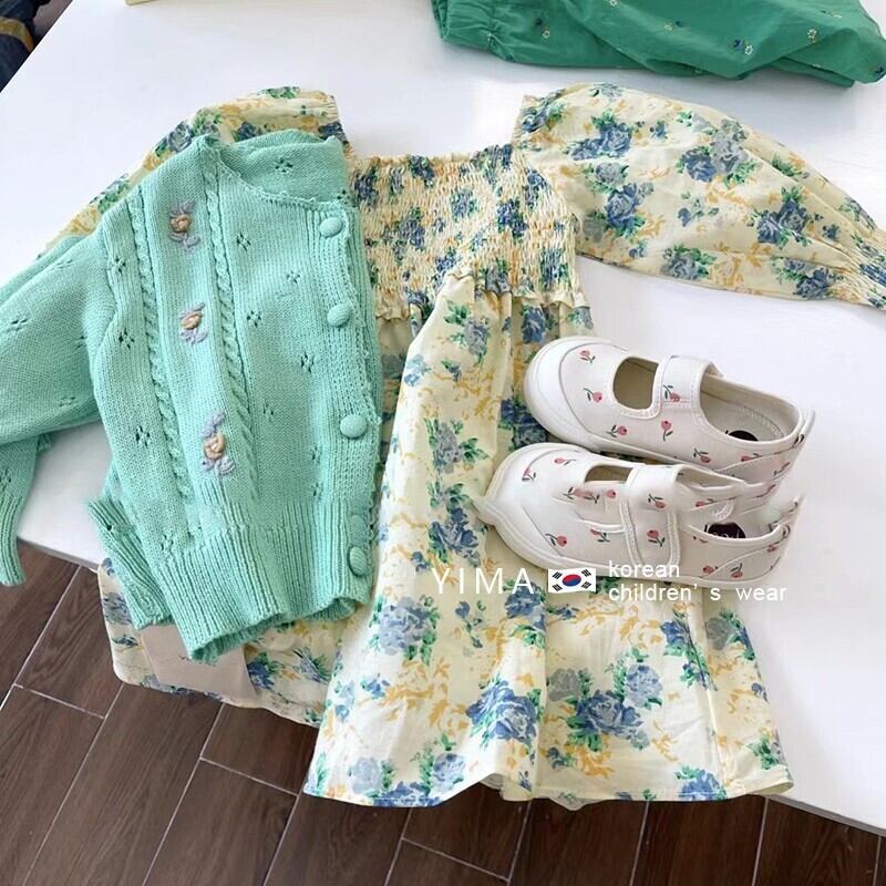 色:ブルーフローラルスカート,ライトグリーンのセーター