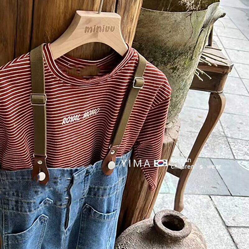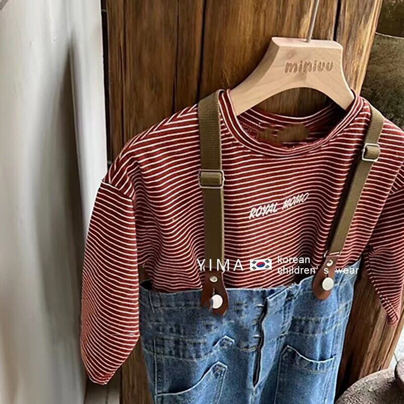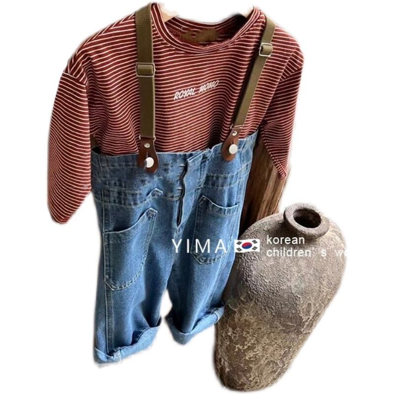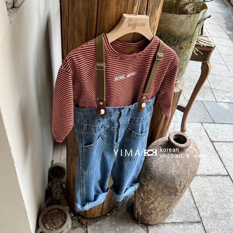 色:青いオーバーオール,茶色の赤い縞模様のシャツ