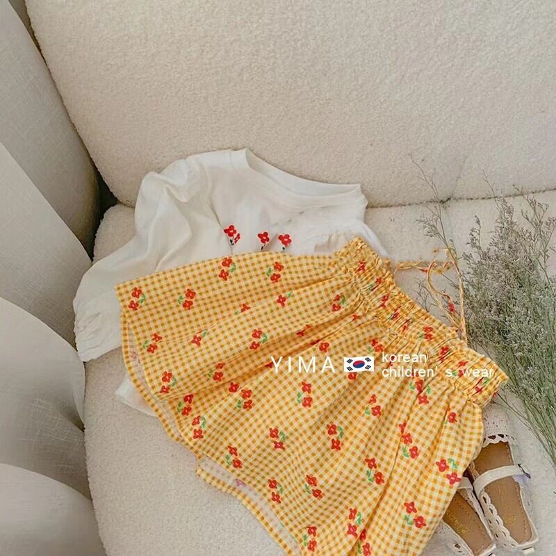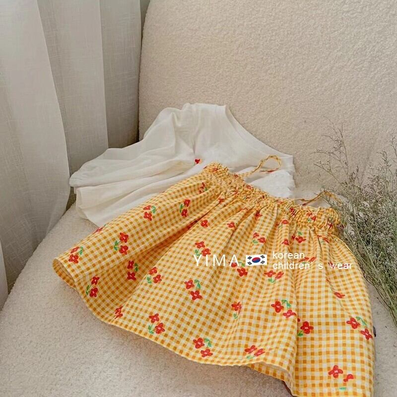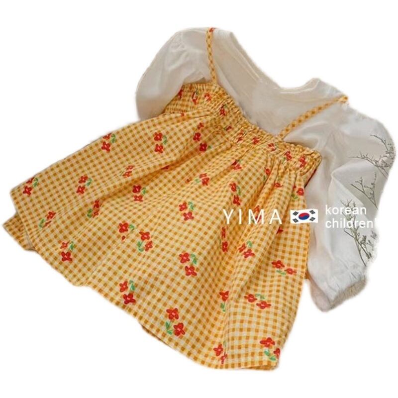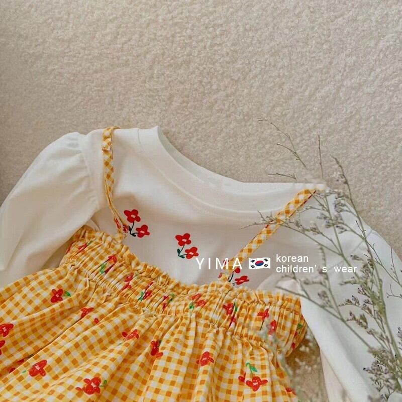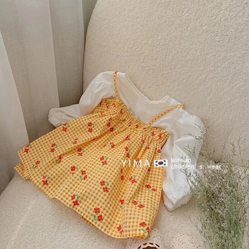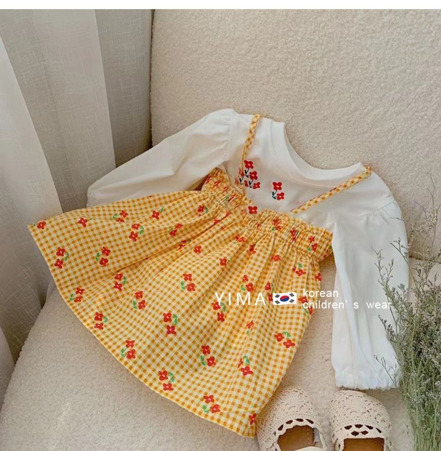 色:ホワイトロングスリーブトップ,黄色のサスペンダースカート