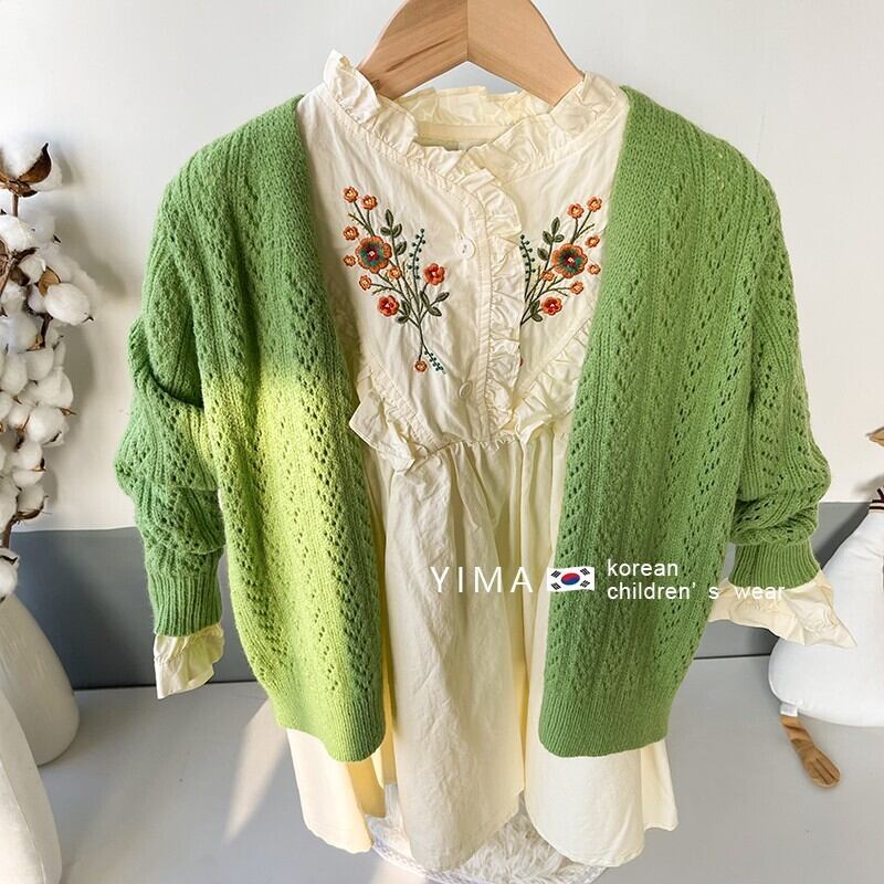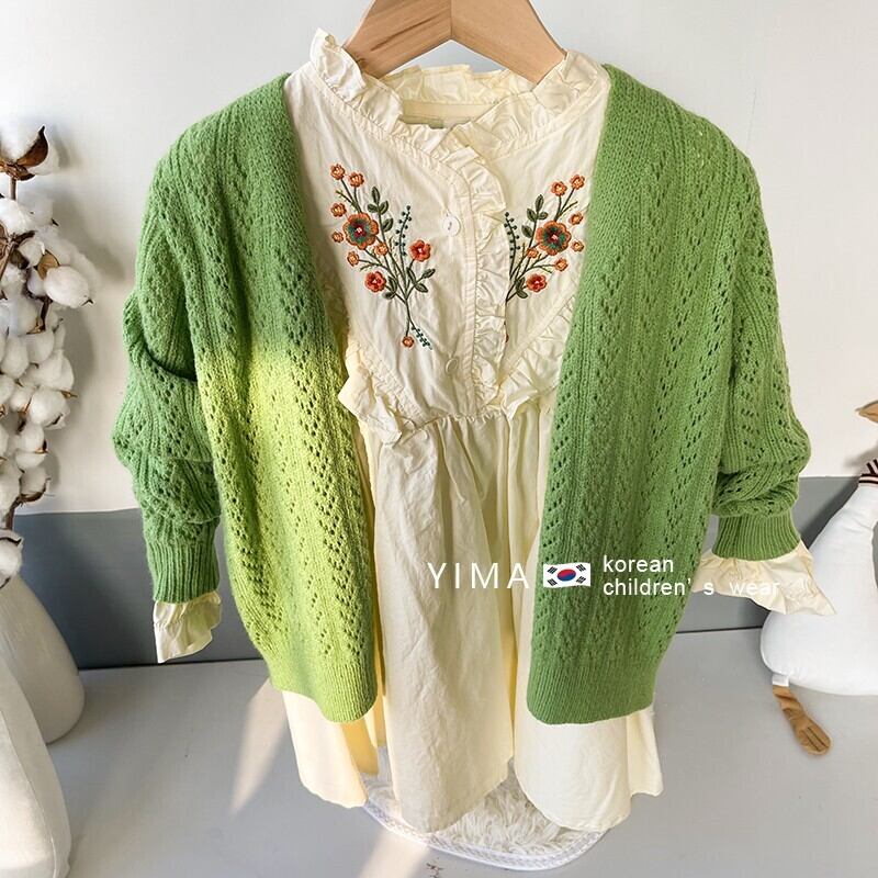 色:グリーンニットカーディガン,アプリコット刺繡ワンピース