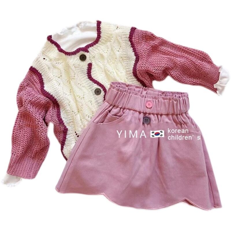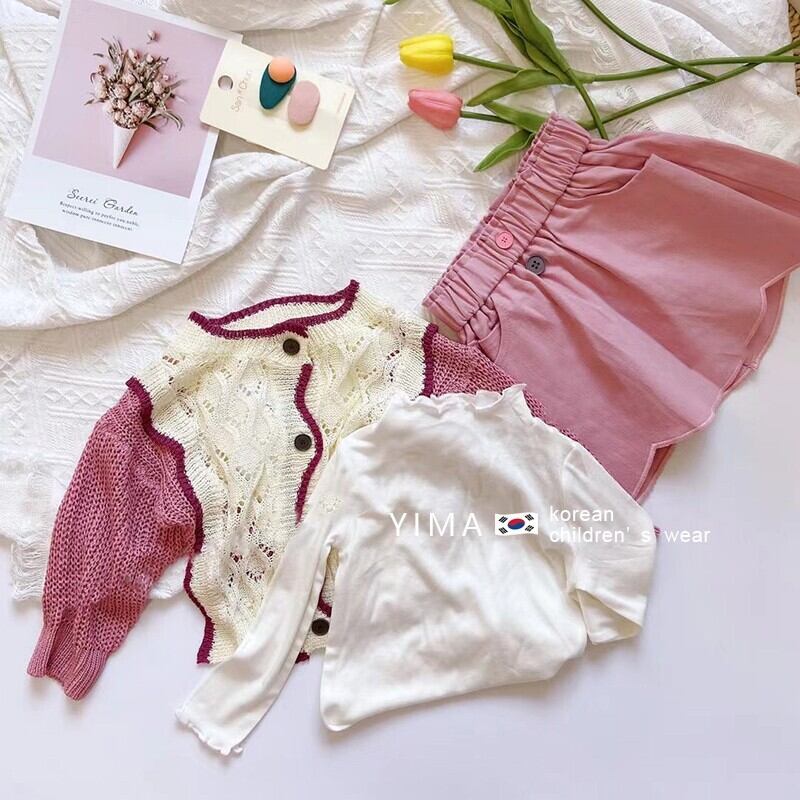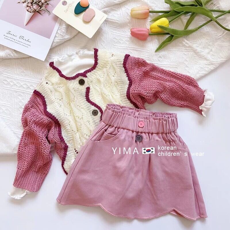 色:アプリコットセーター,ピンクのつぼみスカート,ホワイトボトミングシャツ