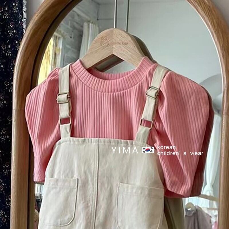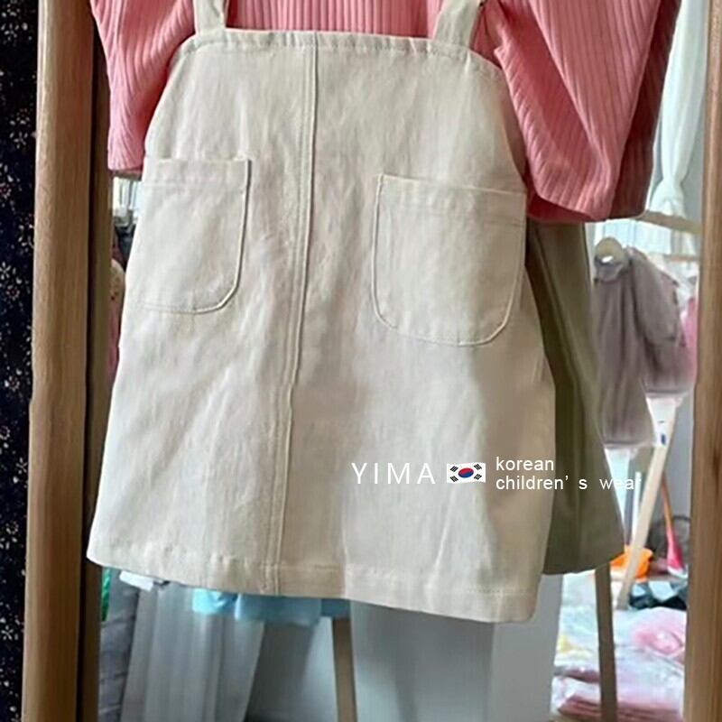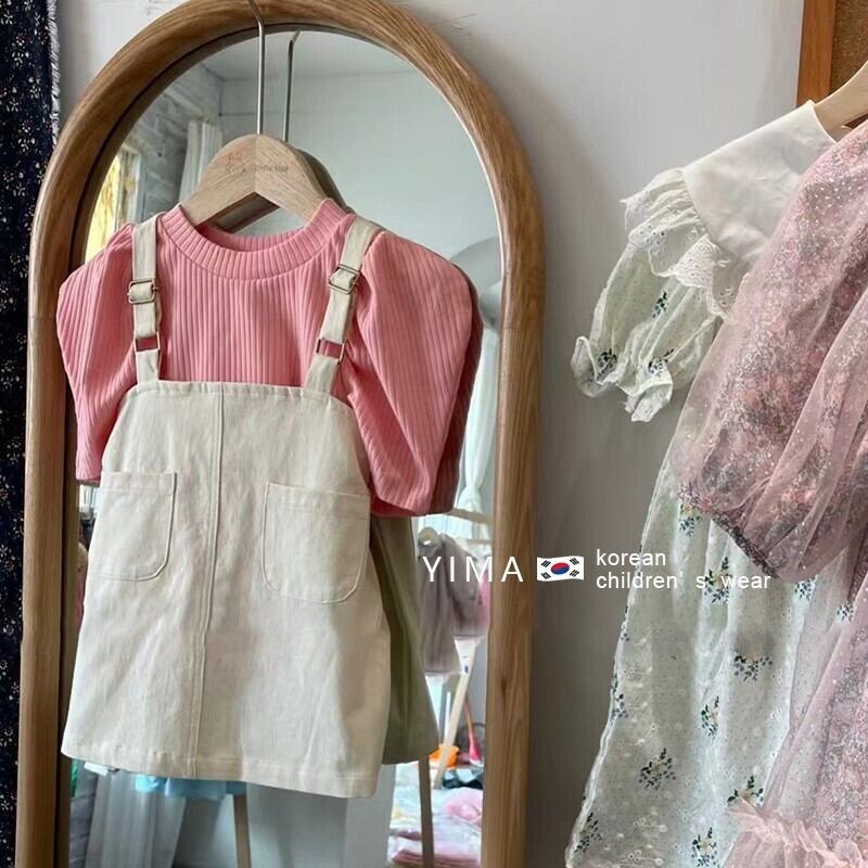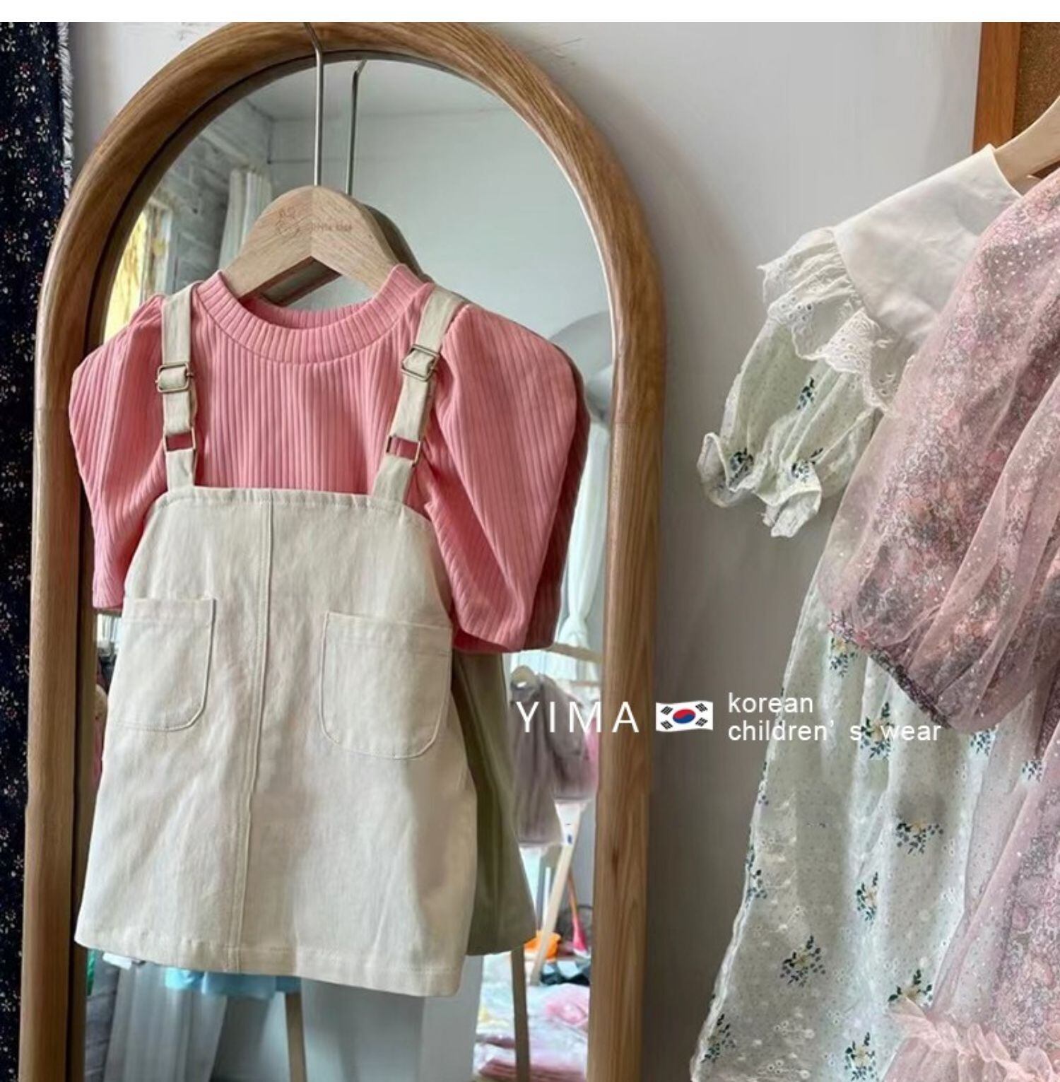 色:ピンクの半袖シャツ,オフホワイトストラップスカート