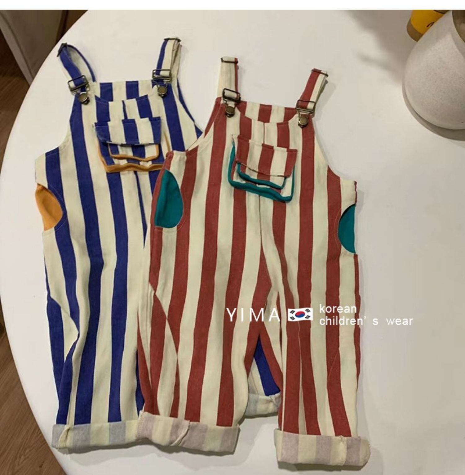 色:赤い縞模様のオーバーオール,ブルーのストライプのオーバーオール