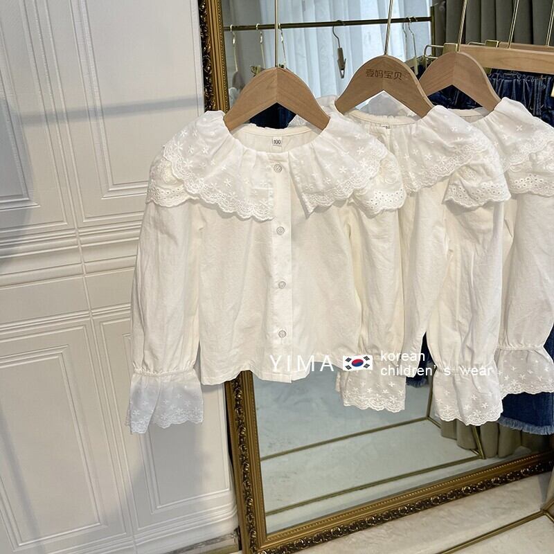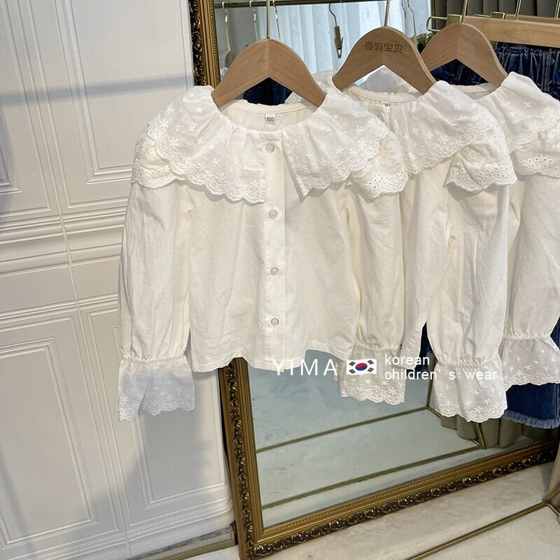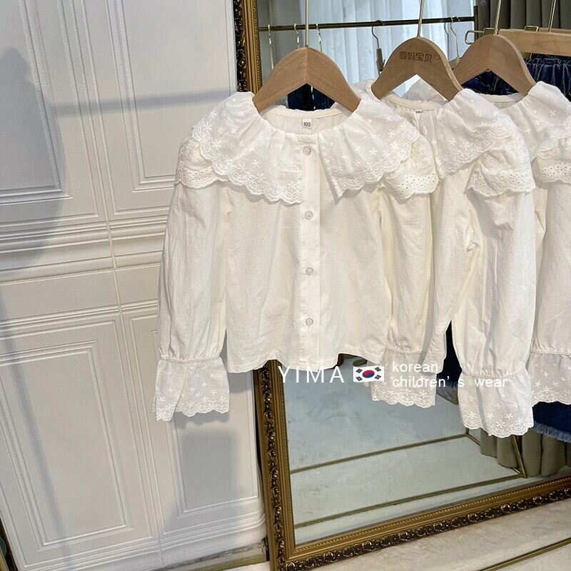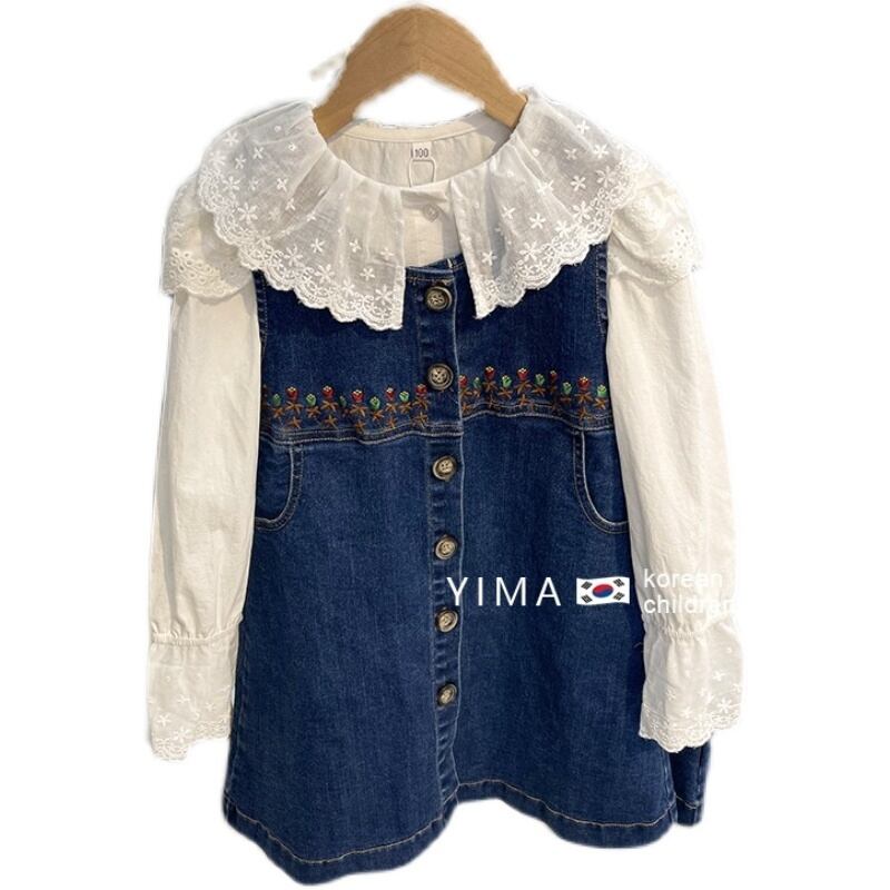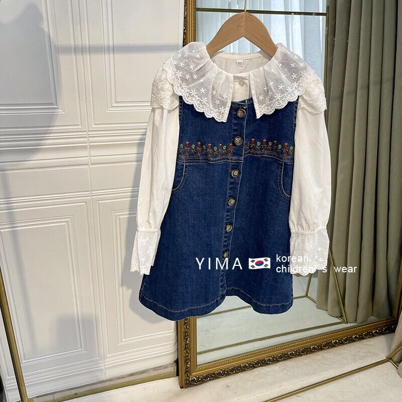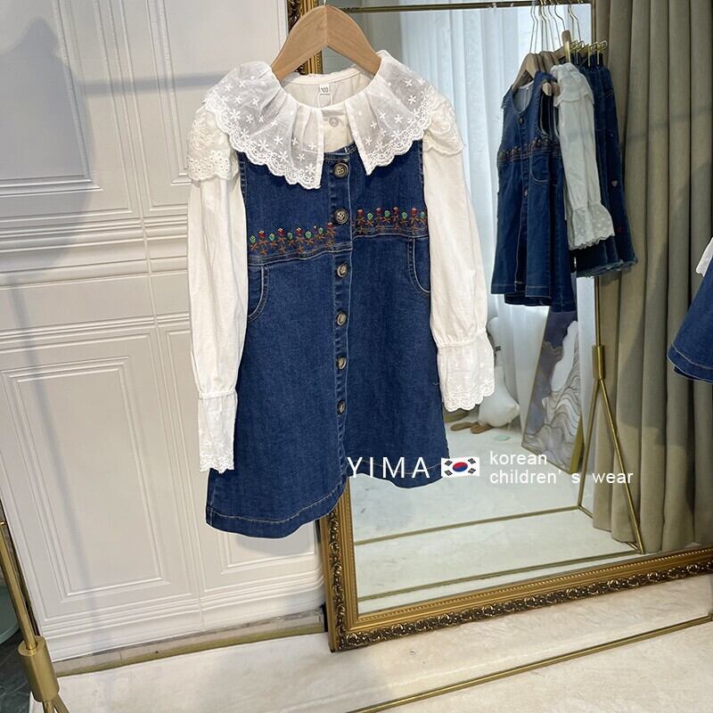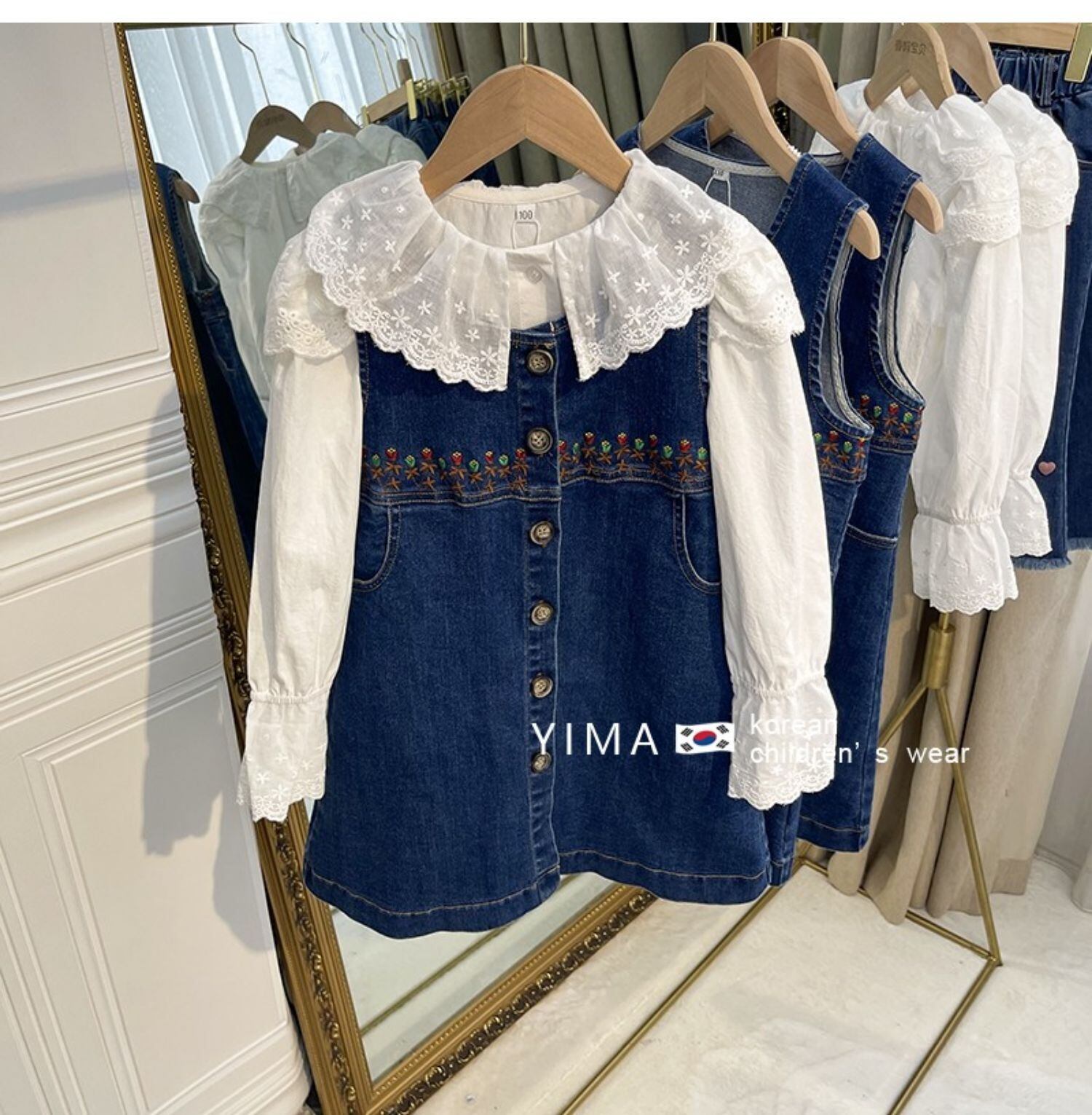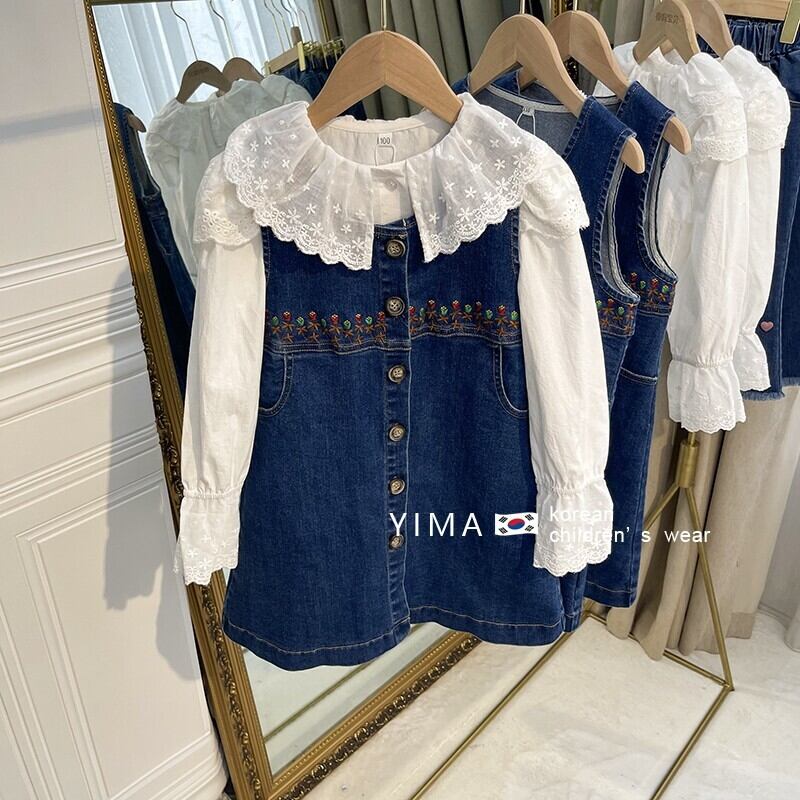 色:ブルーデニムスカート,白のシャツ