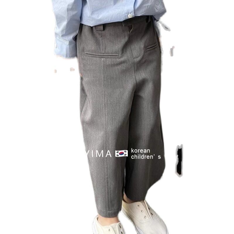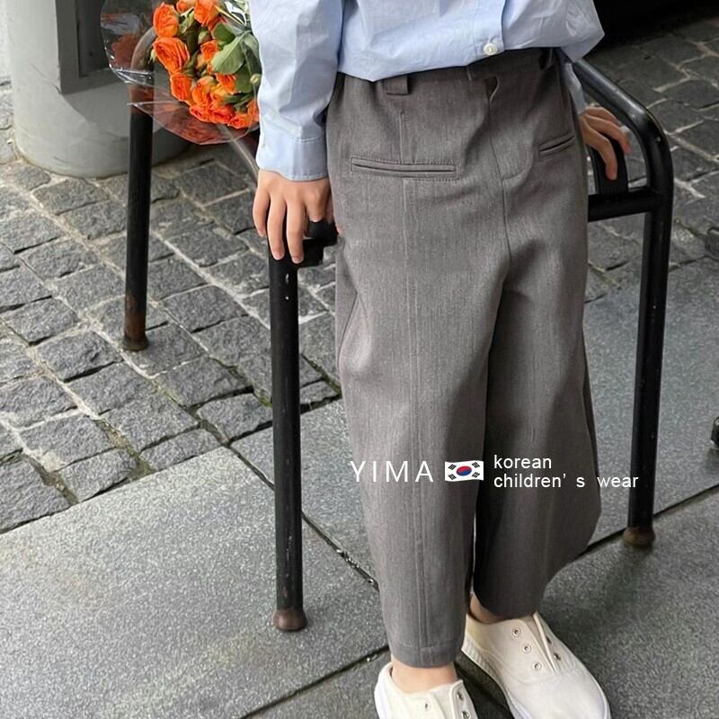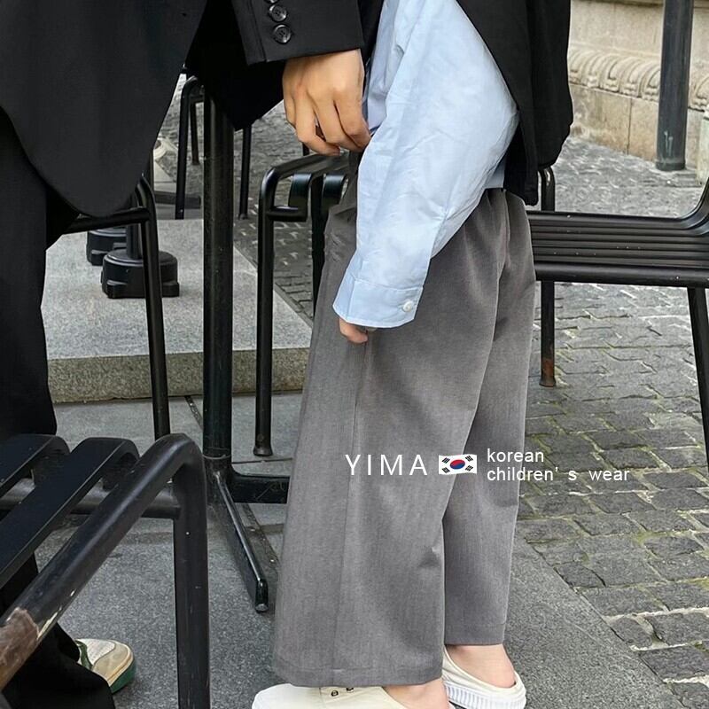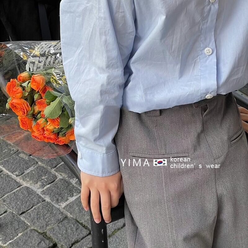 色:グレーのワイドレッグパンツ,スカイブルーのシャツ