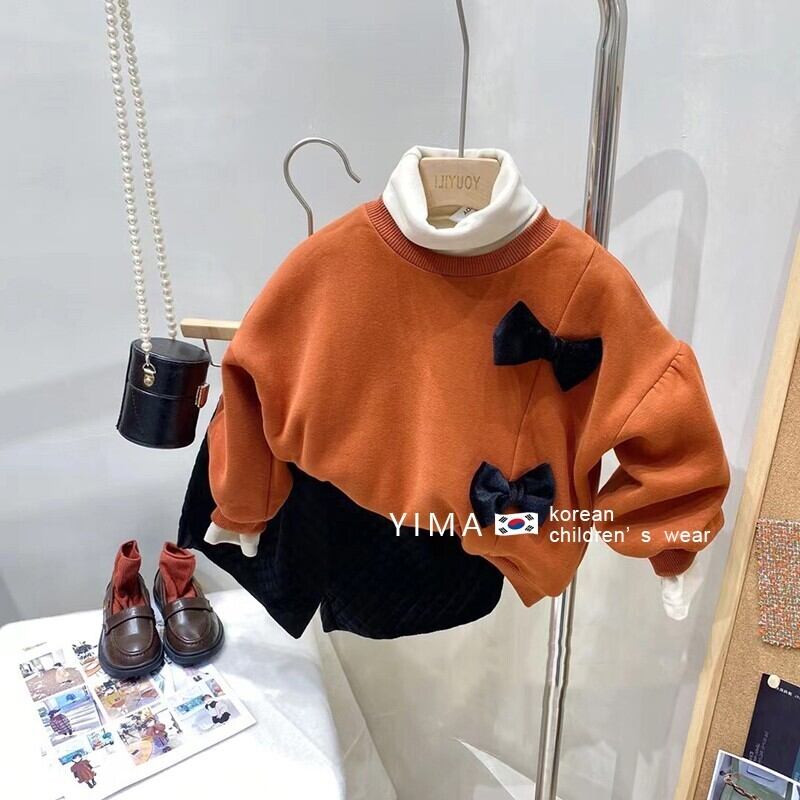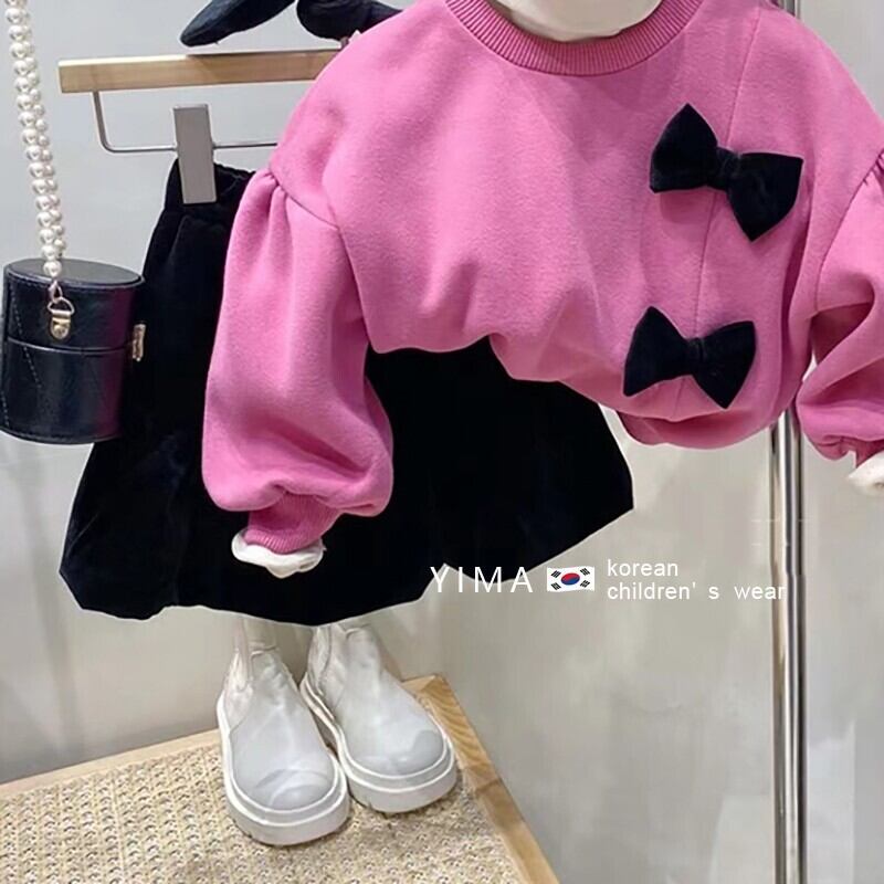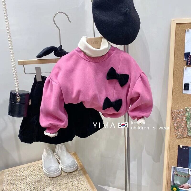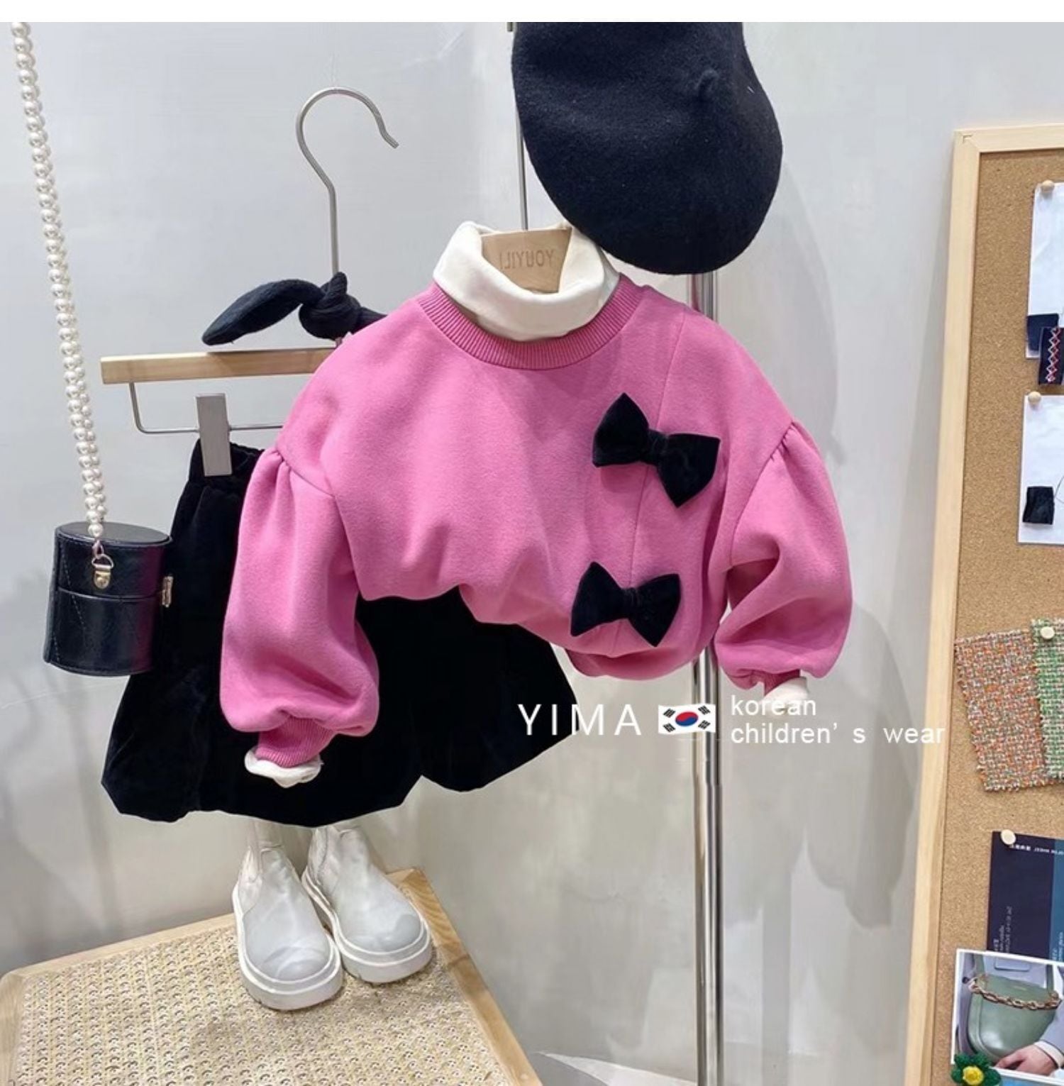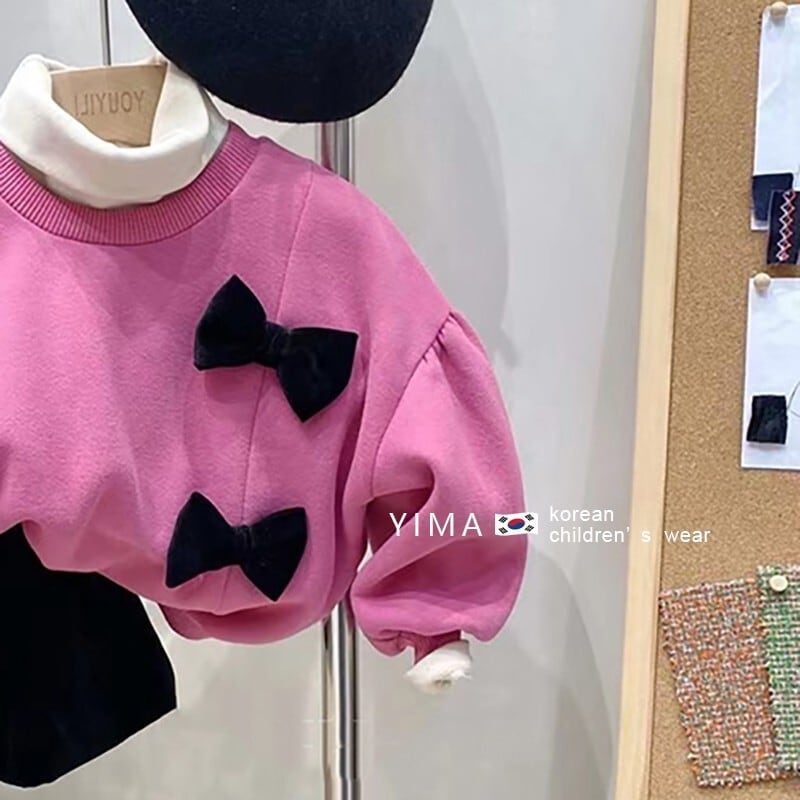 色:ピンクのセーター,ベージュのボトミングシャツ,黒いズボン