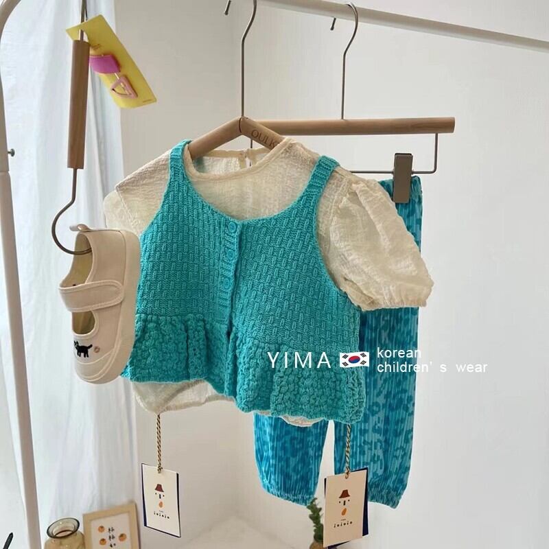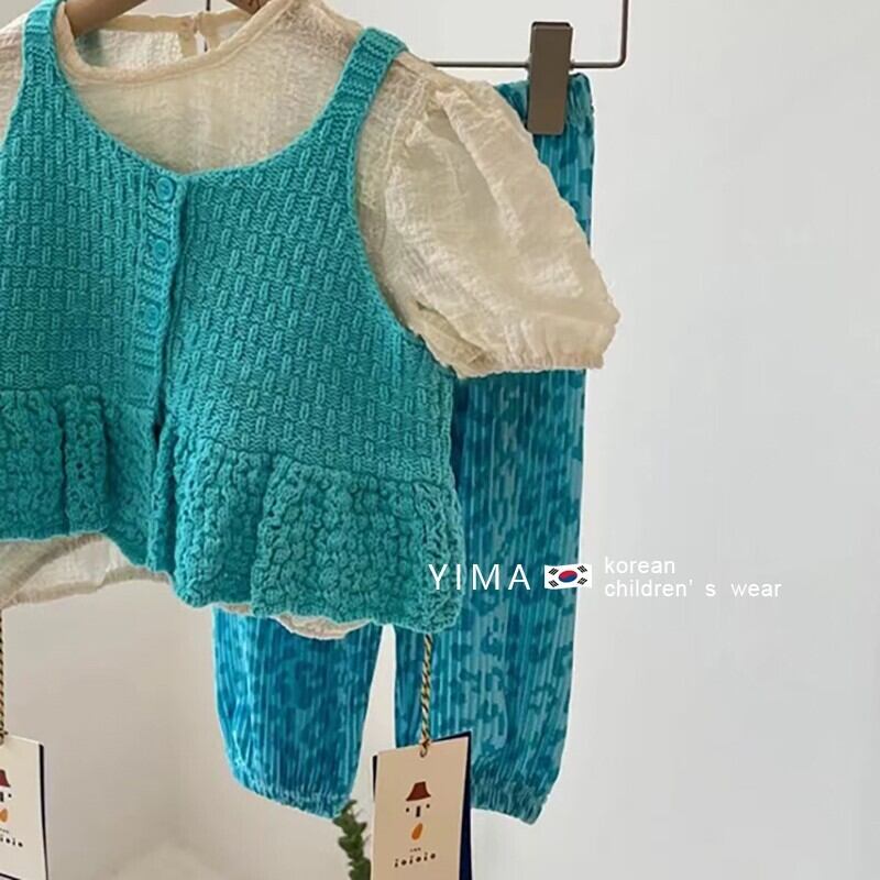 色:ブルーニットベスト,ベージュ半袖トップ,青パンツ