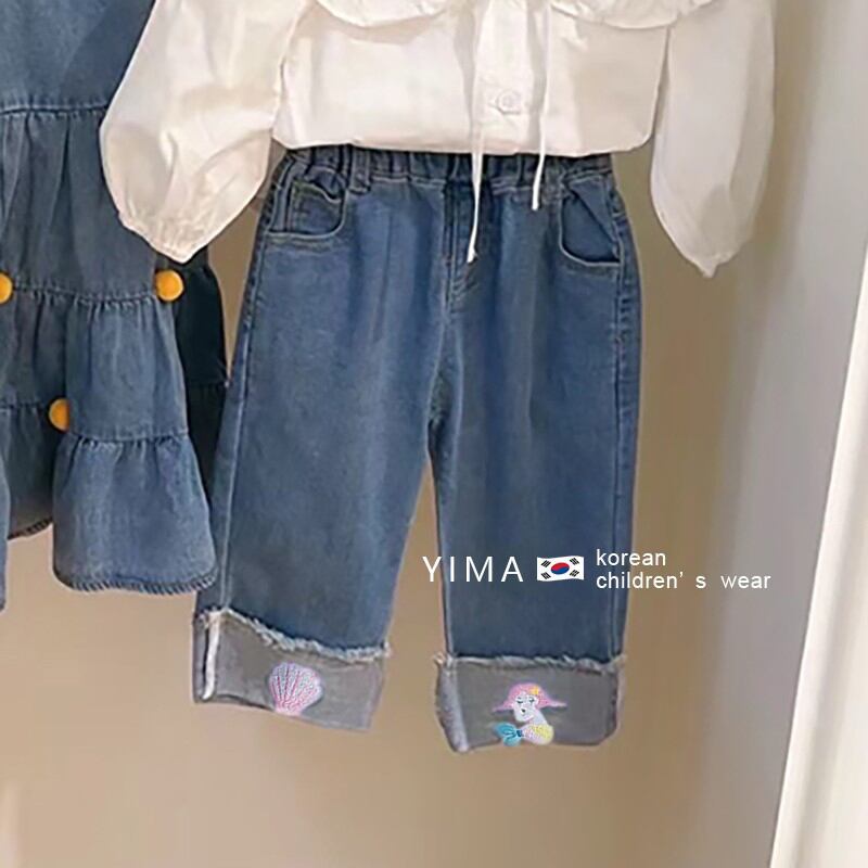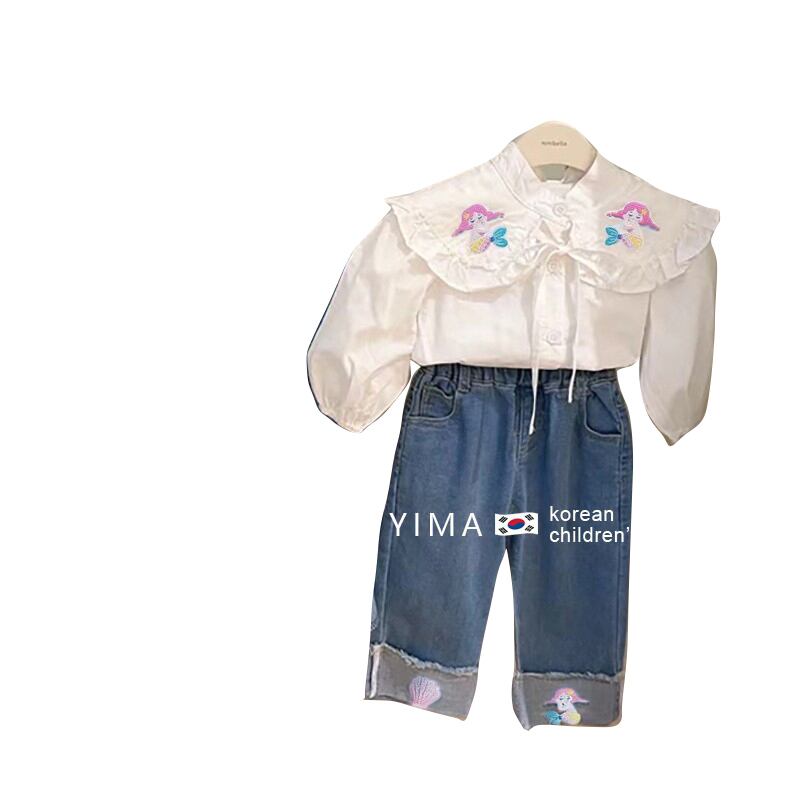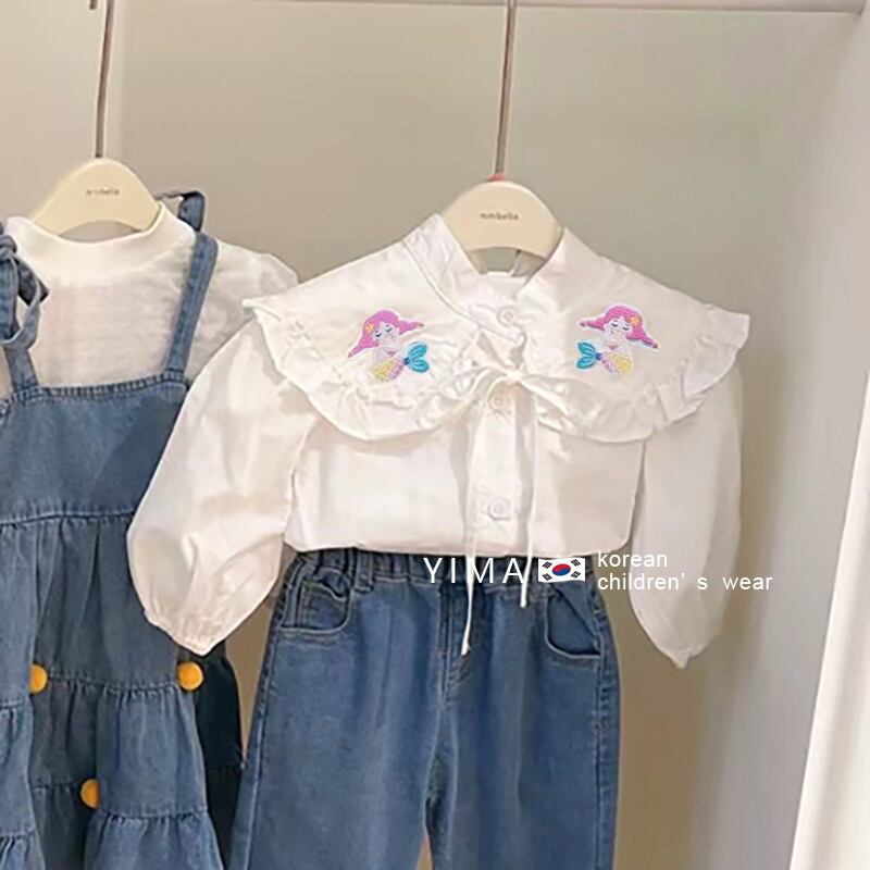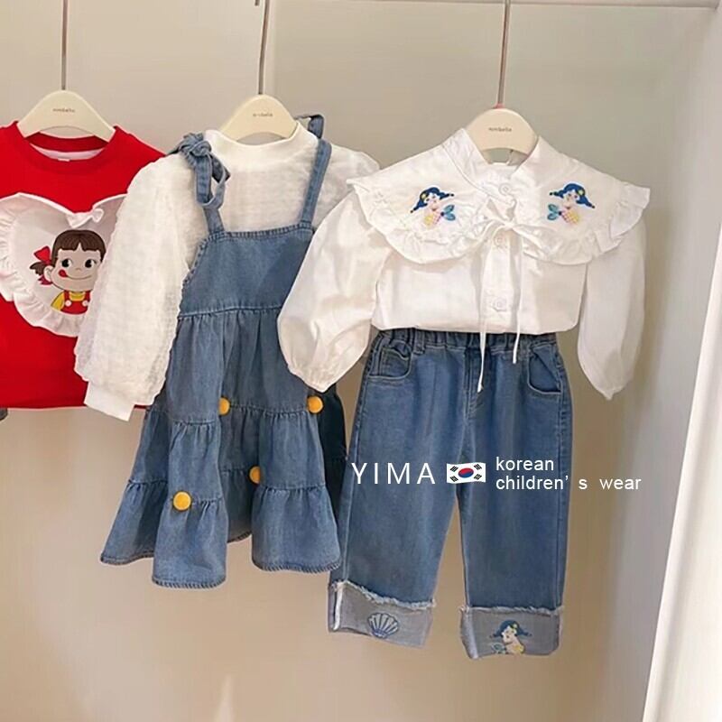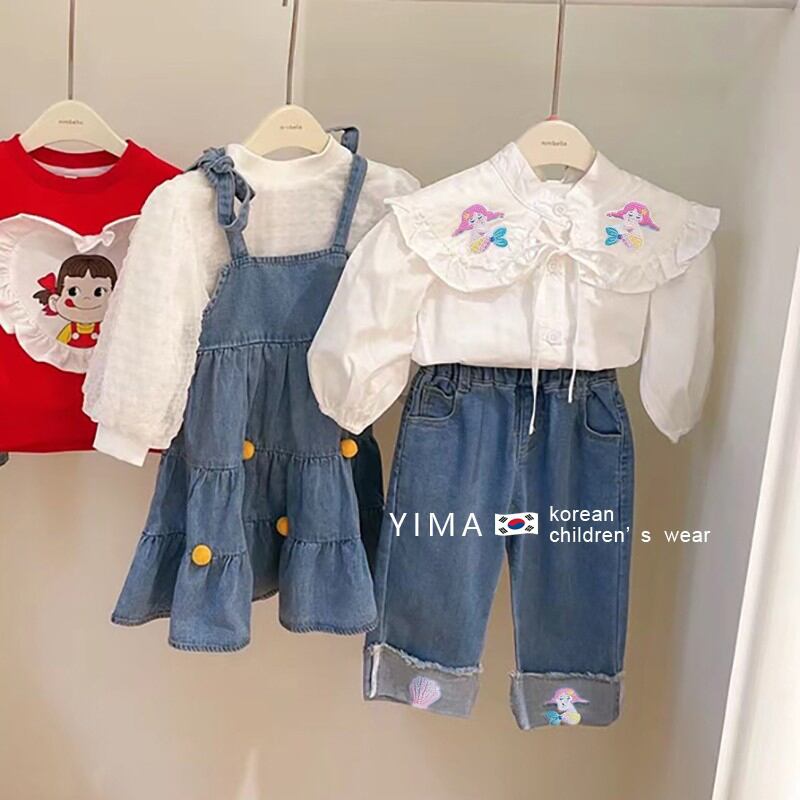 色:白のシャツ,ブルージーンズ,ブルーデニムサスペンダースカート