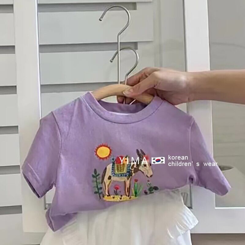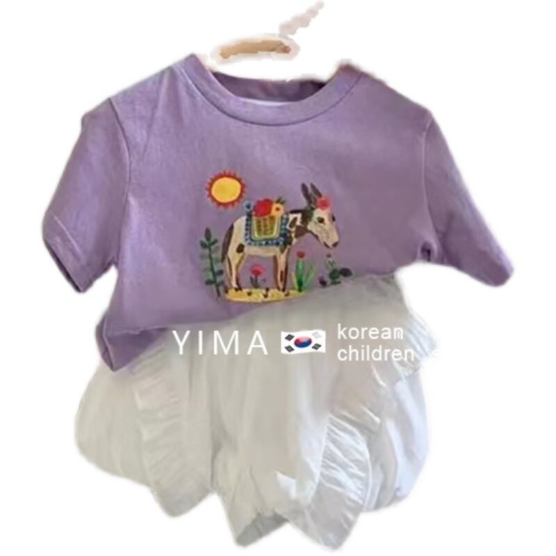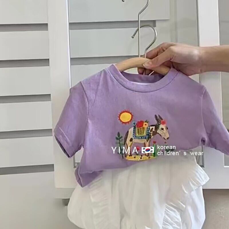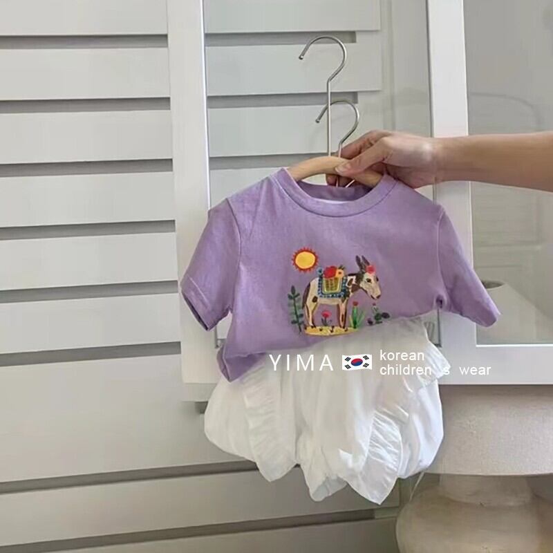 色:紫の漫画のTシャツ,白つぼみパンツ
