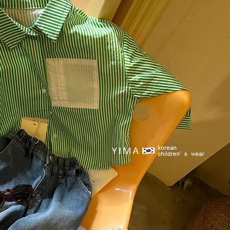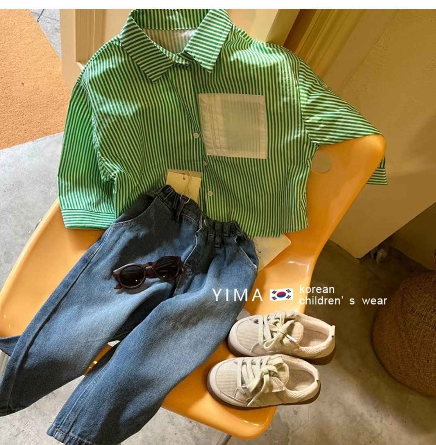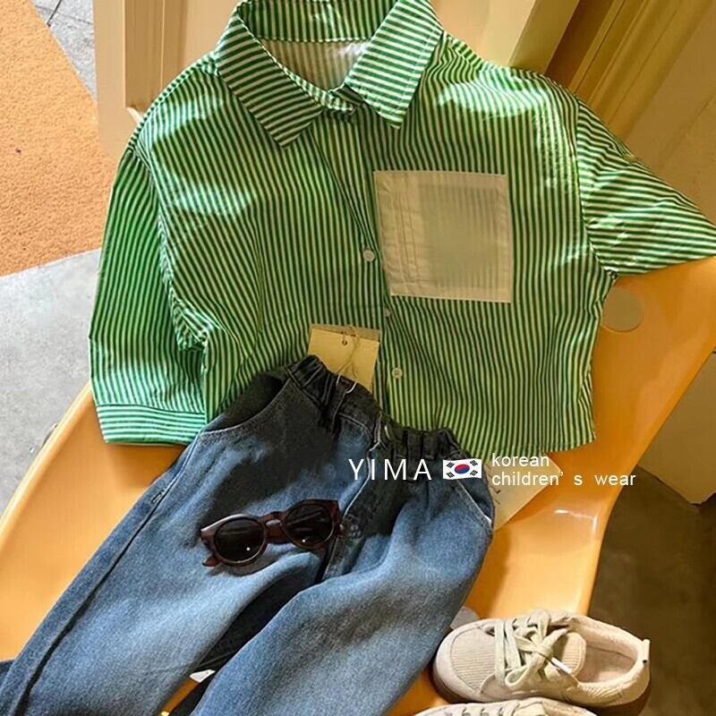 色:緑のストライプのシャツ,ブルージーンズ