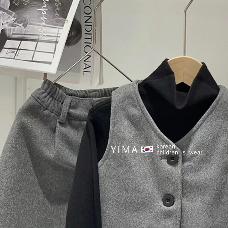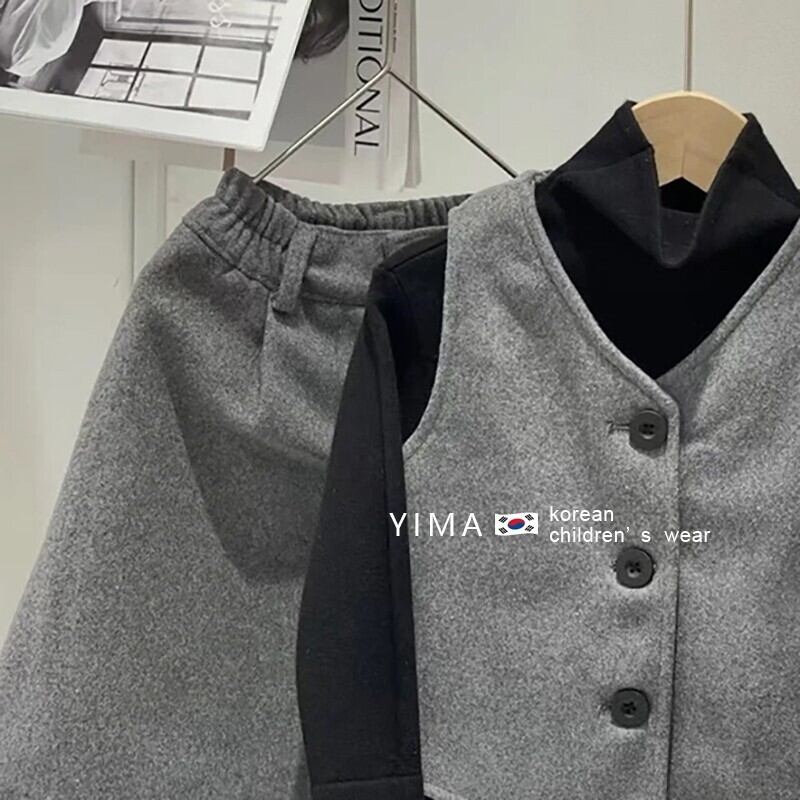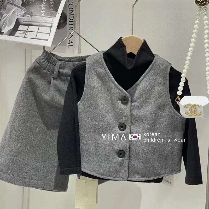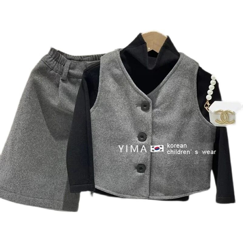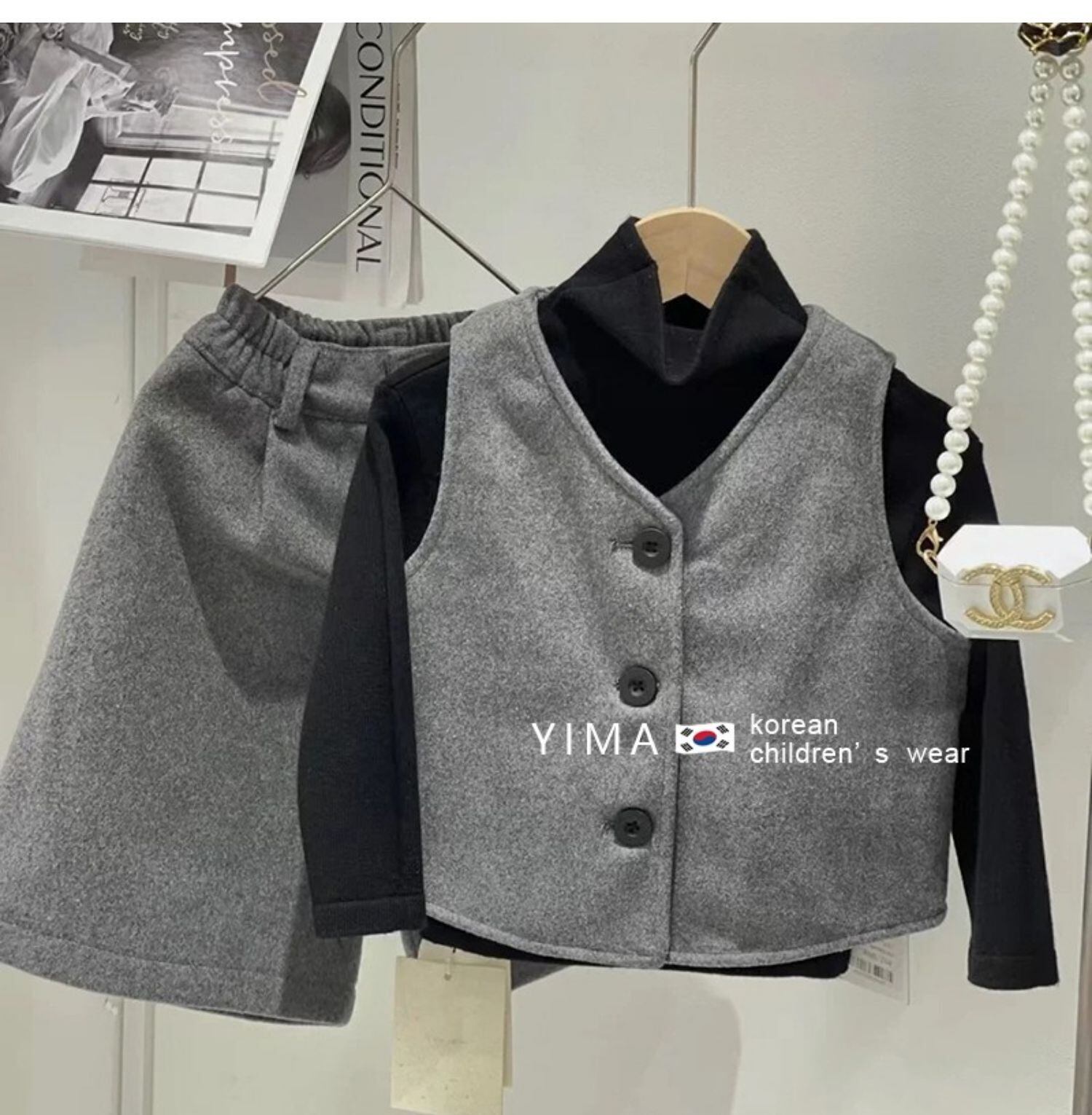 色:グレーのベスト+グレーのワイドレッグパンツ,黒のタートルネック