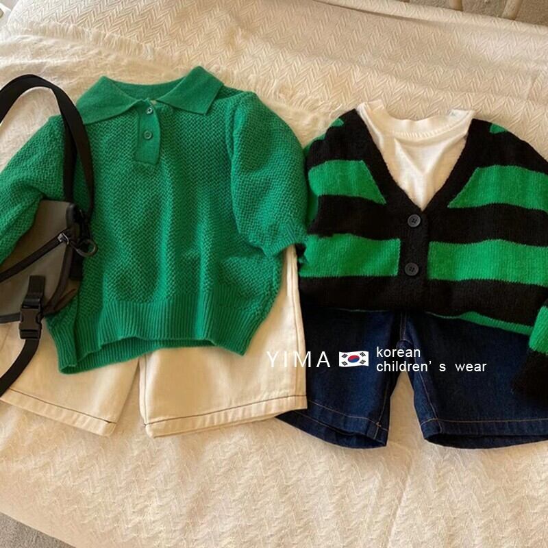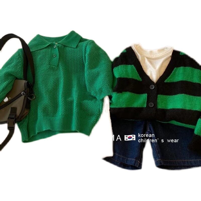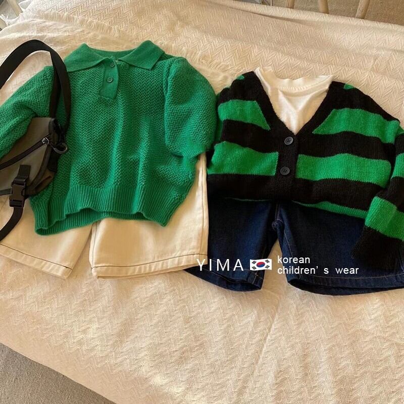 色:グリーンラペルセーター,黒と緑のニットカーディガン