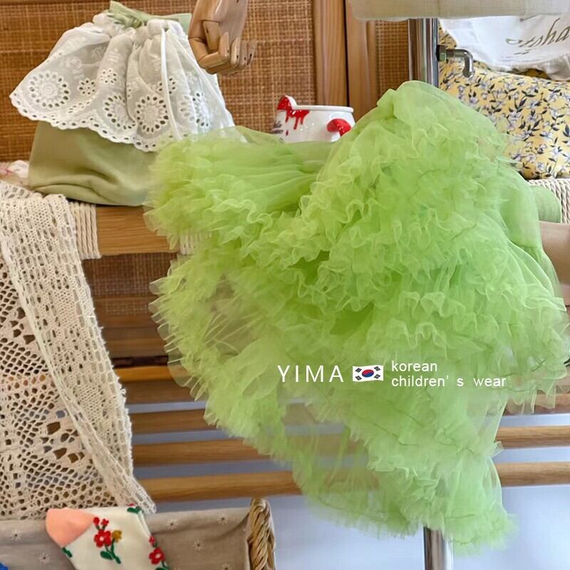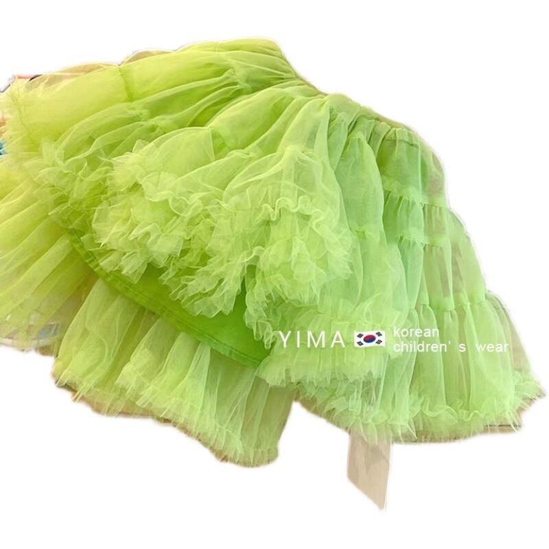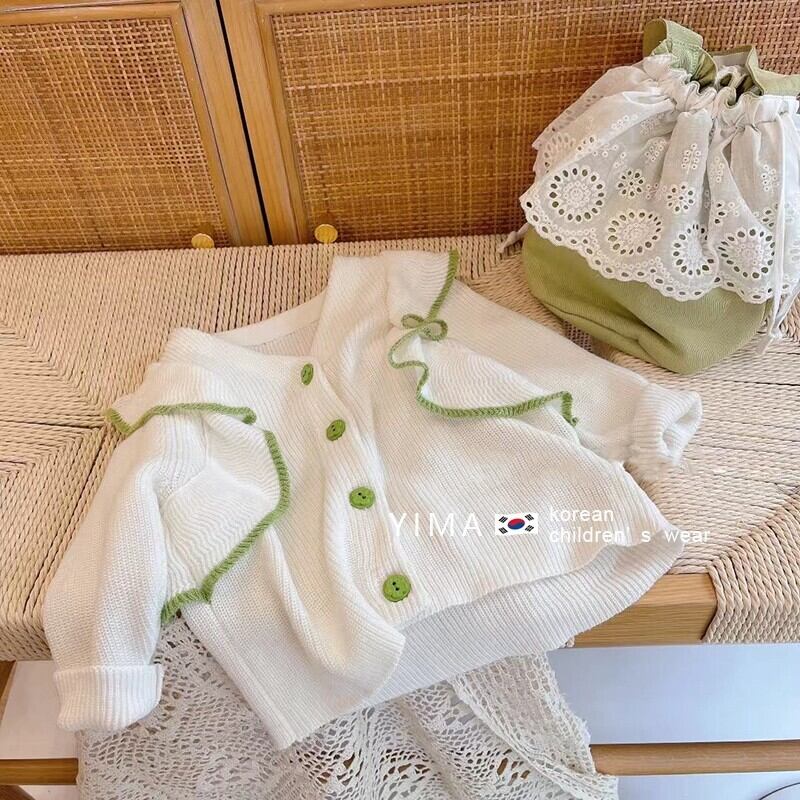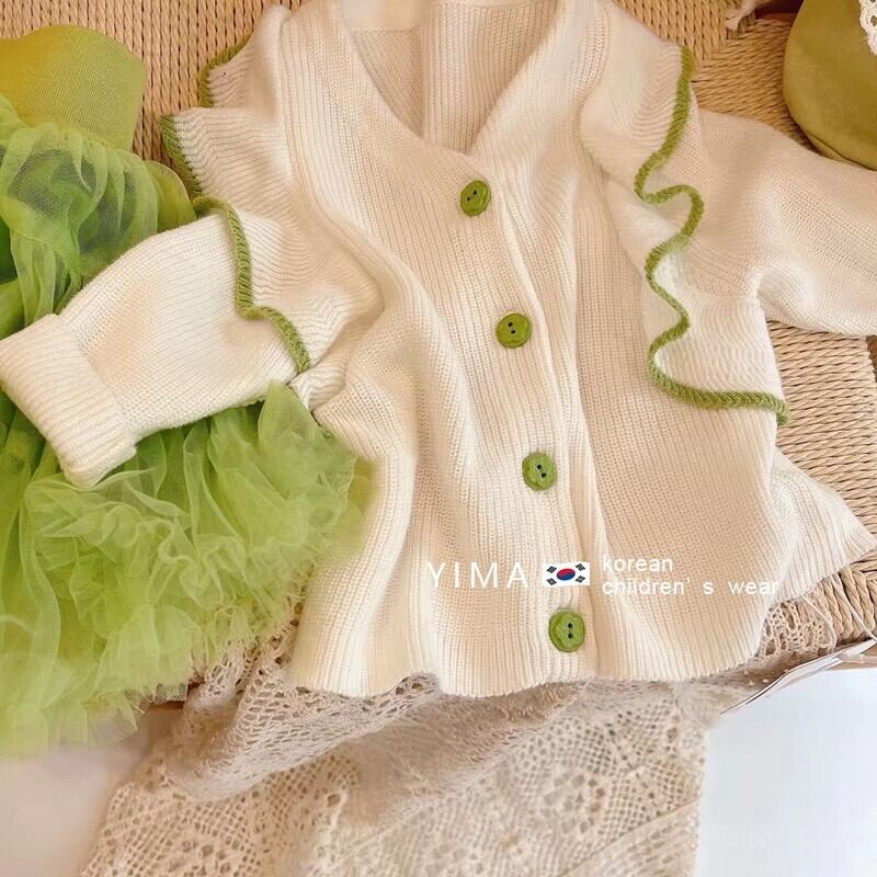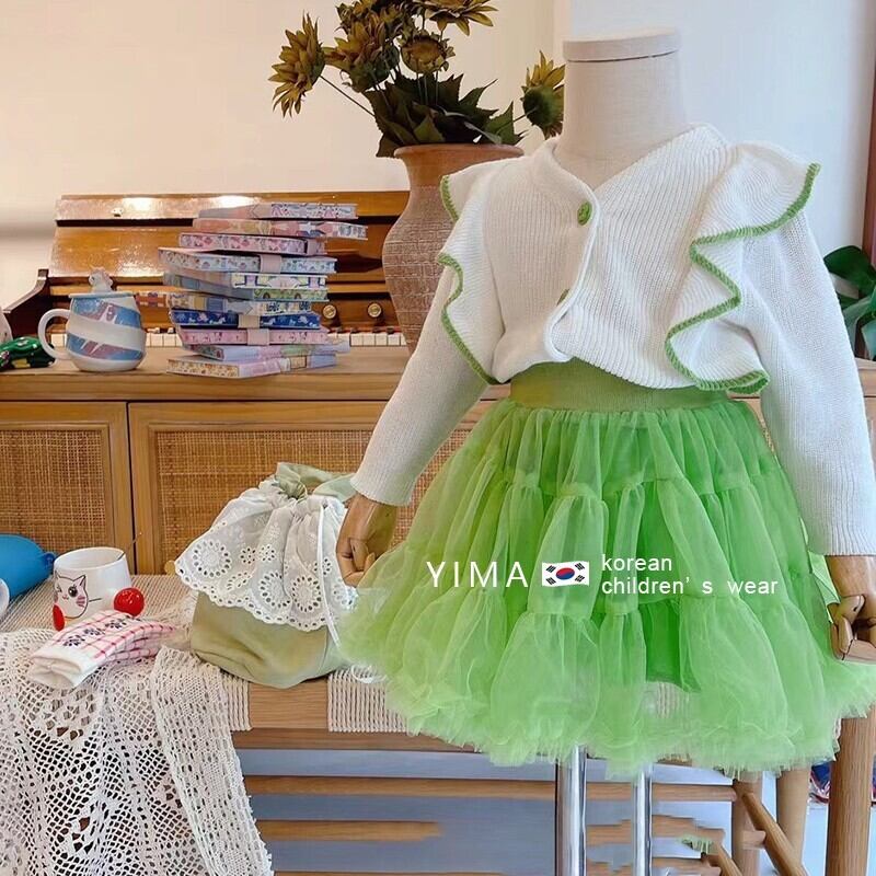 色:クリームホワイトニットカーディガン,フルーツグリーンのコンベックススカート