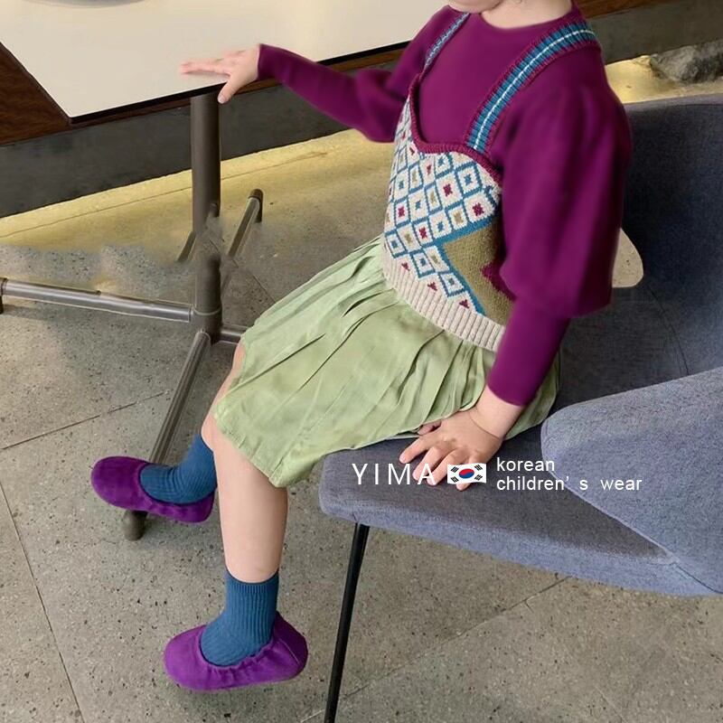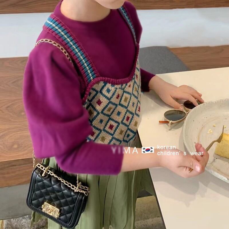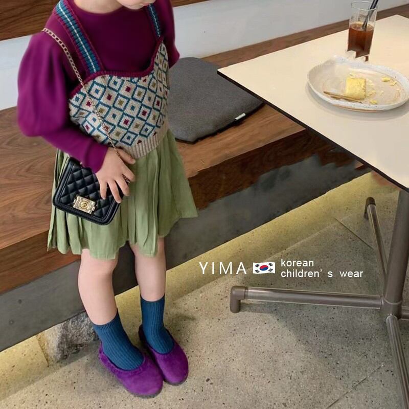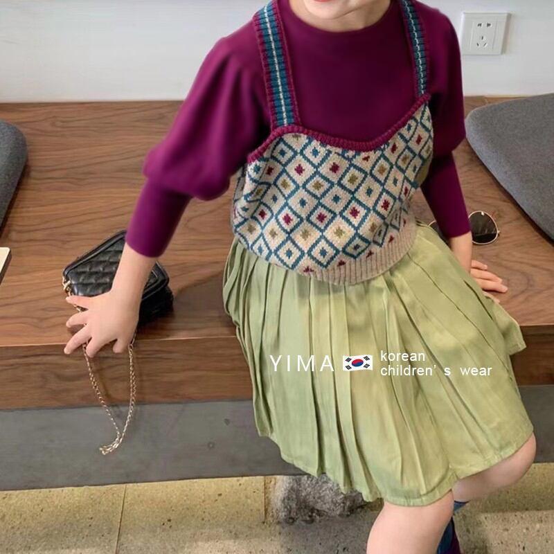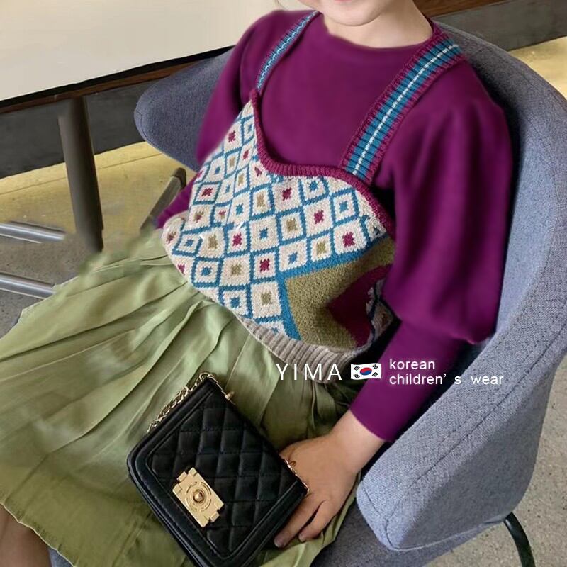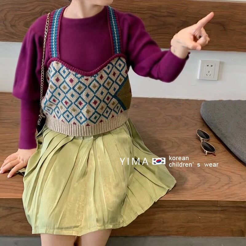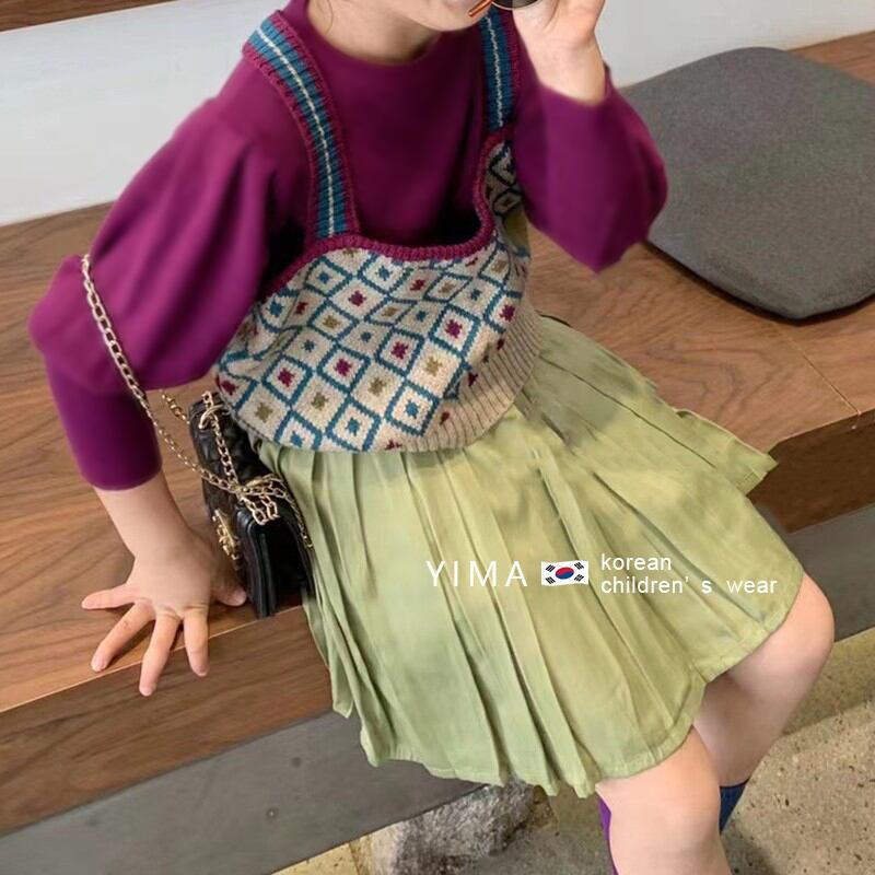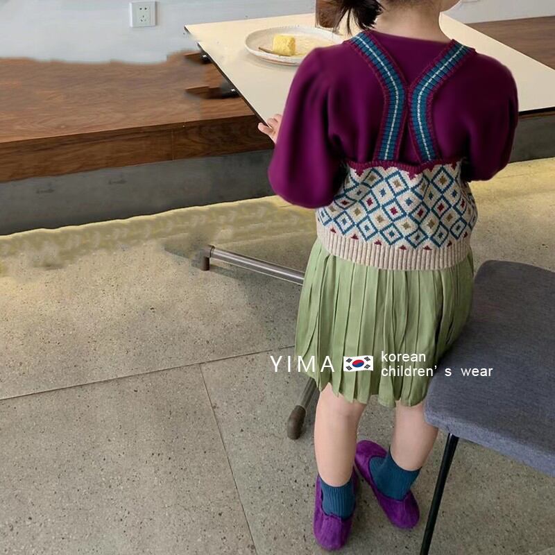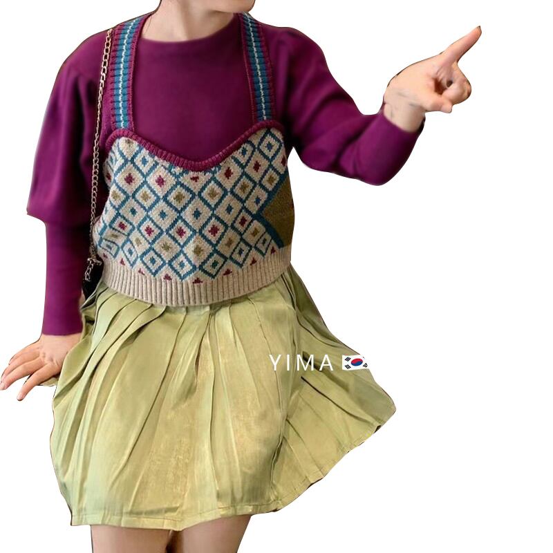 色:ニットベスト,パープルボトミングシャツ,緑のスカート