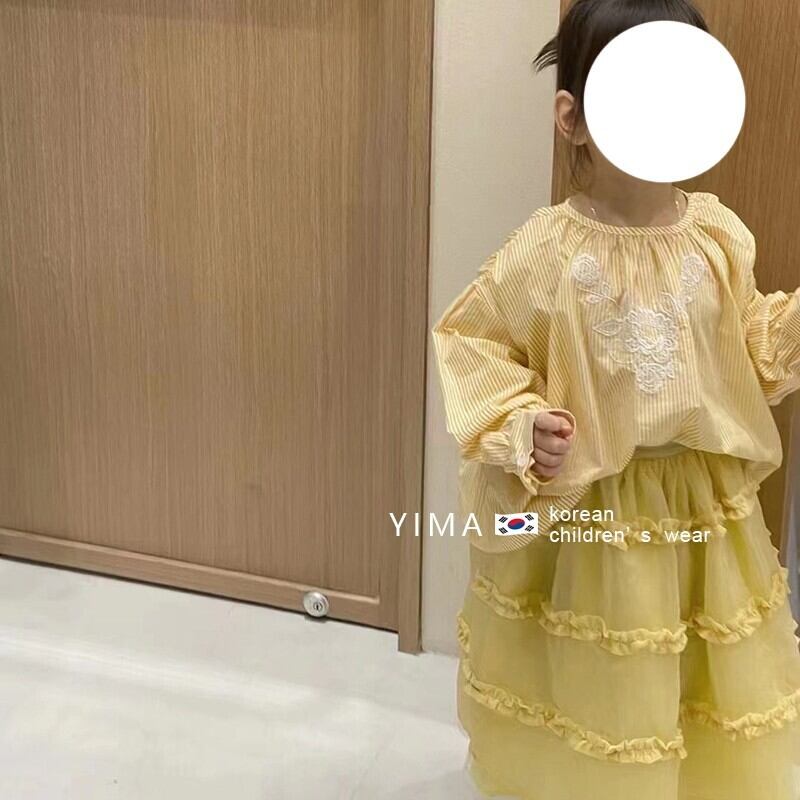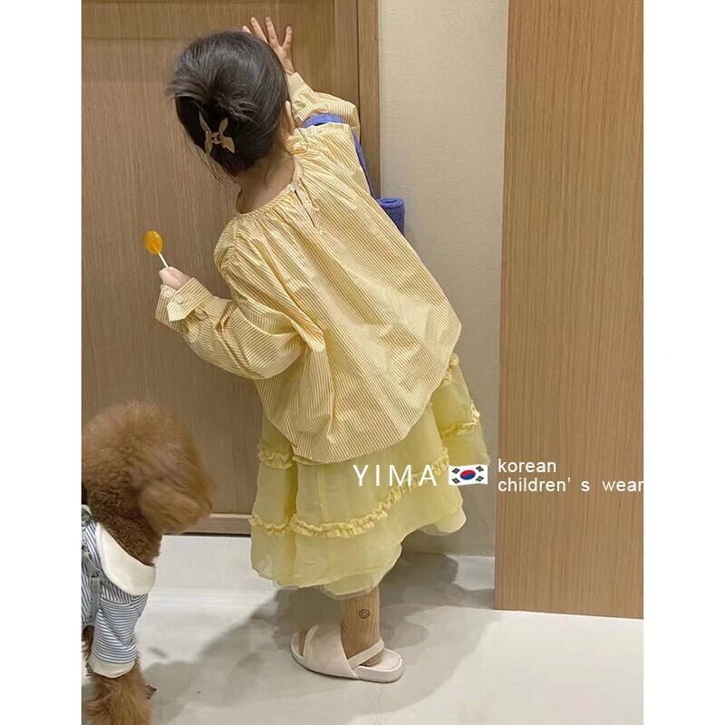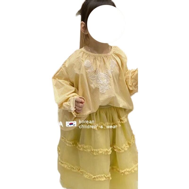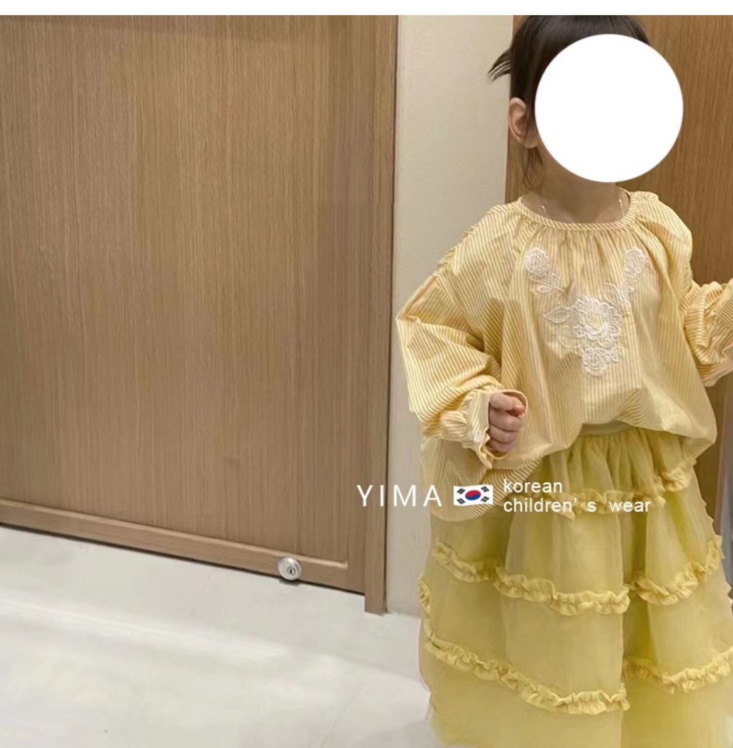 色:黄色の縞模様のシャツ,黄色のメッシュスカート,水色のストライプのシャツ,ホワイトメッシュスカート