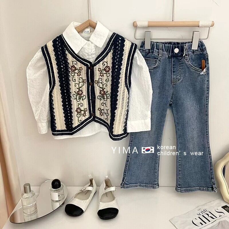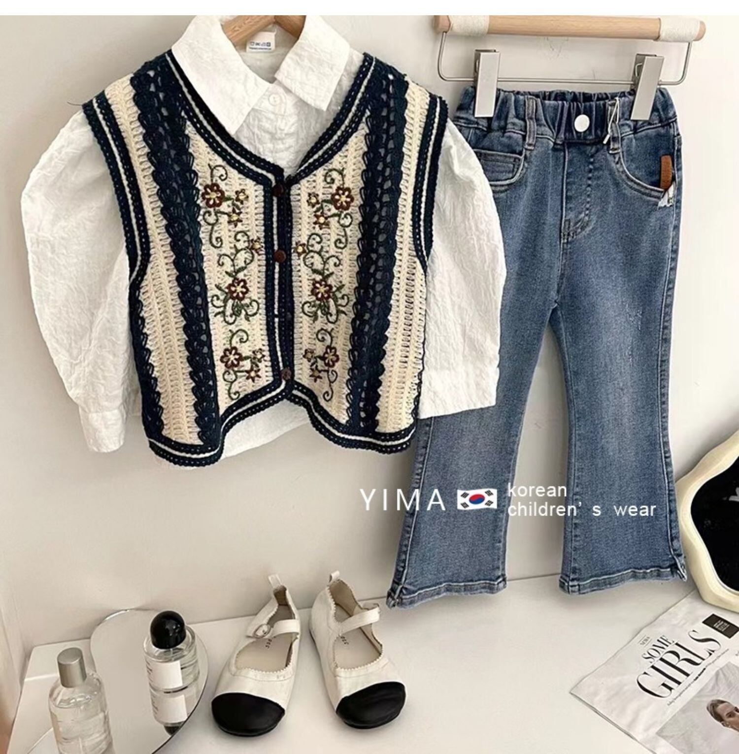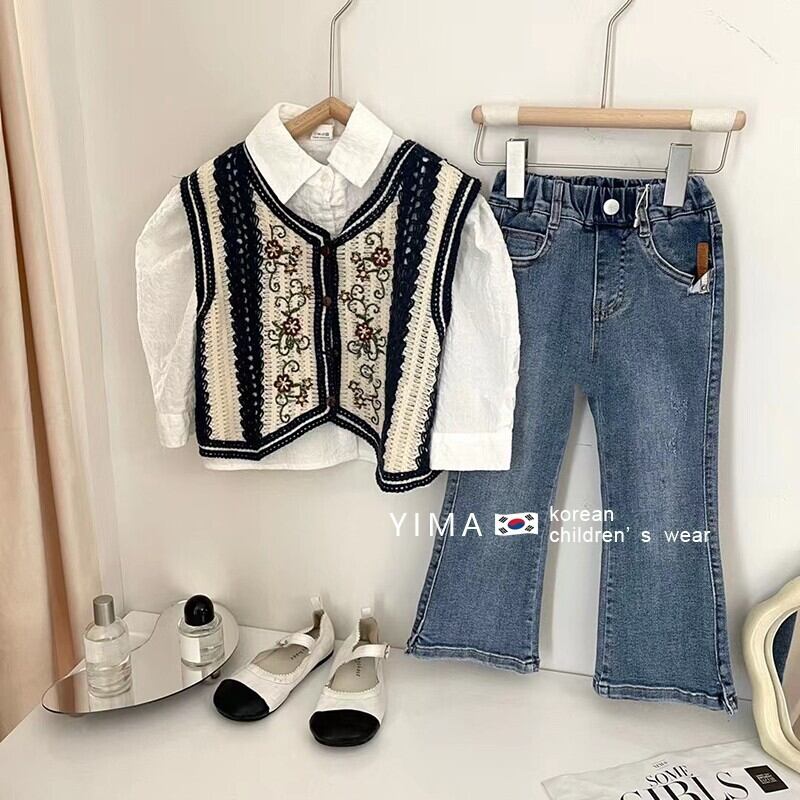 色:ヴィンテージカラーベスト,白のシャツ,ブルージーンズ
