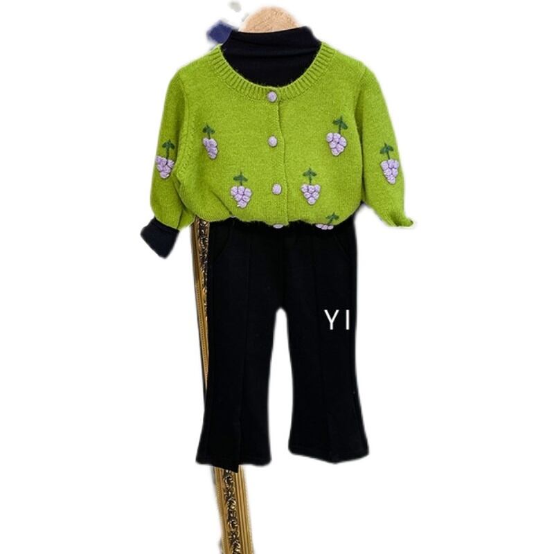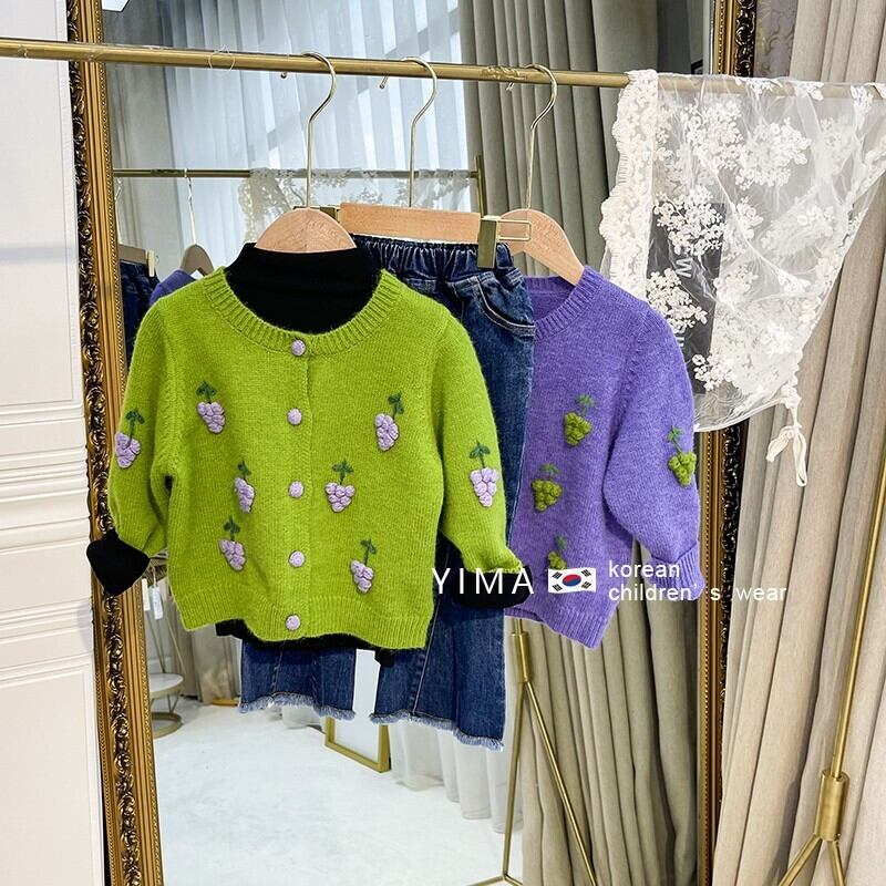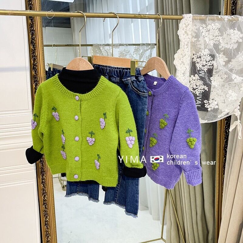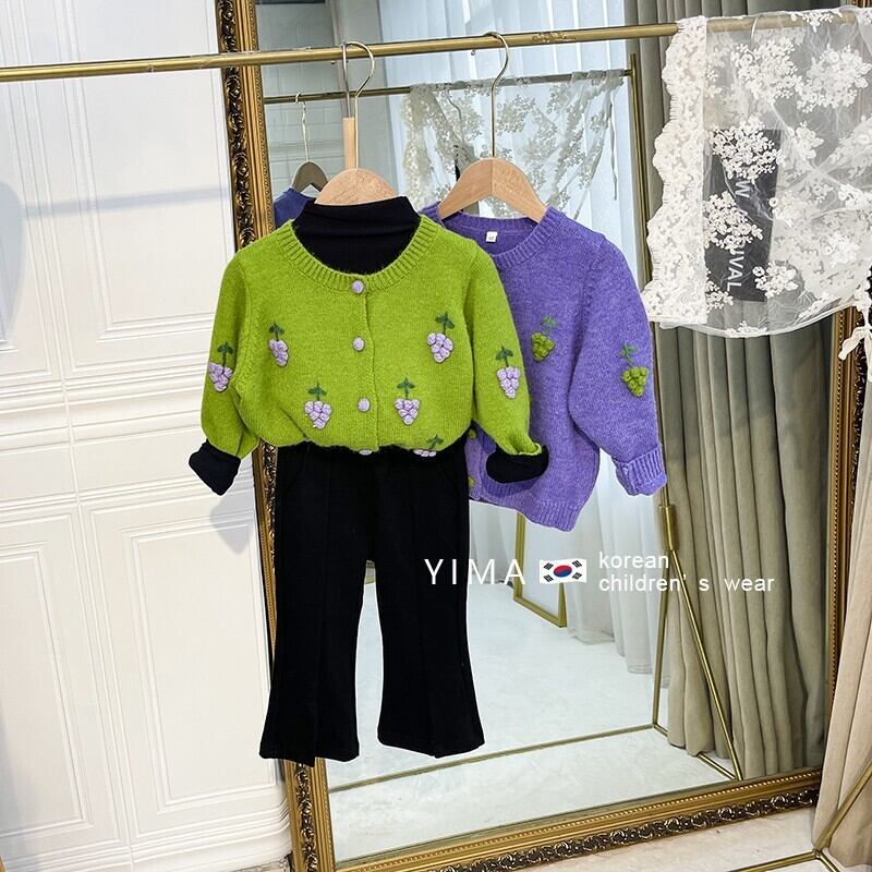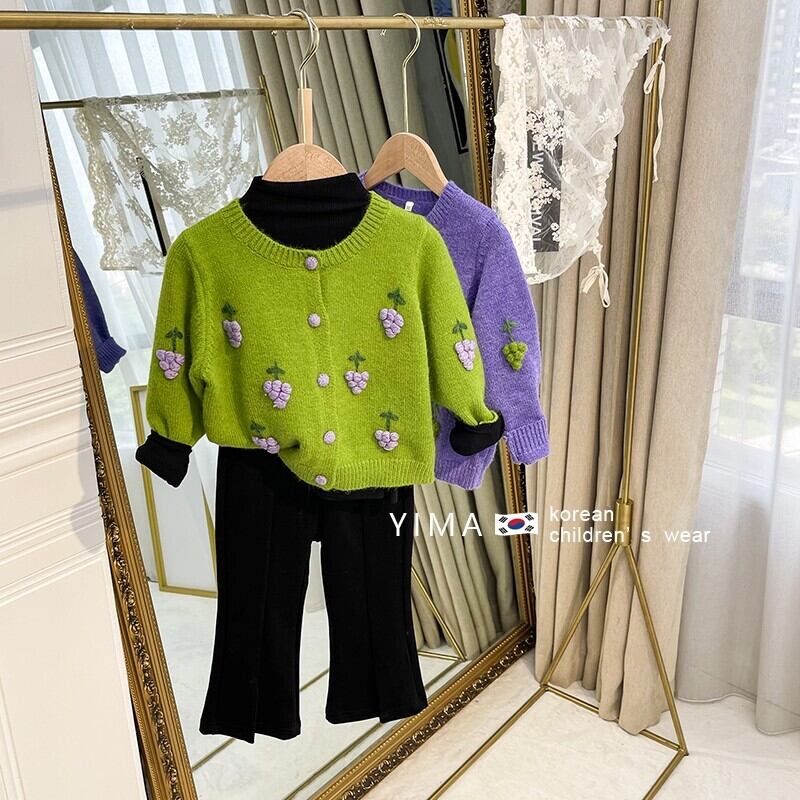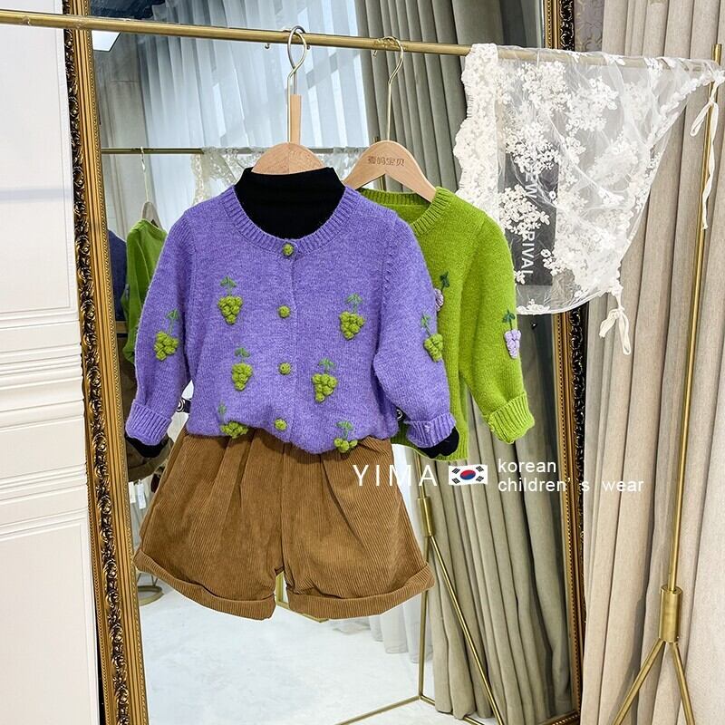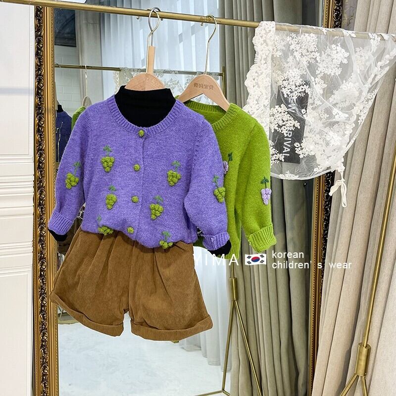 色:緑のブドウのセーター,紫ブドウのセーター,黒底シャツ,黒いズボン,ブルージーンズ,ブラウンショートパンツ