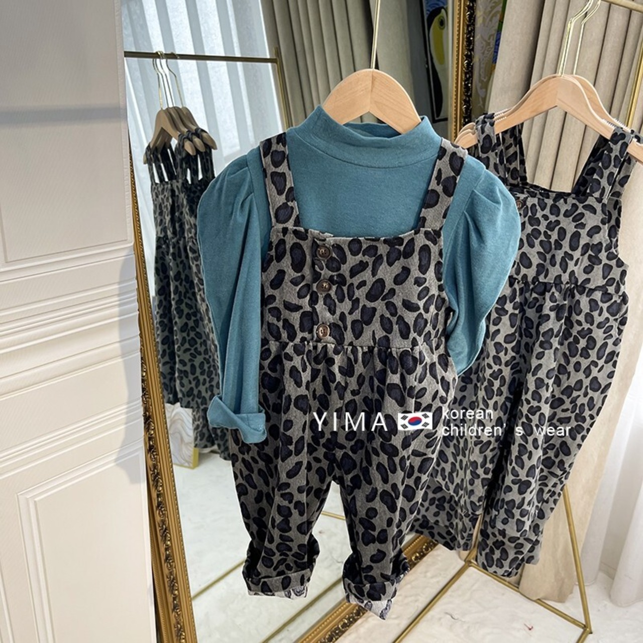 色:黒底シャツ,パフスリーブブルーボトミングシャツ,ヒョウ柄のオーバーオール,白のシャツ