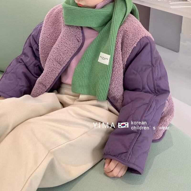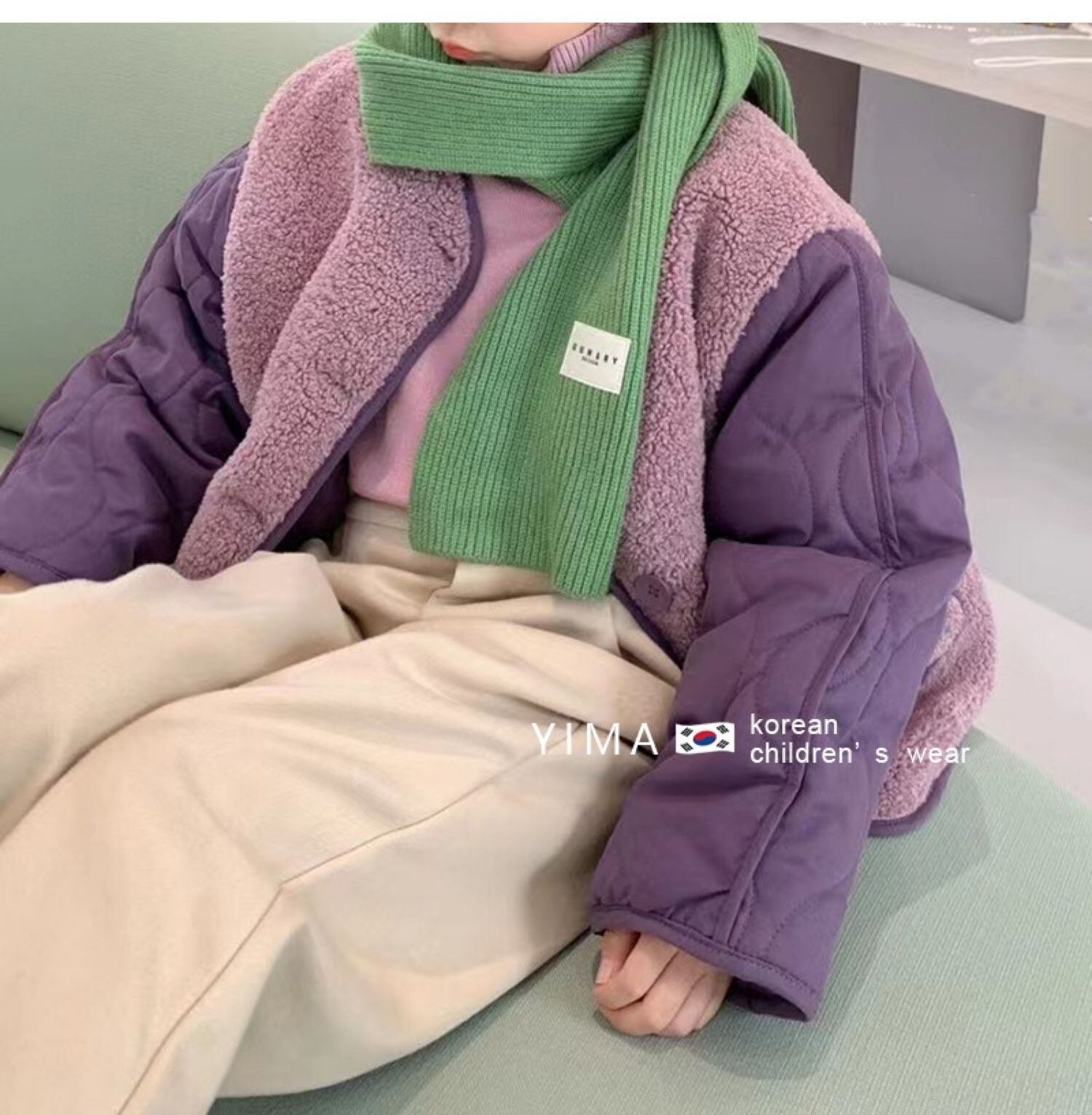 色:紫の綿のコート,ベージュパンツ,薄紫のボトミングシャツ