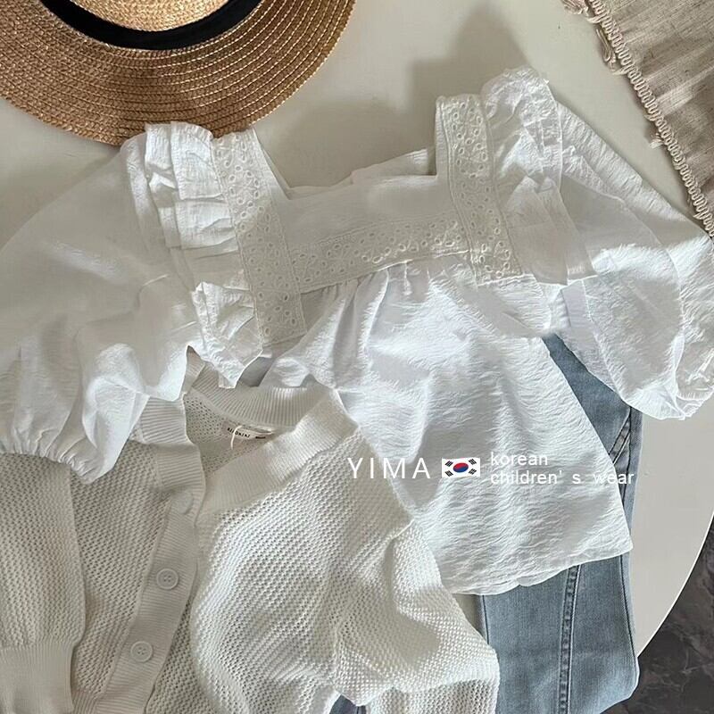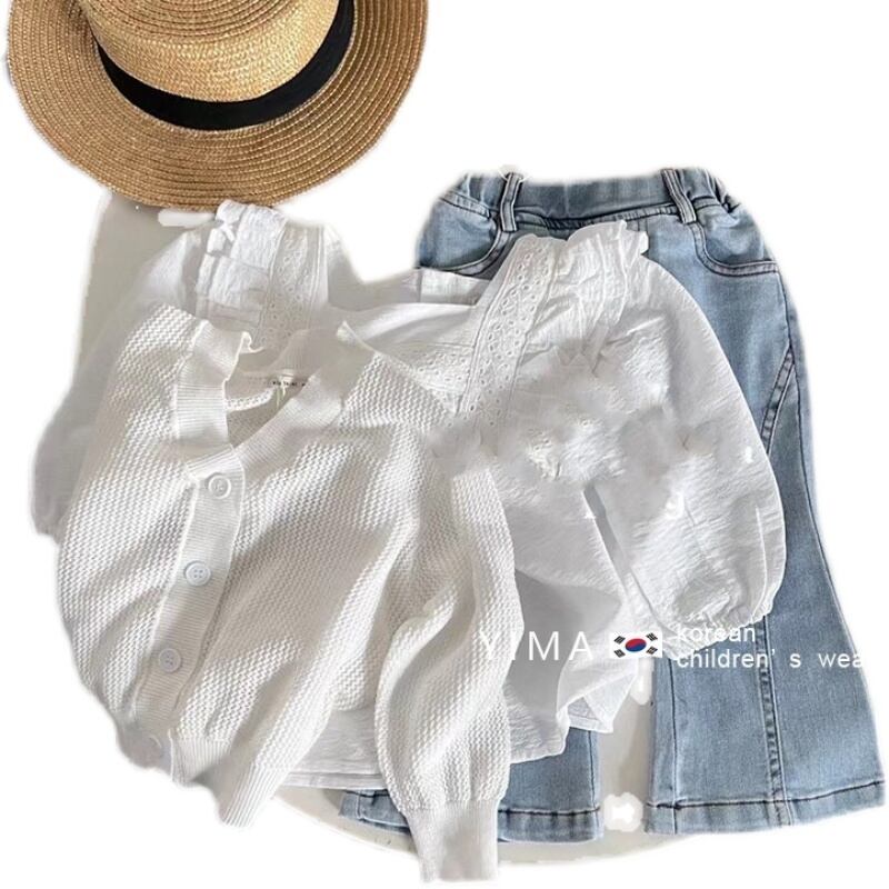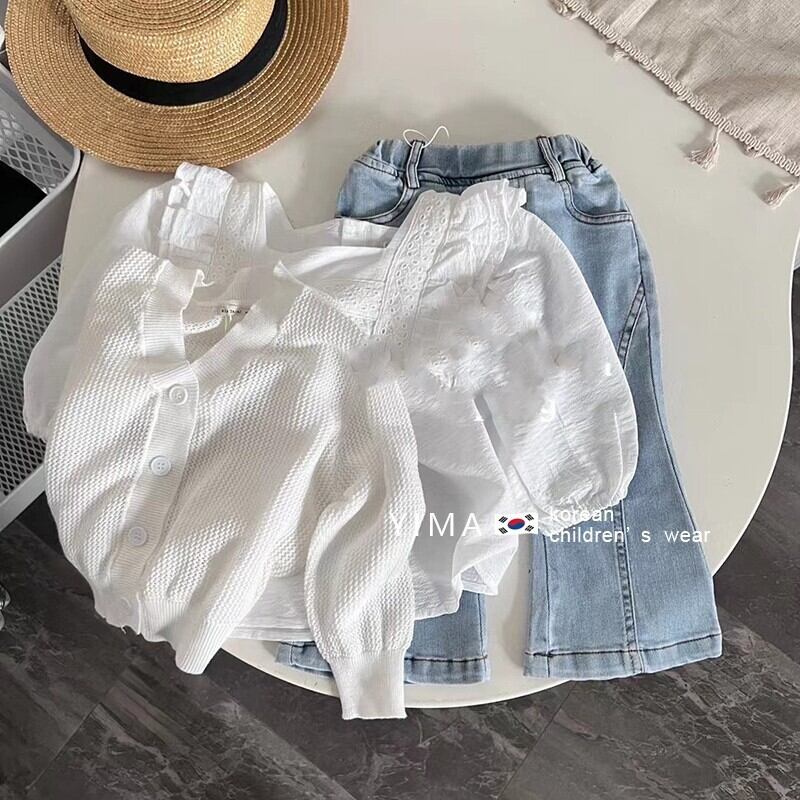 色:ホワイトスクエアカラーシャツ,ホワイトニットカーディガン,ライトブルージーンズ