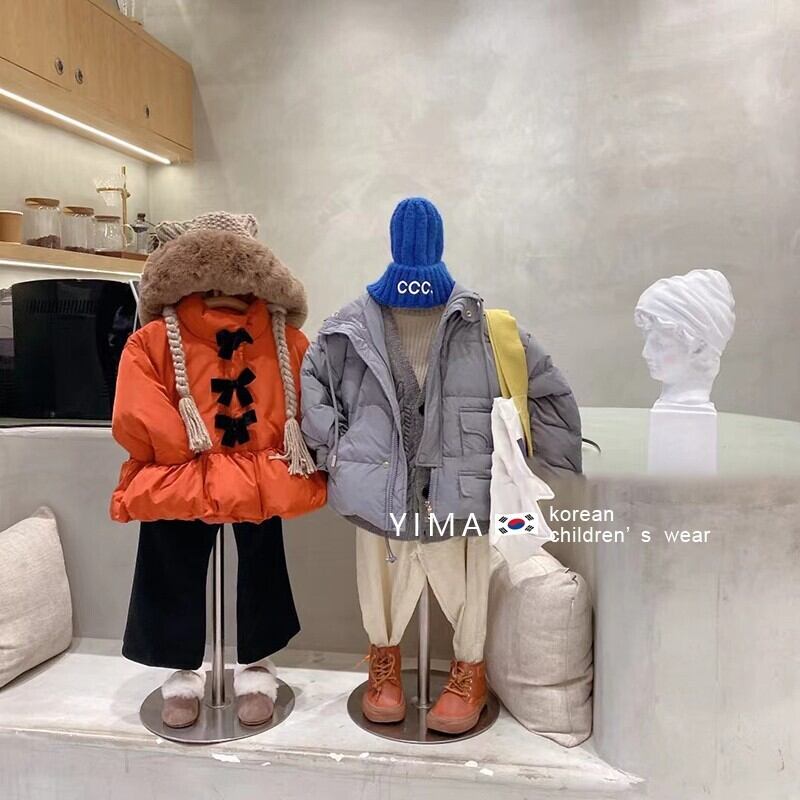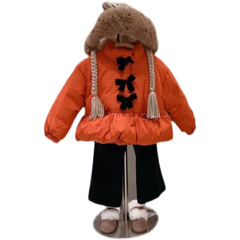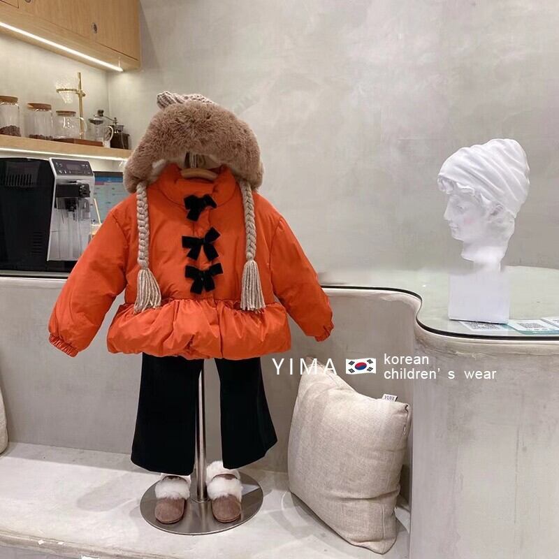 色:オレンジ色の赤い綿の服,黒いズボン