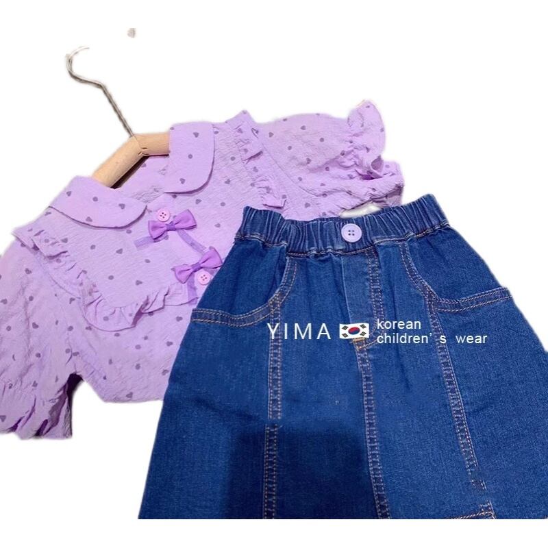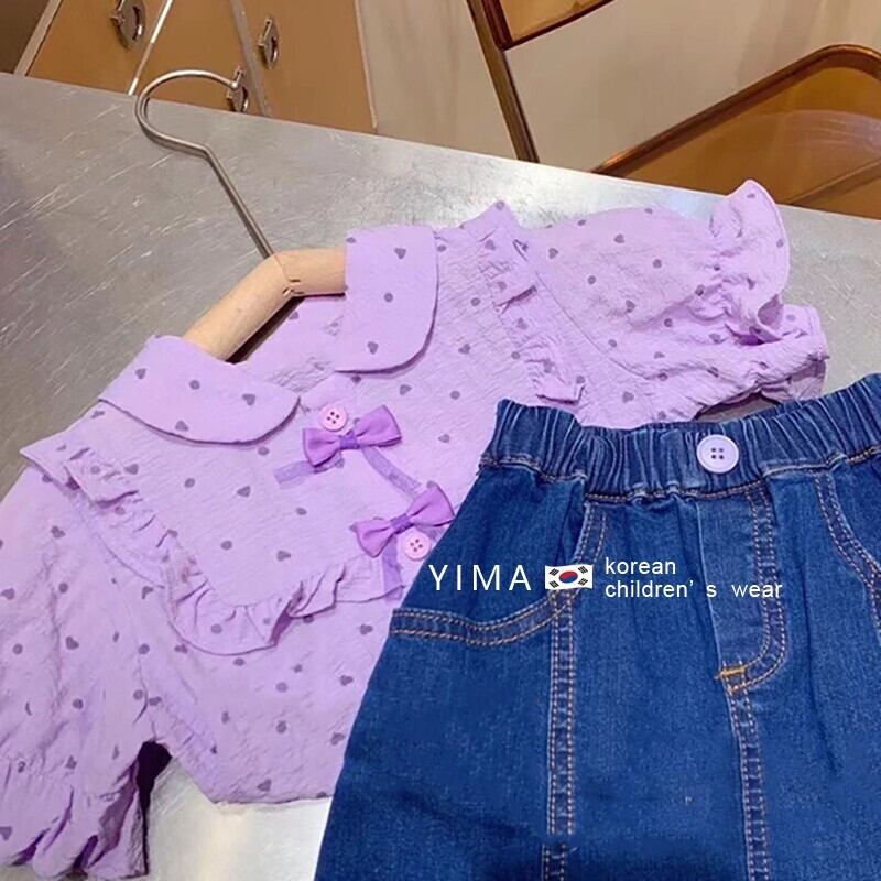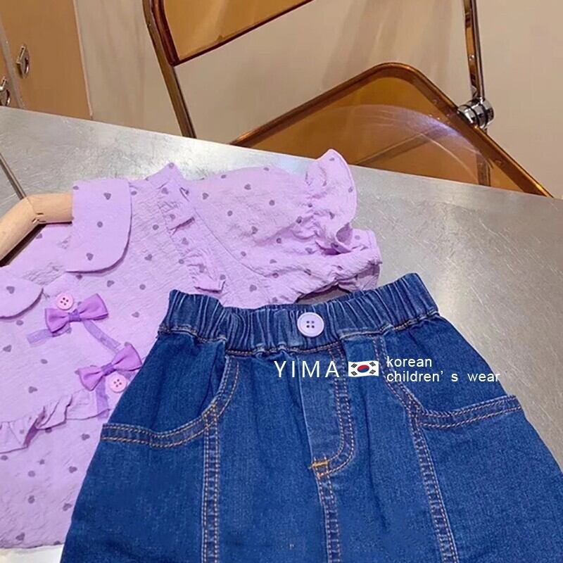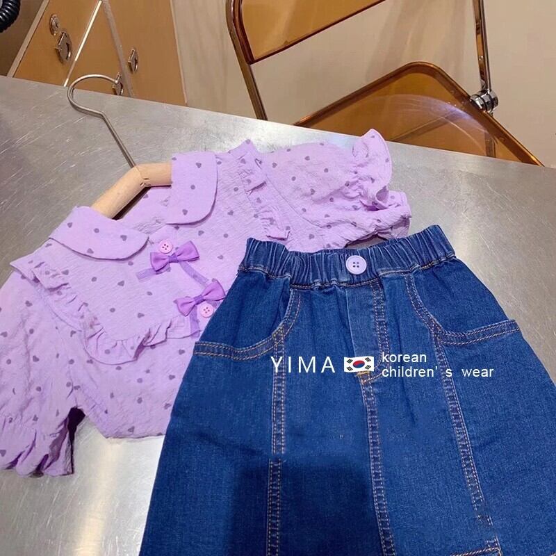 色:紫のシャツ,ブルーデニムスカート