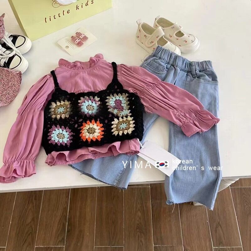 色:黒のニットベスト,紫のシャツ,ブルージーンズ