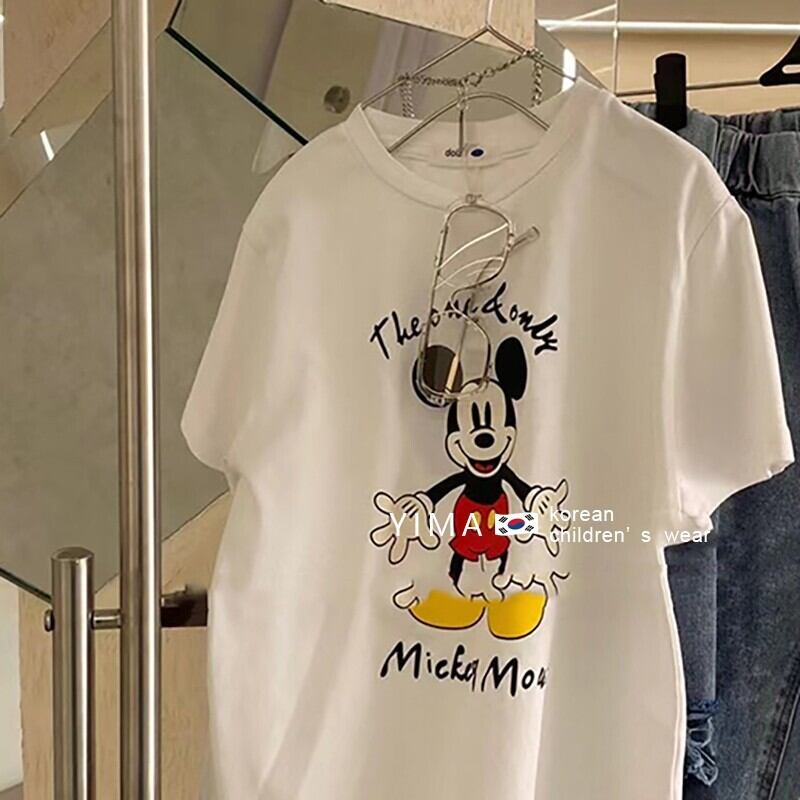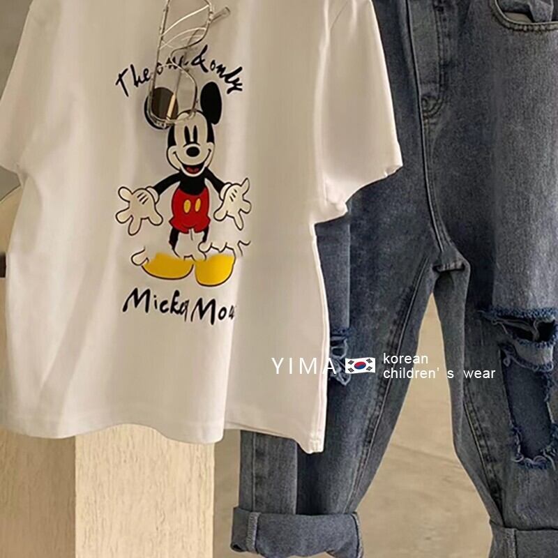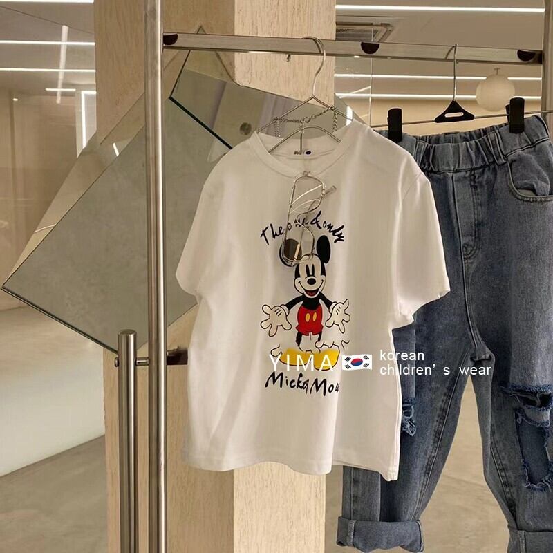 色:ホワイトミッキーTシャツ,グレージーンズ