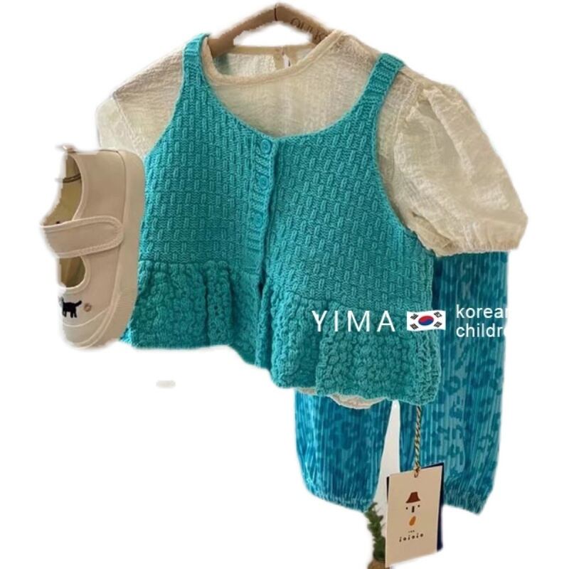 色:ベージュ半袖トップ,青パンツ,ブルーニットベスト