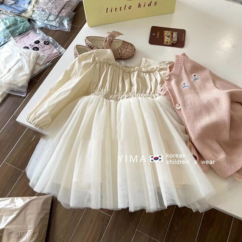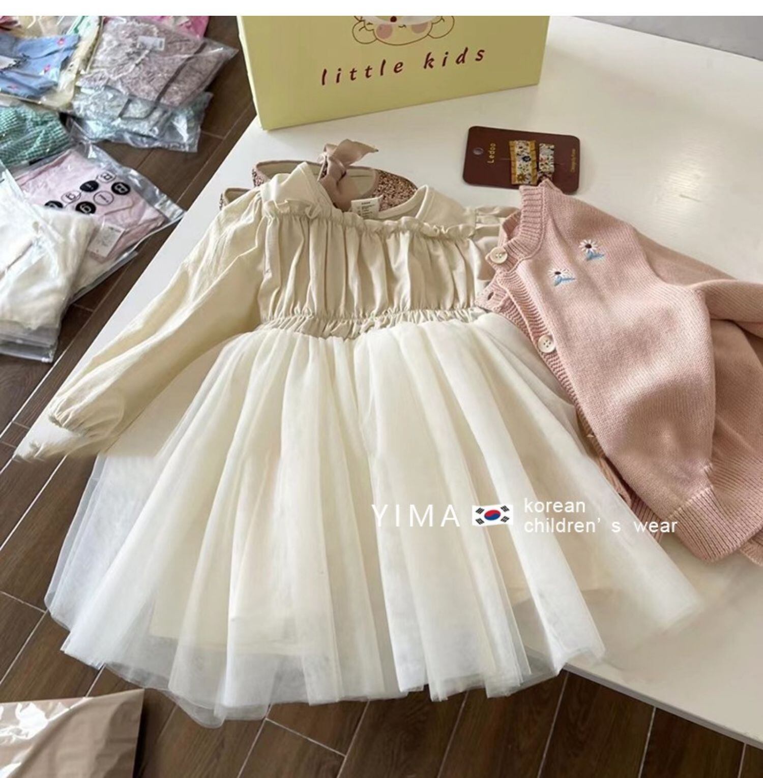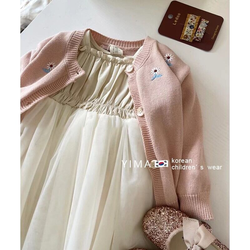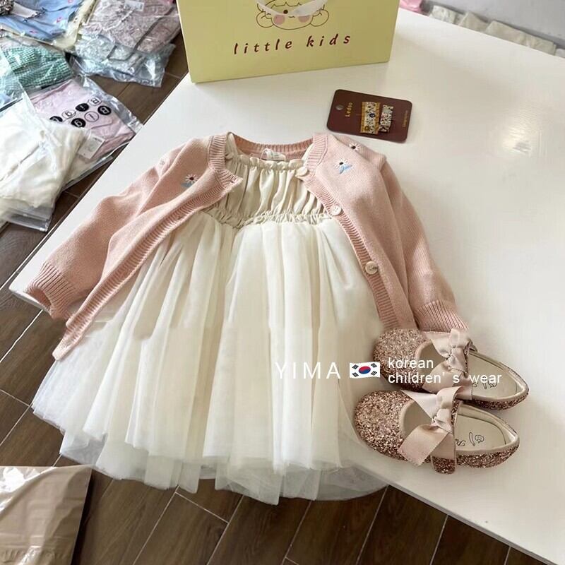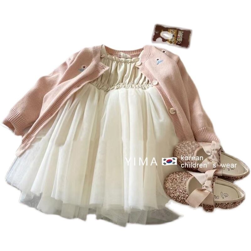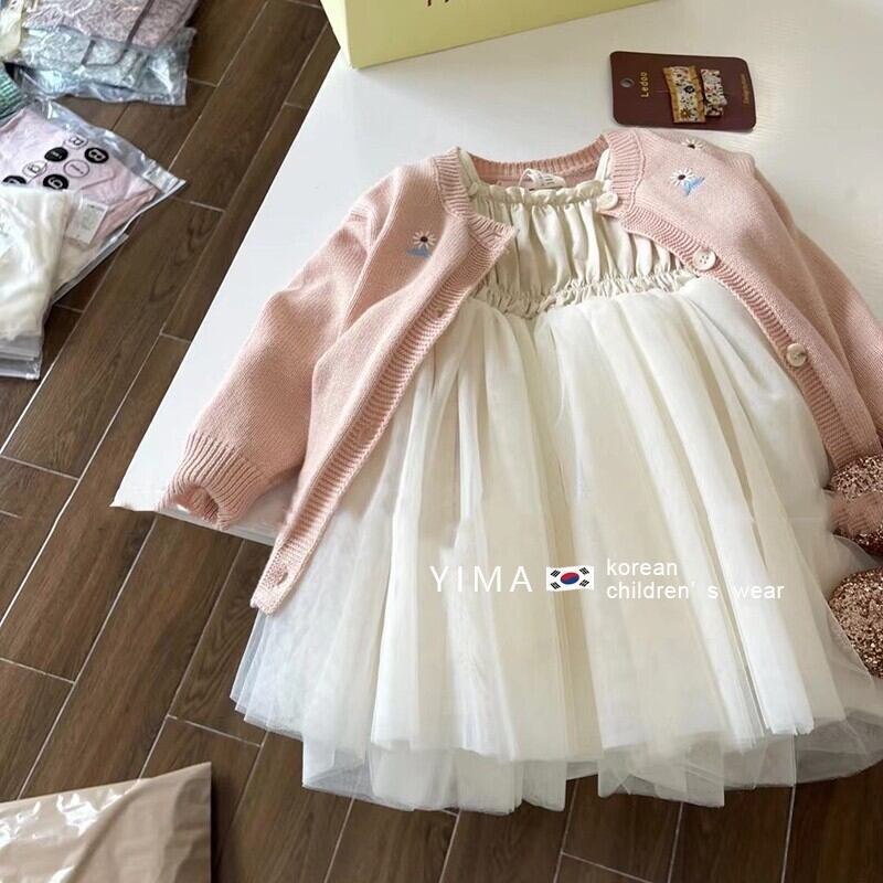 色:オフホワイトのメッシュスカート,薄ピンクのカーディガン
