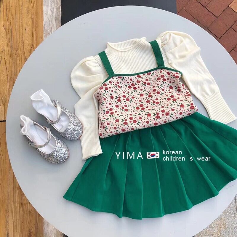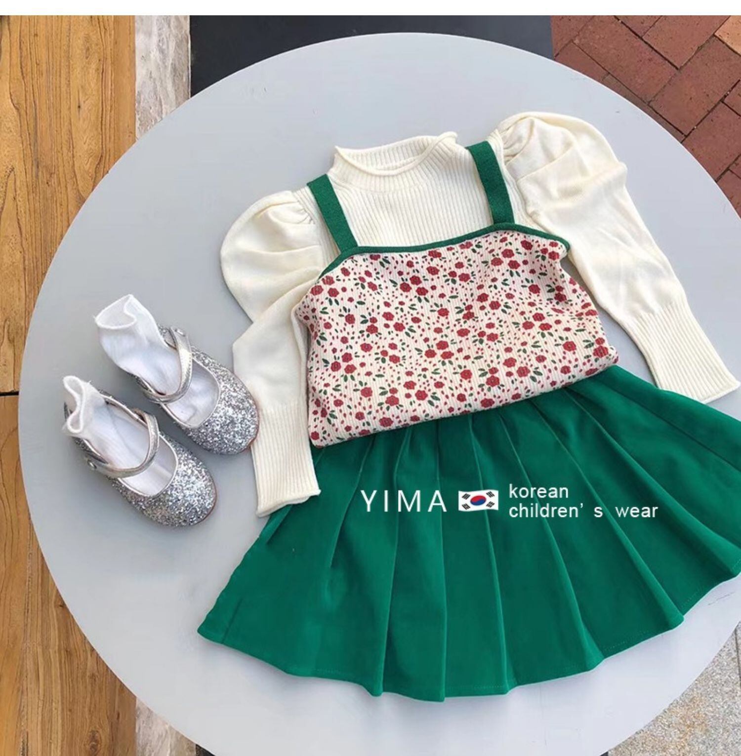 色:ピンクの花柄のベスト,緑のスカート,ホワイトボトミングシャツ
