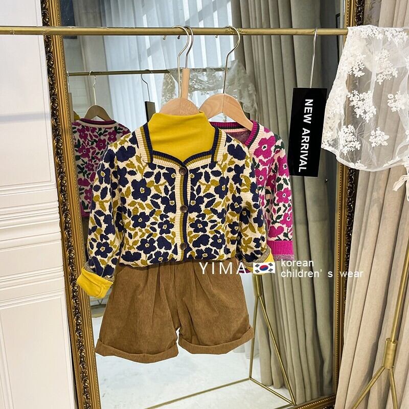 色:黄色い花のコート,紫の花のコート,ホワイトレースボトミングシャツ,青パンツ,黄色のボトミングシャツ,ブラウンショートパンツ