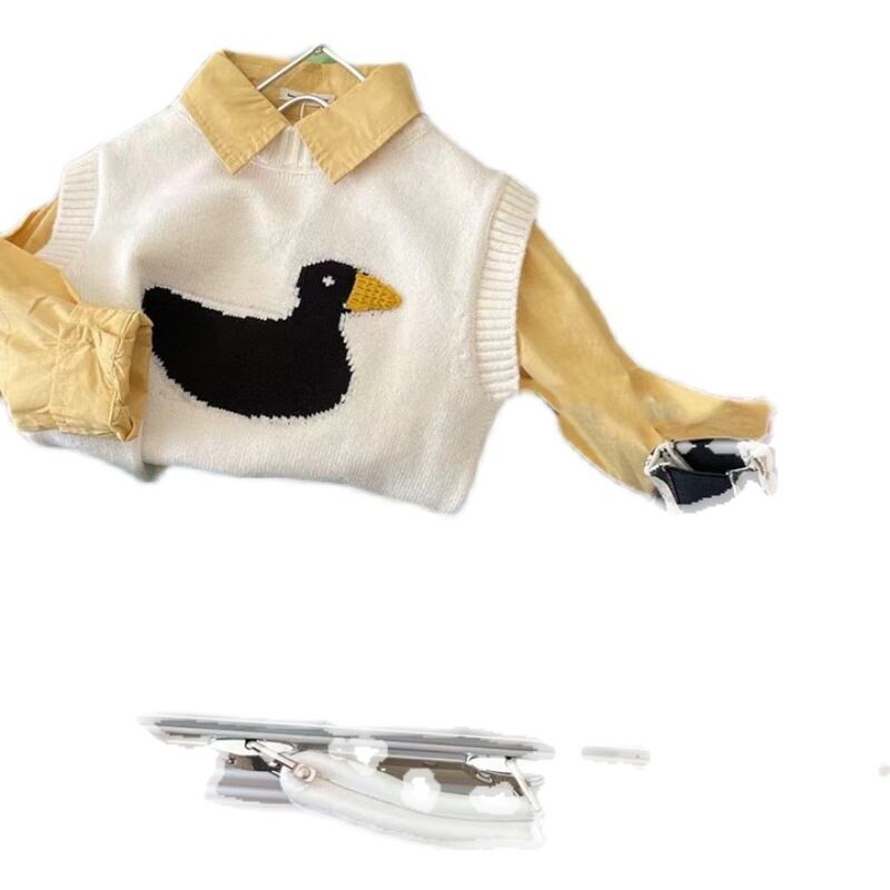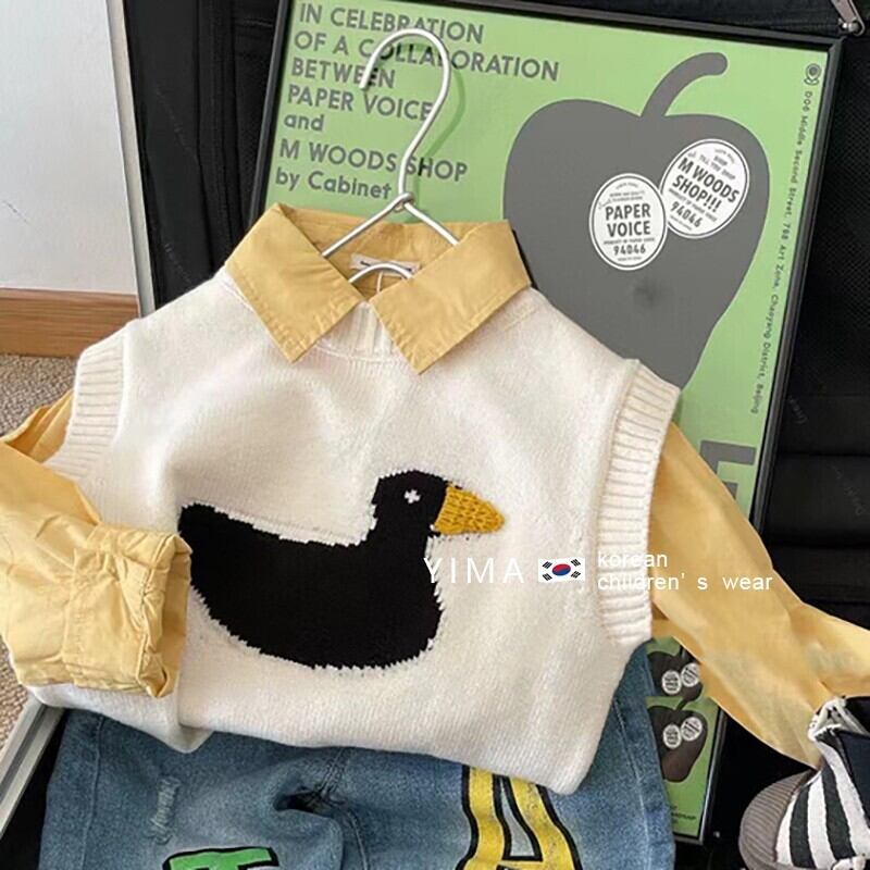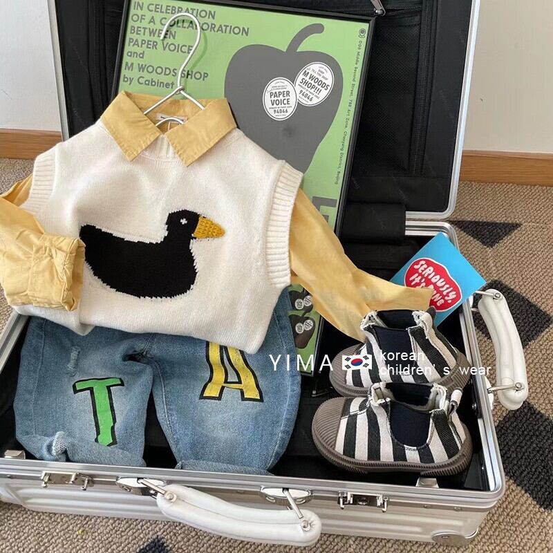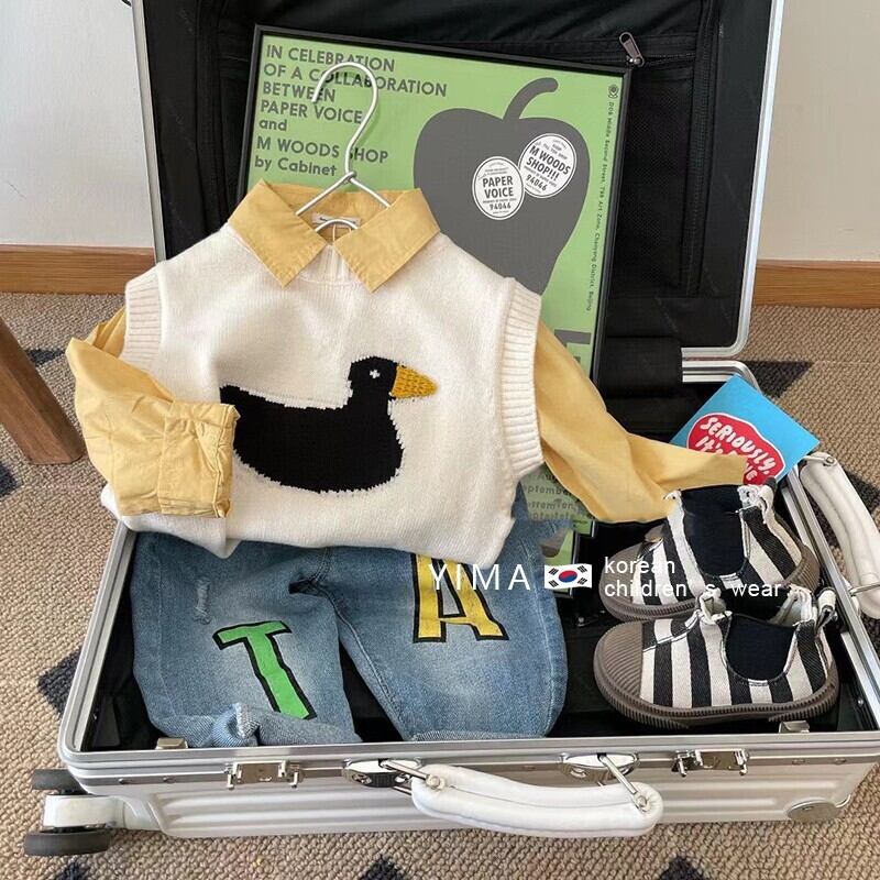 色:ホワイトニットベスト,黄色のシャツ,ブルージーンズ