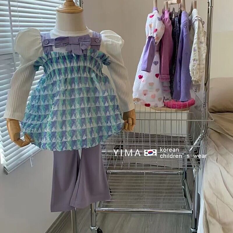 色:ブルーキャミソール,白い長袖,グレーパープルパンツ