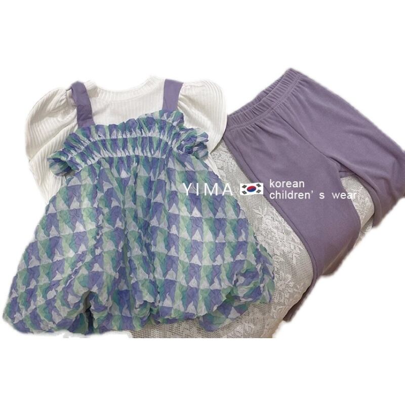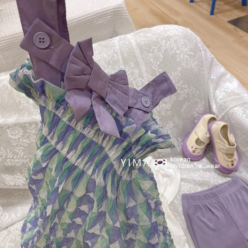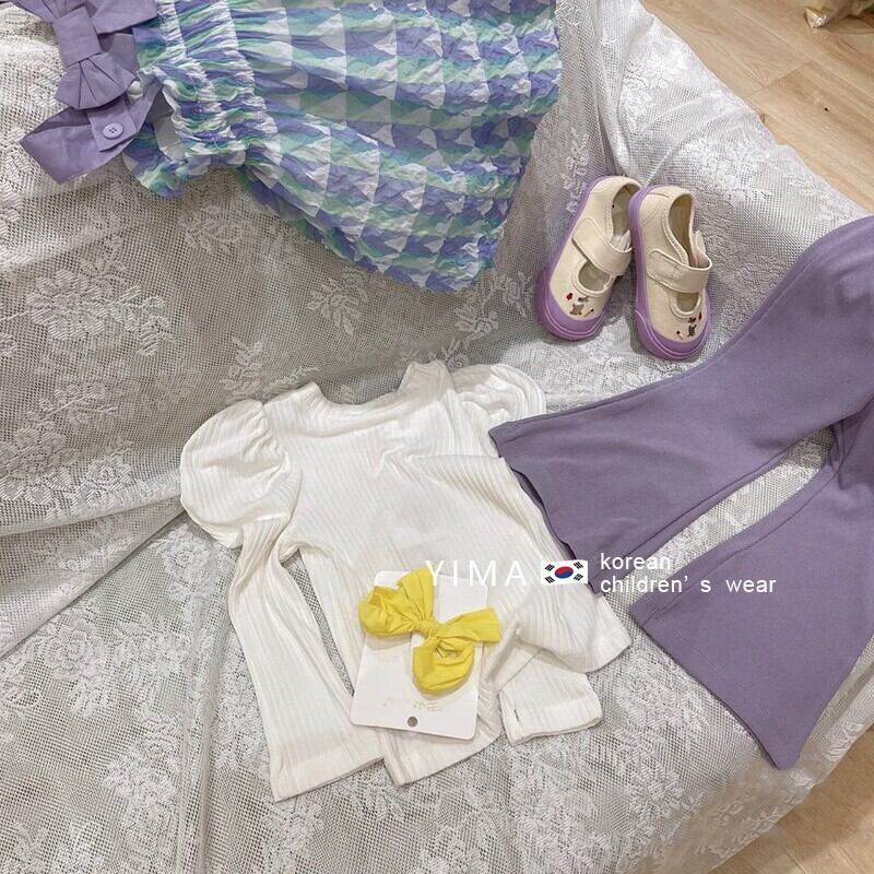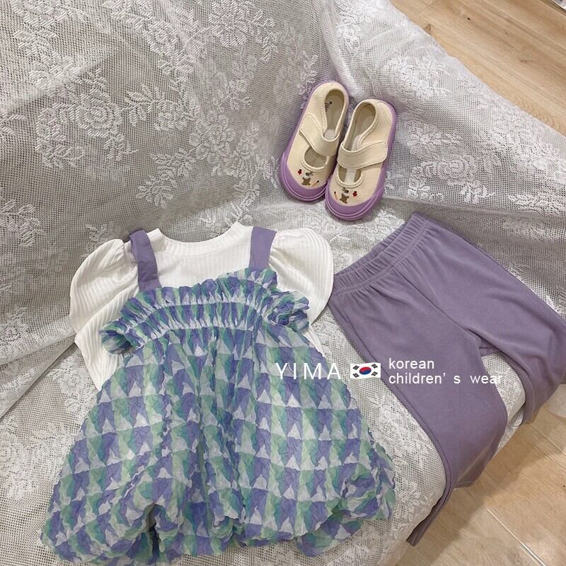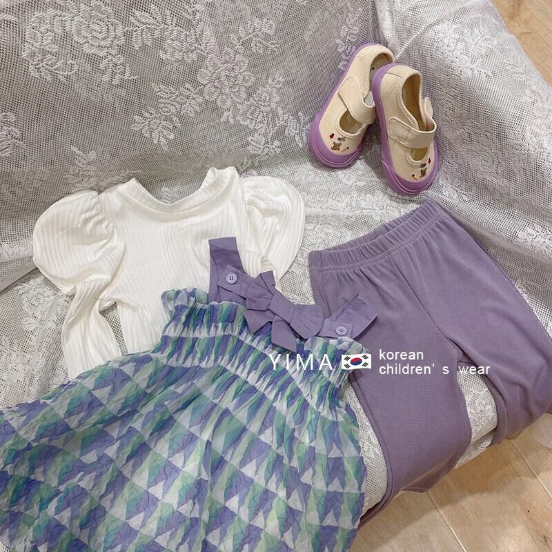 色:青いスリング,白い長袖,スモークパープルパンツ