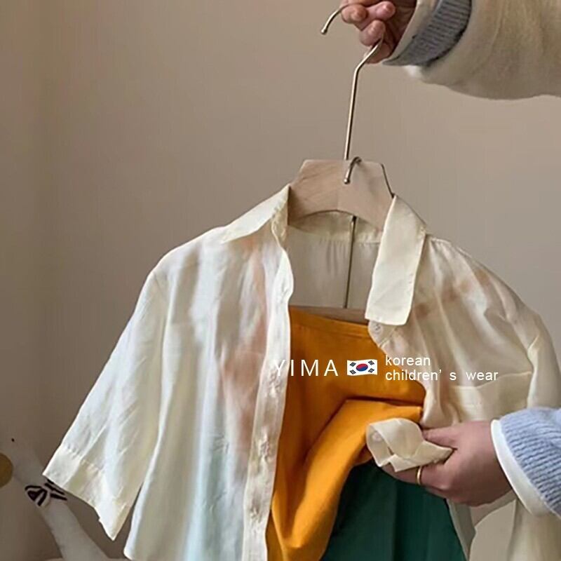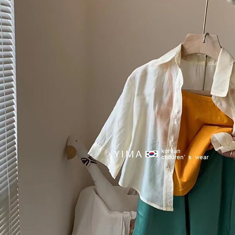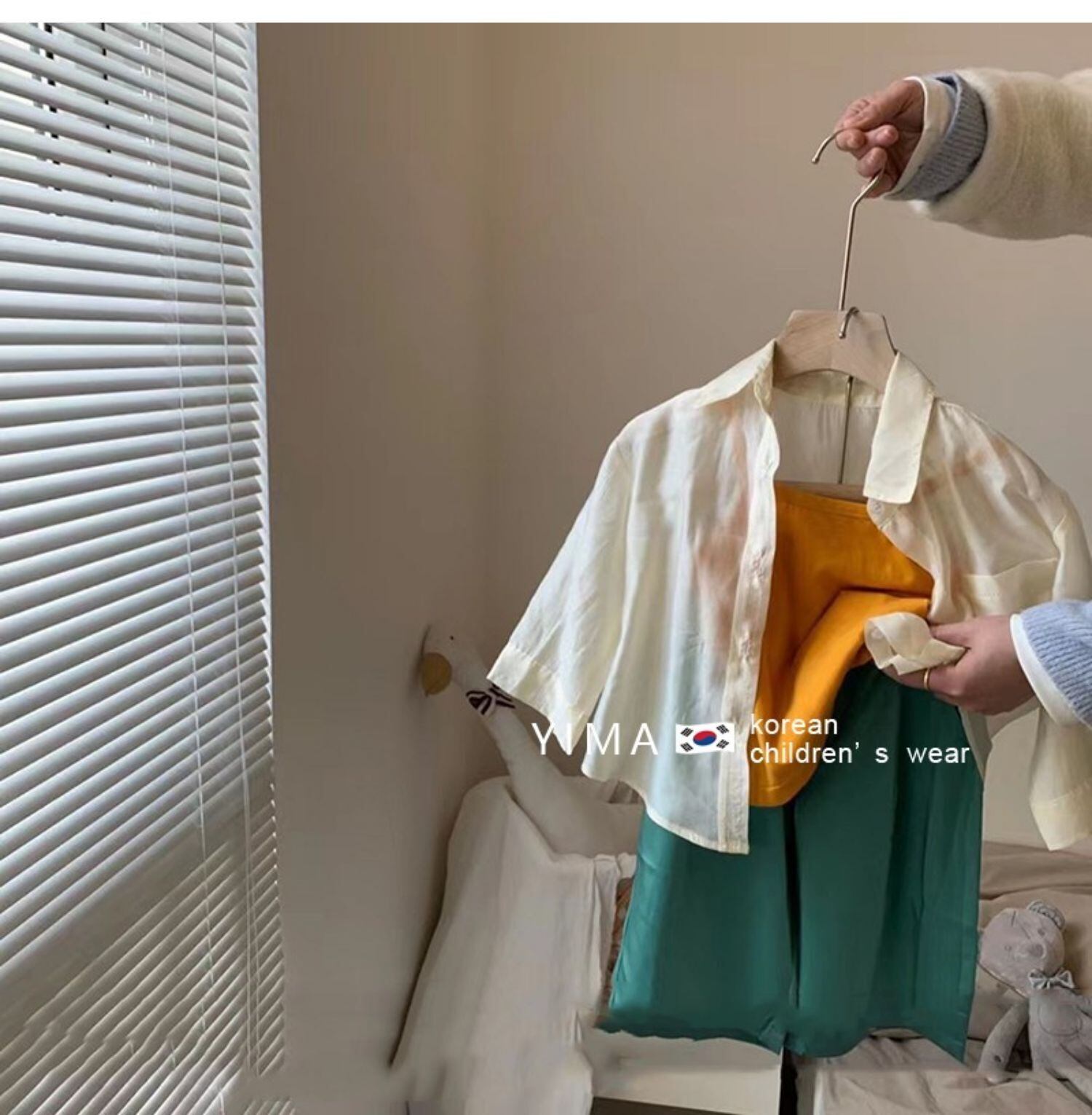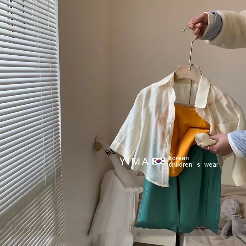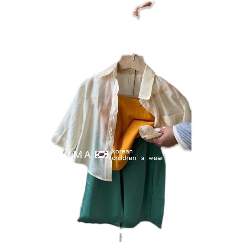 色:アプリコットシャツ+オレンジ色のサスペンダー,ヴィンテージグリーンワイドレッグパンツ