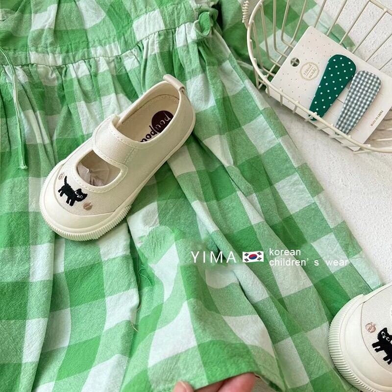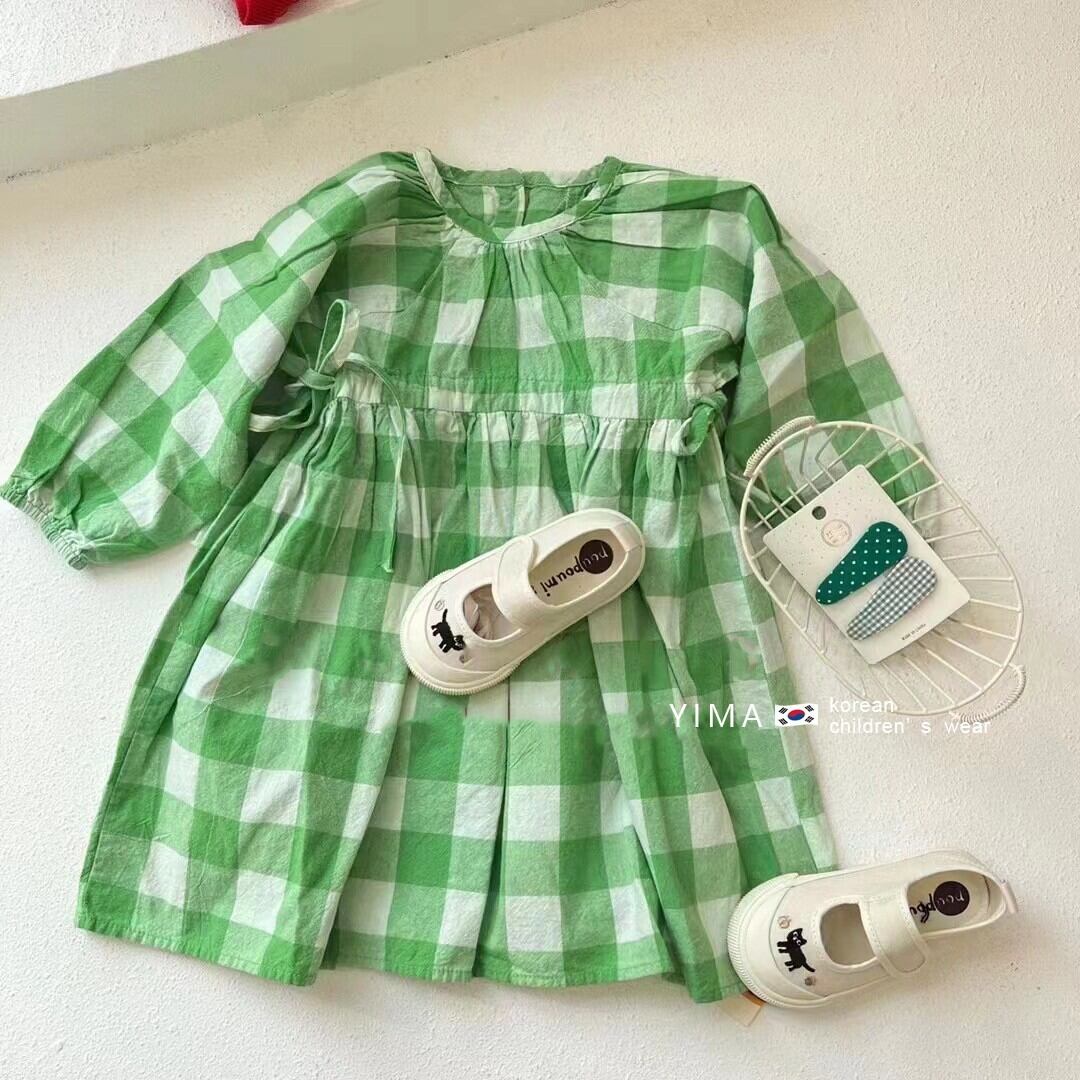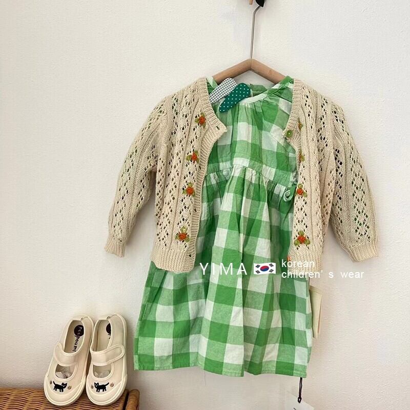 色:グリーンアップルグリーンチェック柄ワンピース,ベージュのニットカーディガン