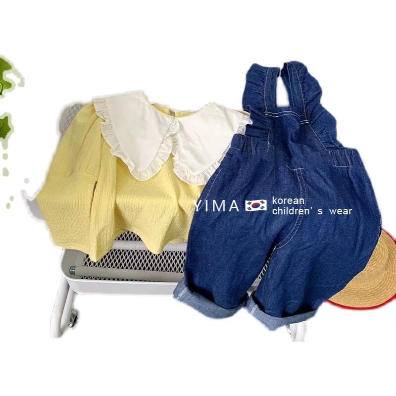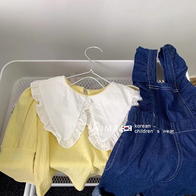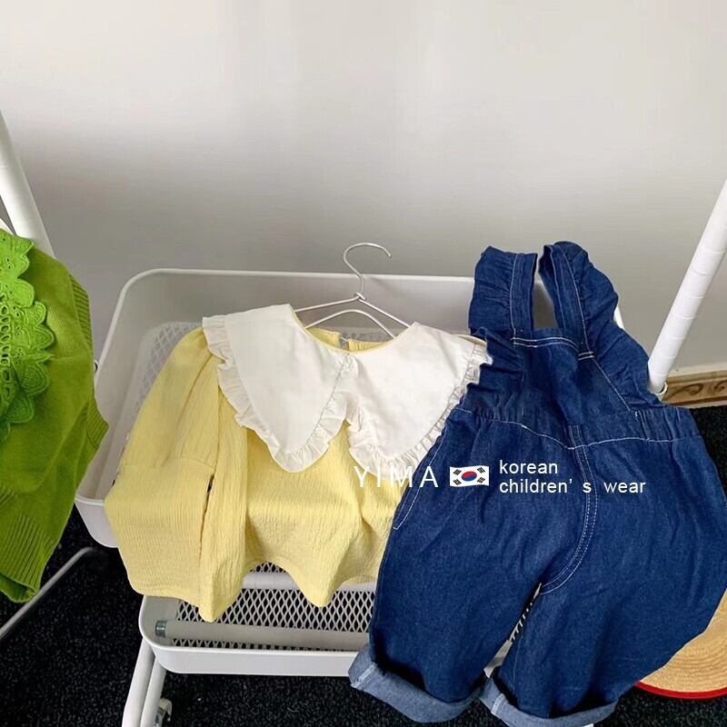 色:黄色のシャツ,ダークブルーのデニムオーバーオール