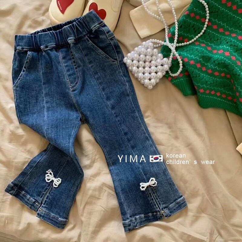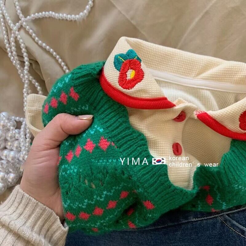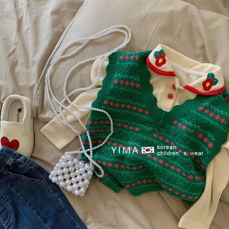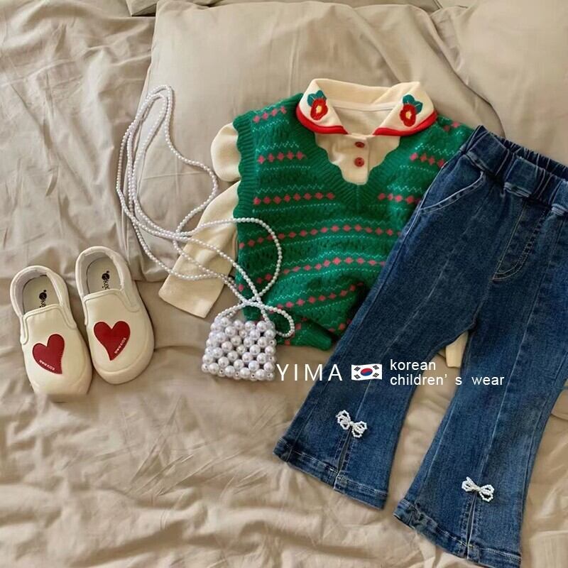 色:グリーンニットベスト,アプリコット刺繡トップス,ブルージーンズ