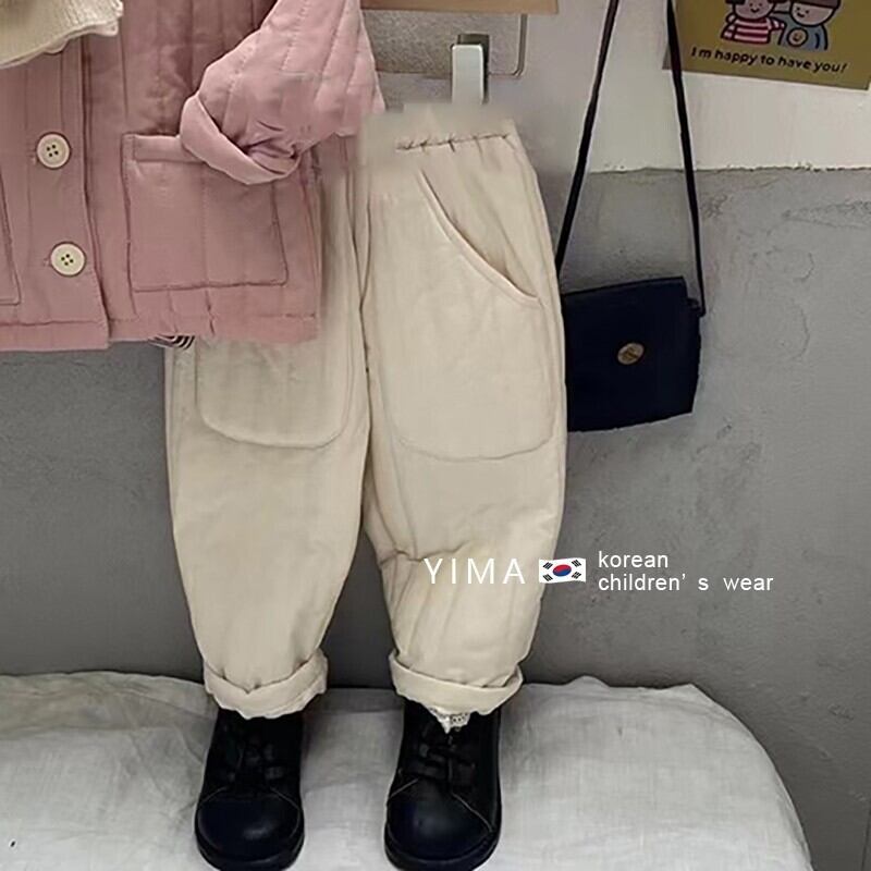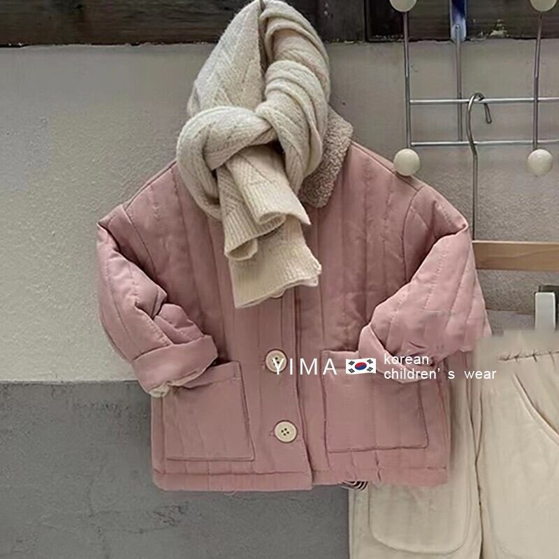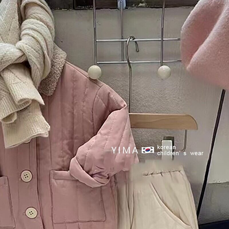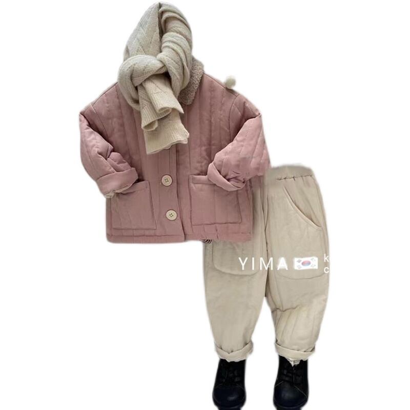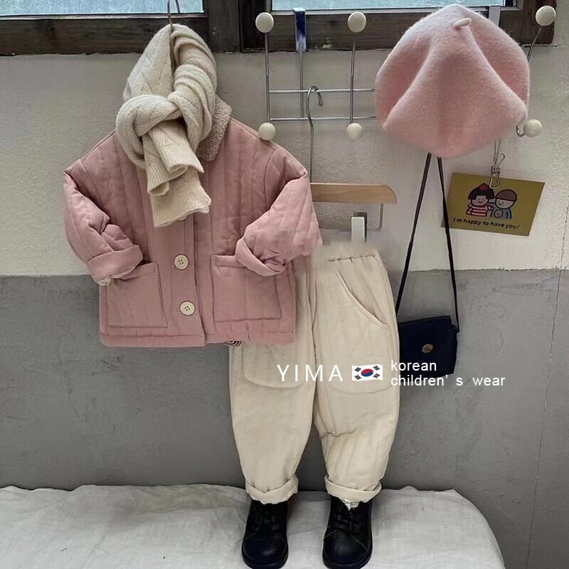 色:ピンクの綿のコート,ベージュコットンパンツ