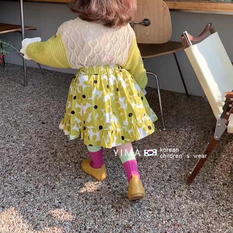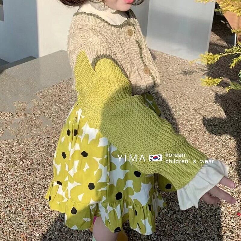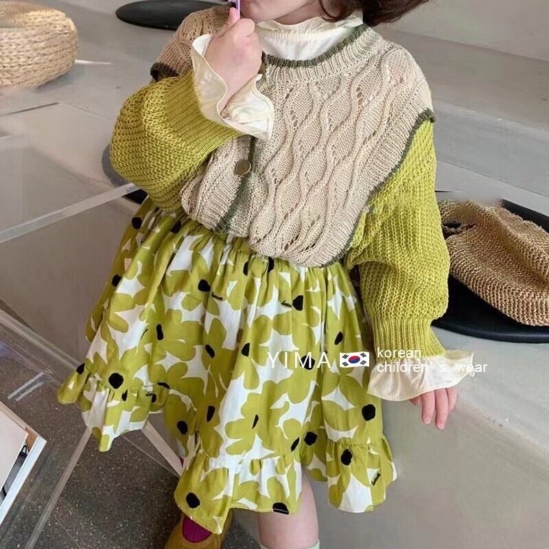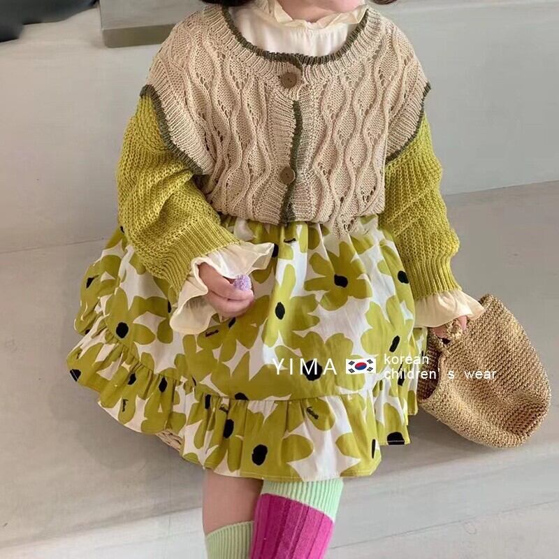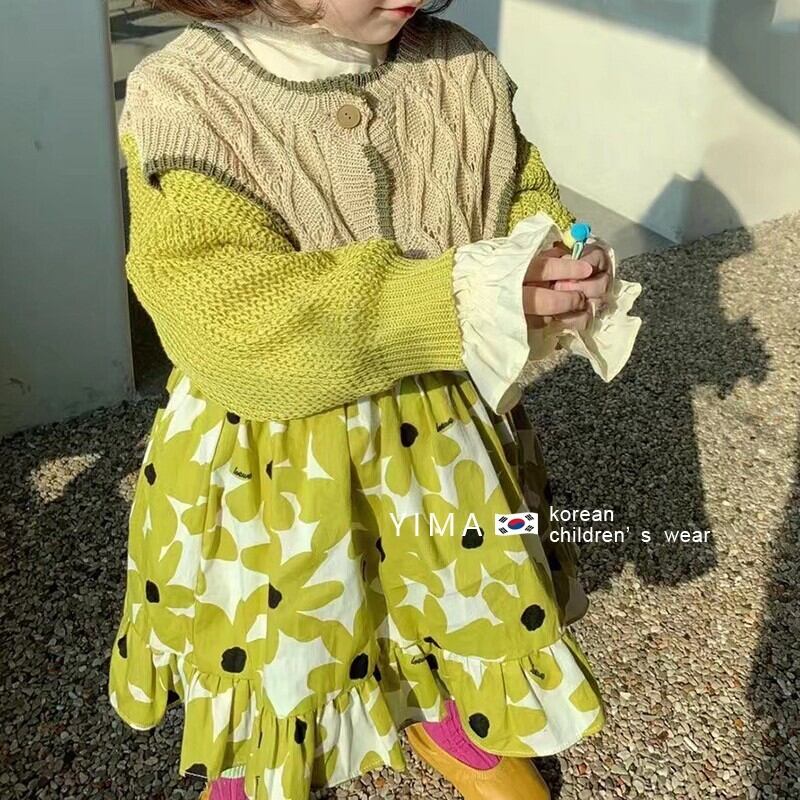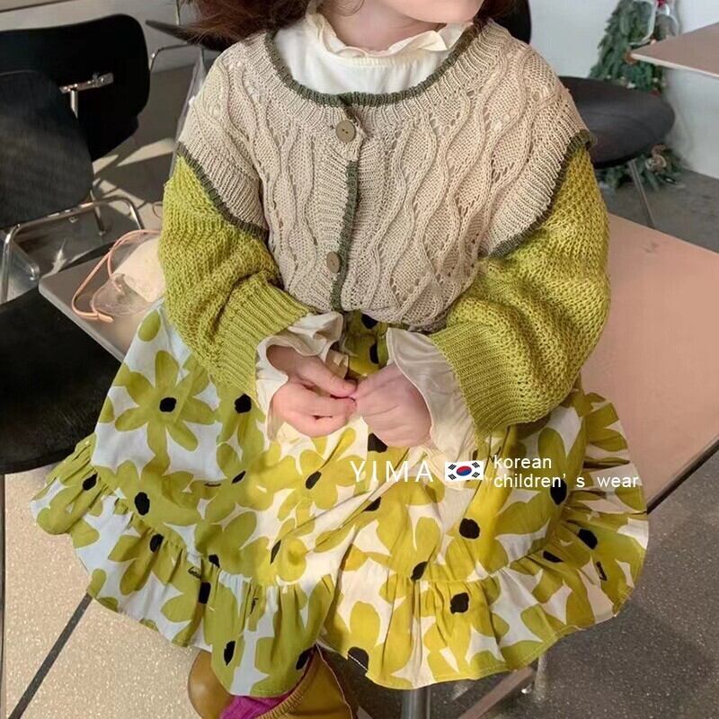 色:アプリコットグリーンカラーブロックセーターカーディガン,ベージュのボトミングシャツ,緑のスカート