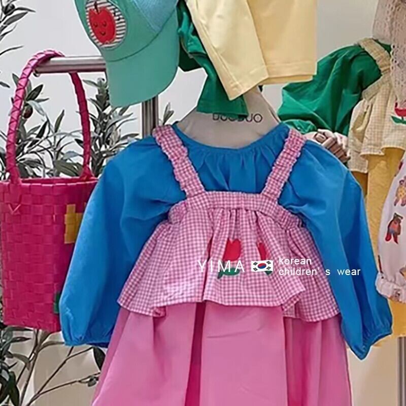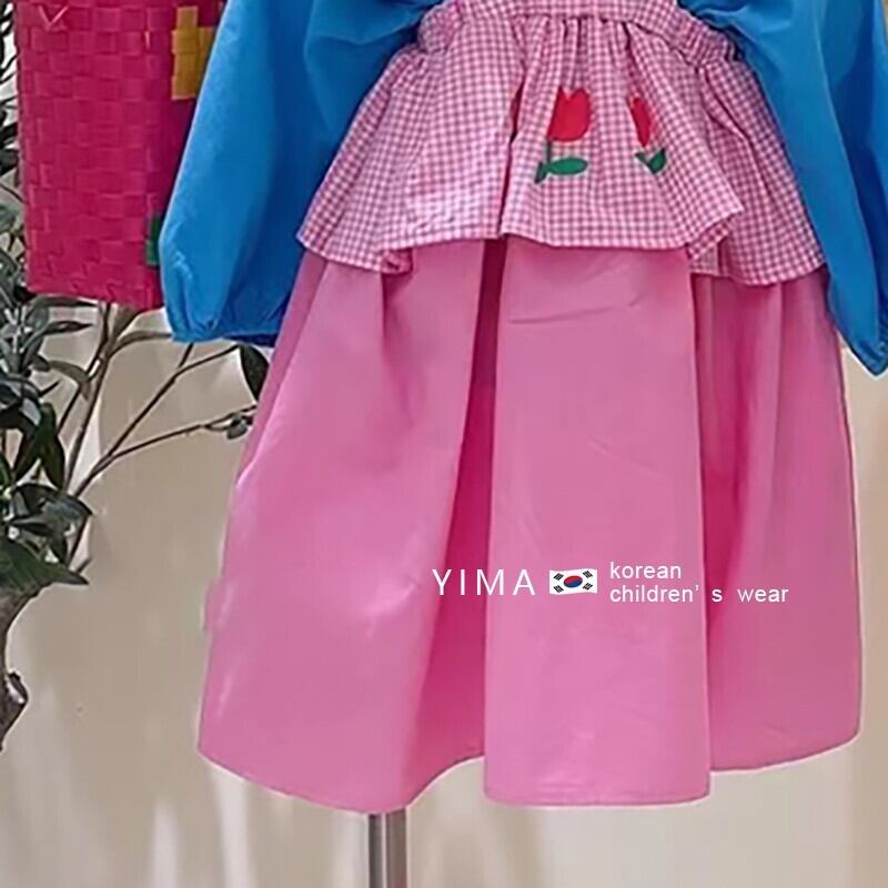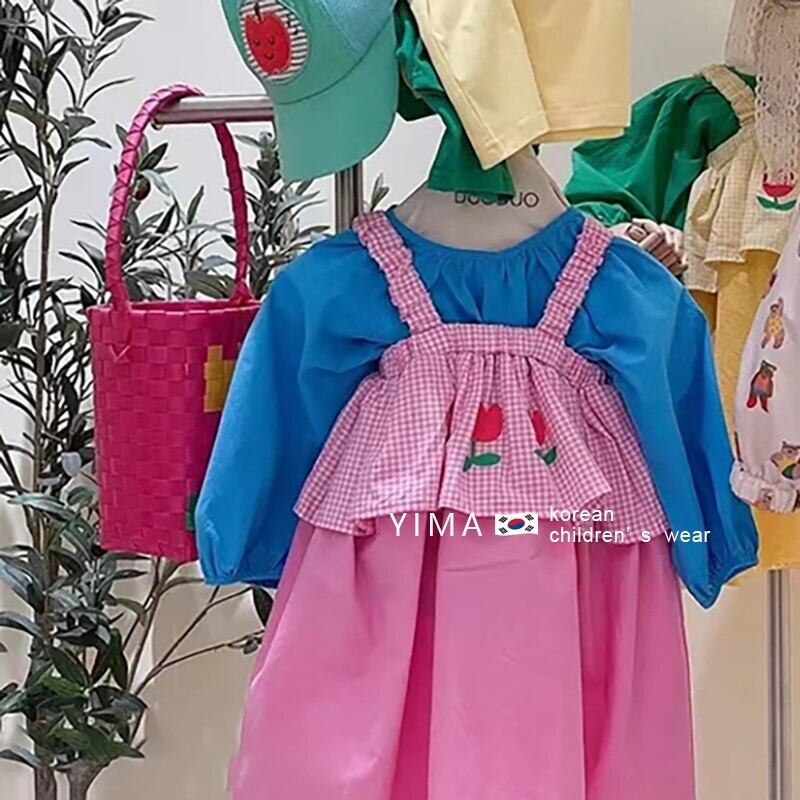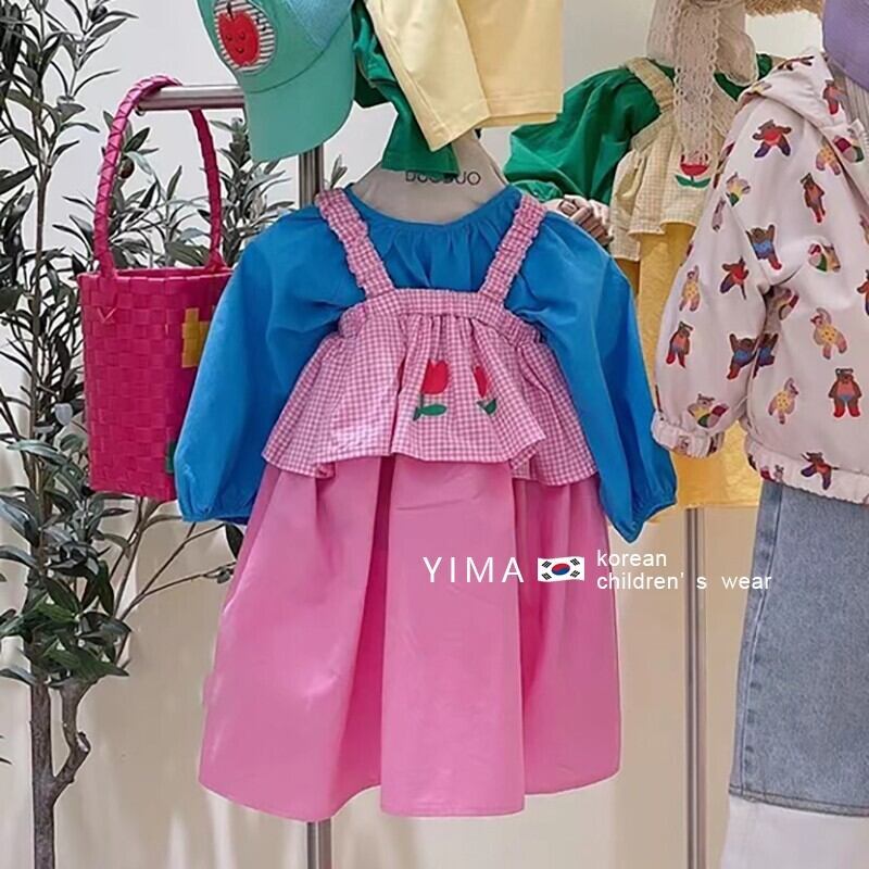 色:ピンクのサスペンダードレス,青いシャツ