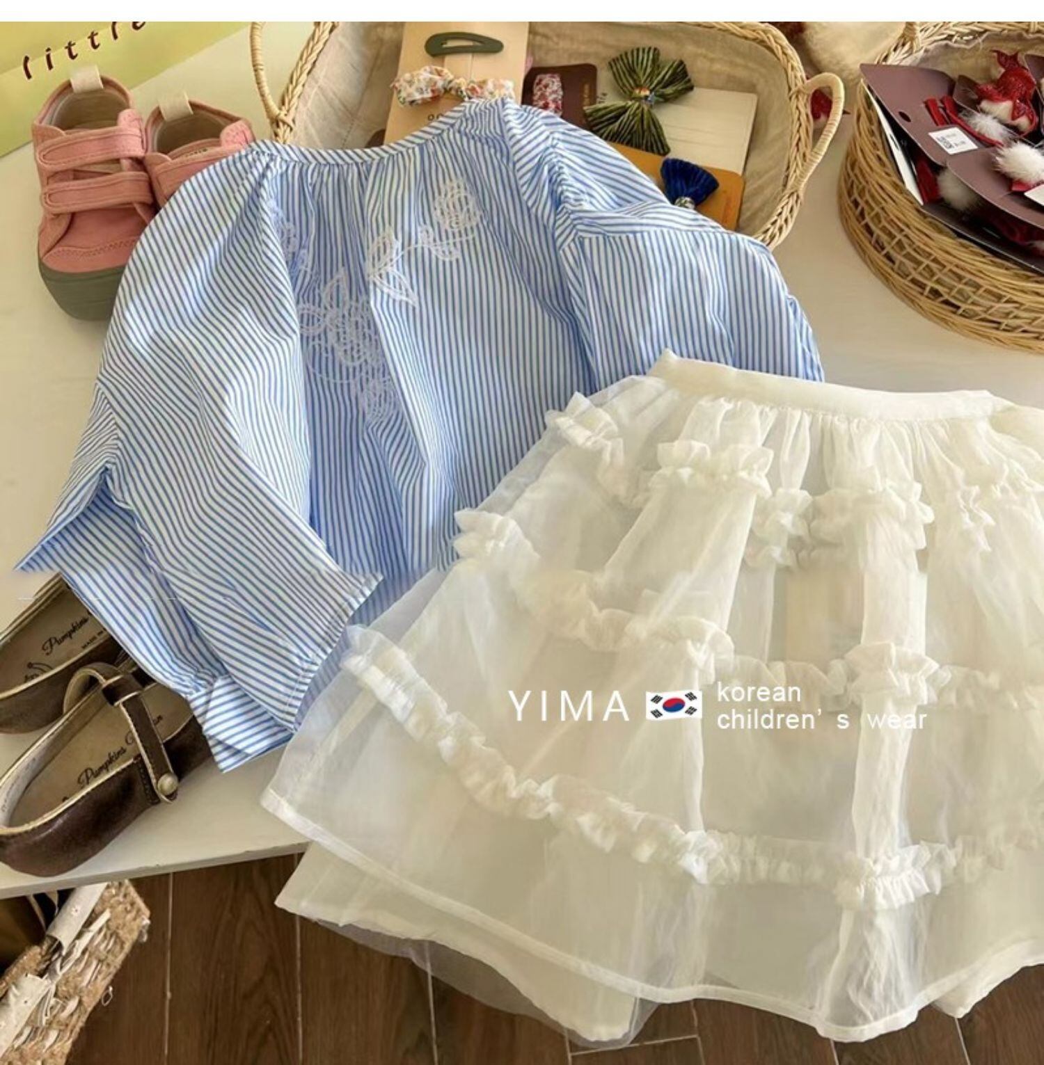 色:ブルーストライプシャツ,白いスカート