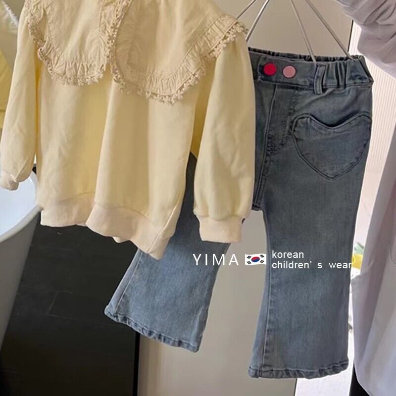 色:ベージュラージラペルトップ,ブルージーンズ