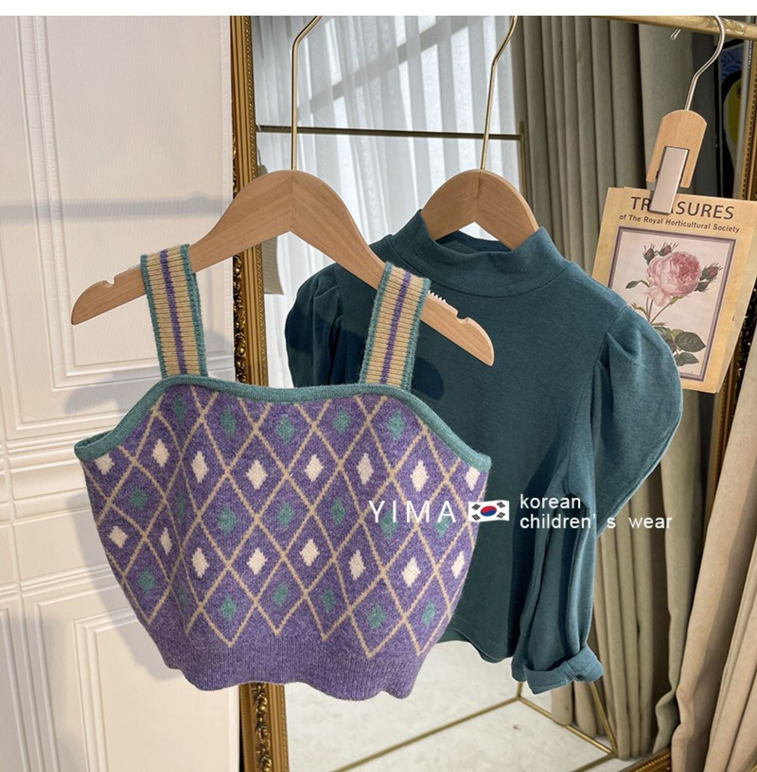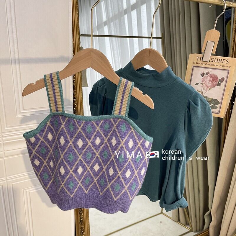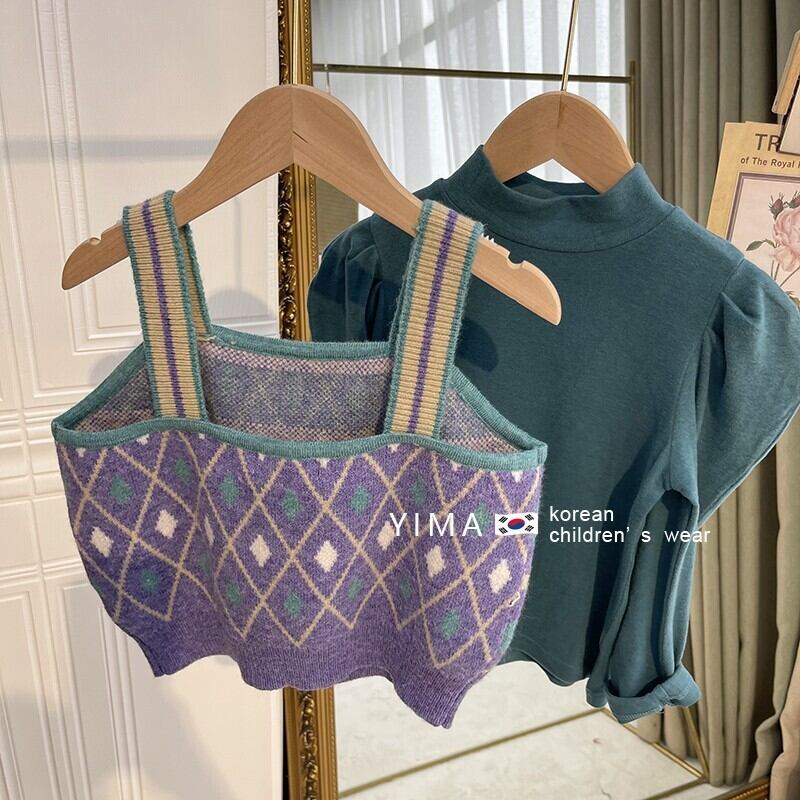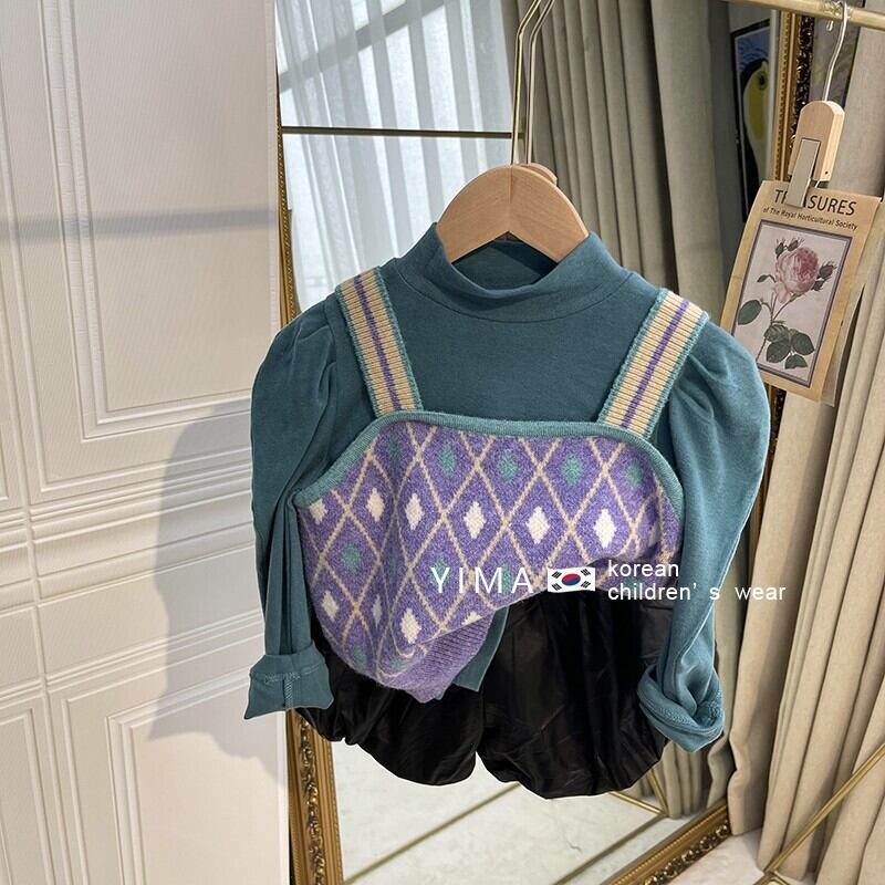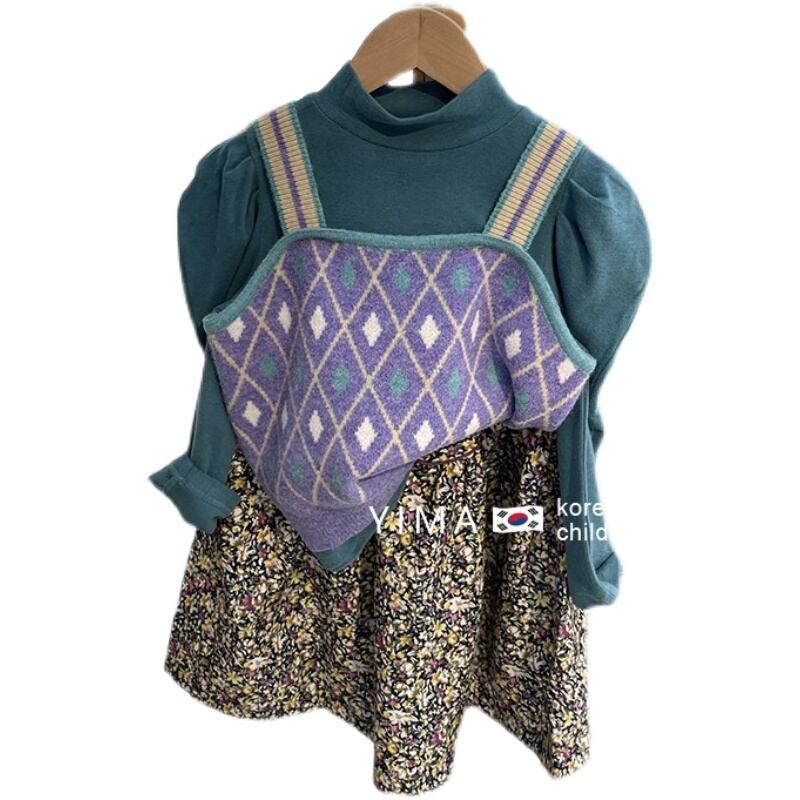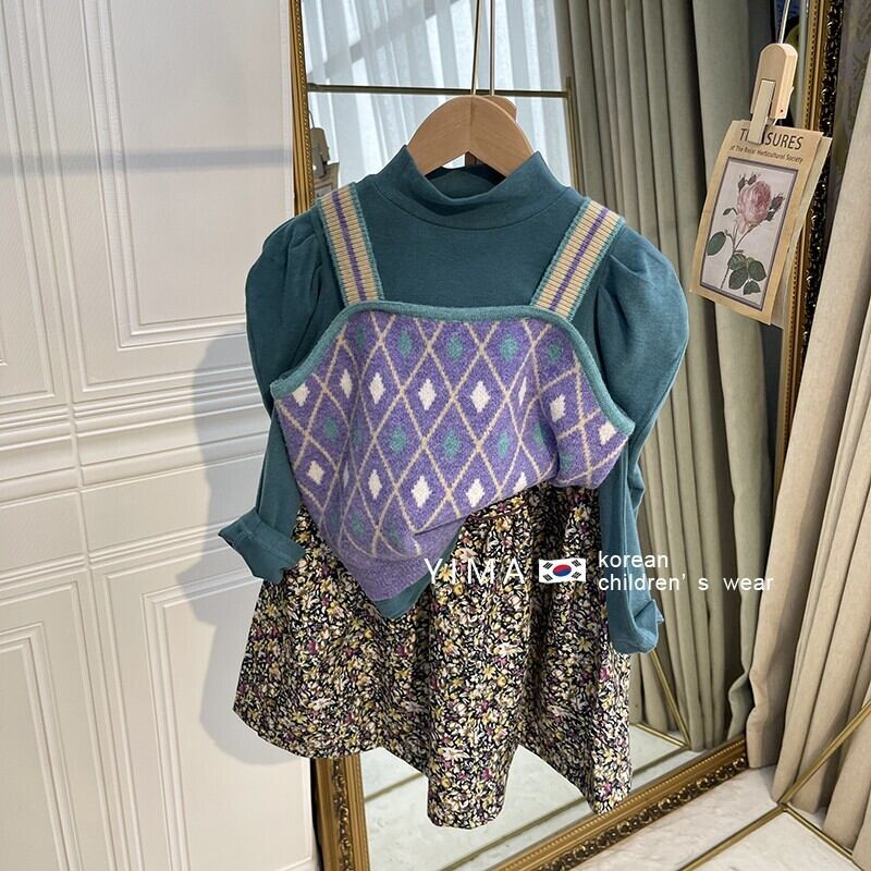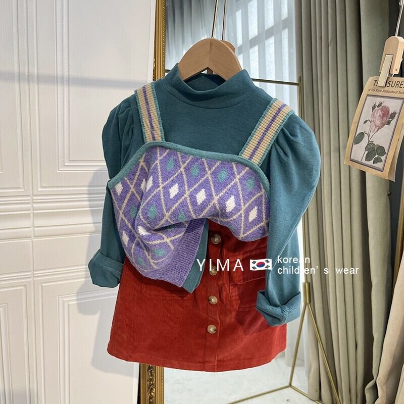 色:ライトブルーのボトミングシャツ,パープルニットベスト,赤いスカート,青いセーターベスト,パープルボトミングシャツ,緑のスカート
