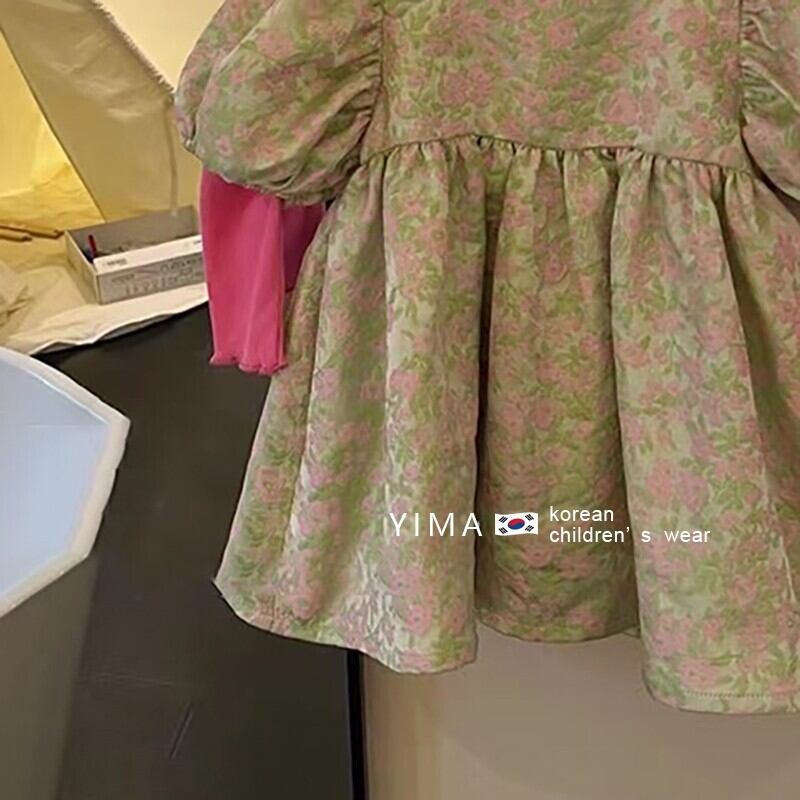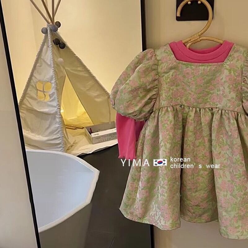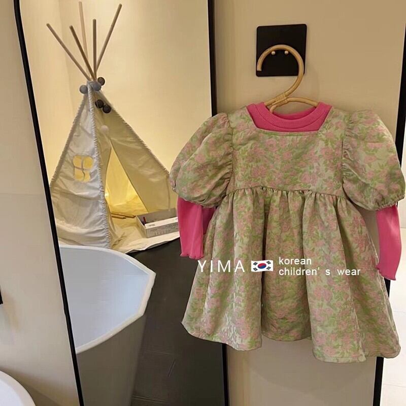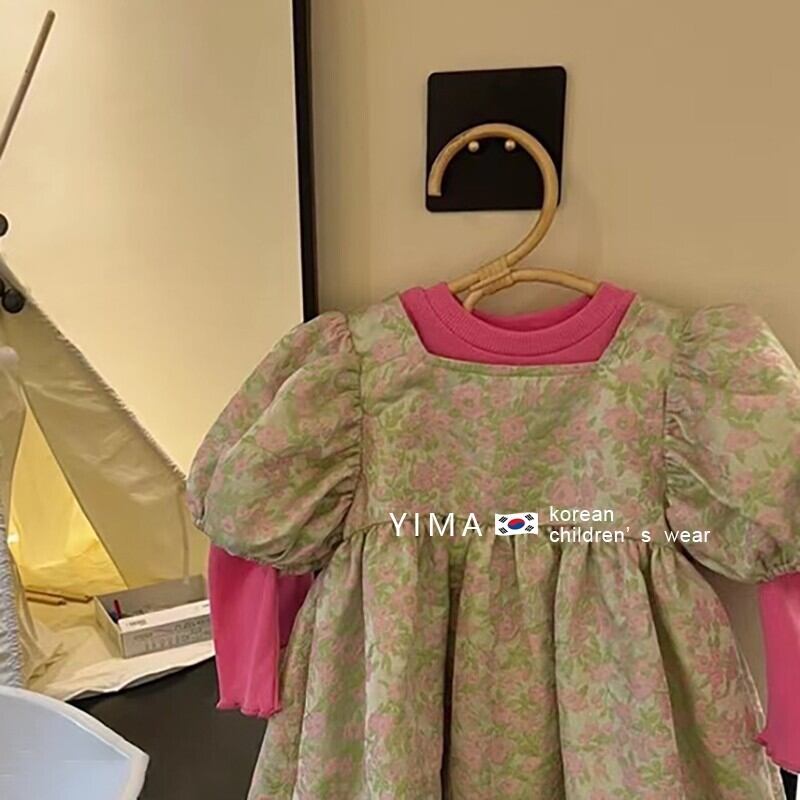 色:グリーンジャカードドレス,ピンクの長袖ベースレイヤー