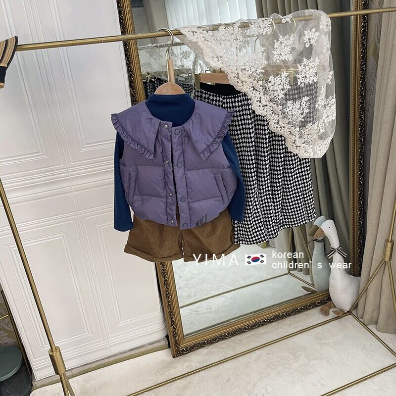 色:パープルベストベスト,ダークブルーのボトムスシャツ,ブラウンショートパンツ,黒のチェック柄パンツ